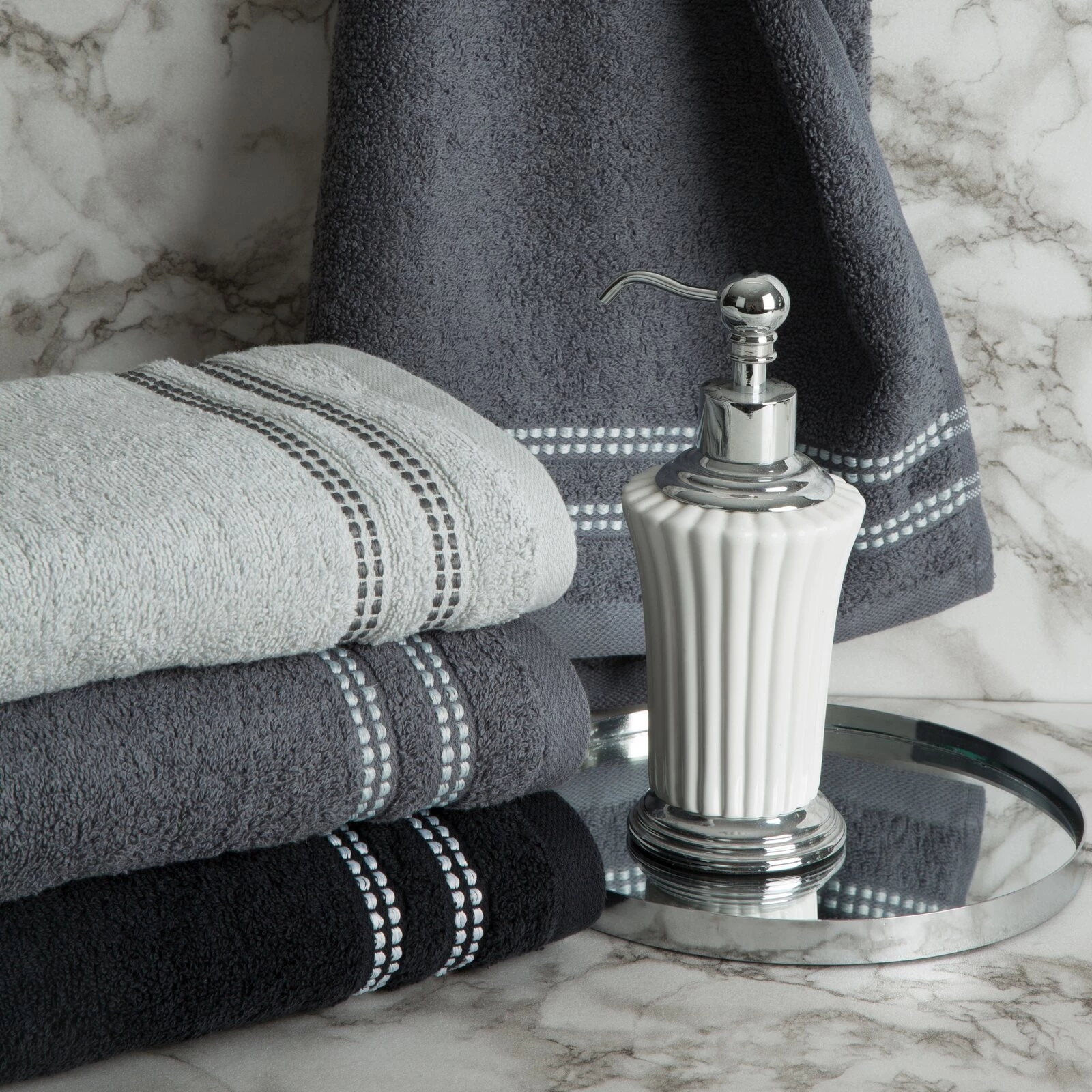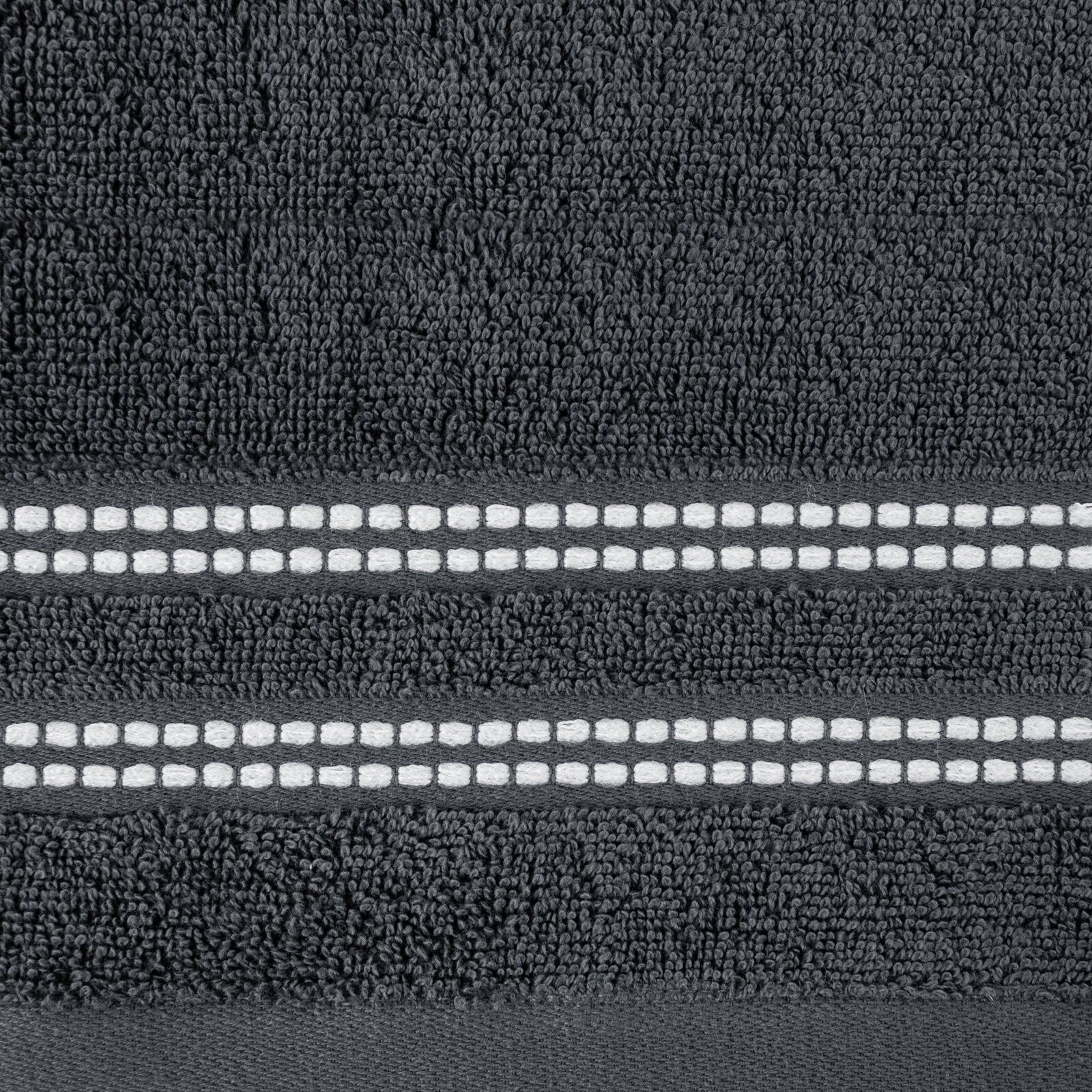 Klasyczny ręcznik kąpielowy z chłonnej tkaniny bawełnianej o splocie frotte. Minimalistyczna bordiura z weluru z dodatkiem lśniącej, metalicznej nici. szerokość: 50 cm, długość: 90 cm, kolor: grafitowy, Gramatura: 500 GSM, Skład: 100% bawełna; część ozdobna: 96% bawełna, 4% poliester