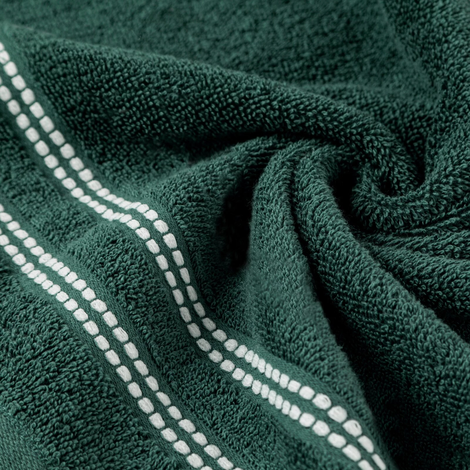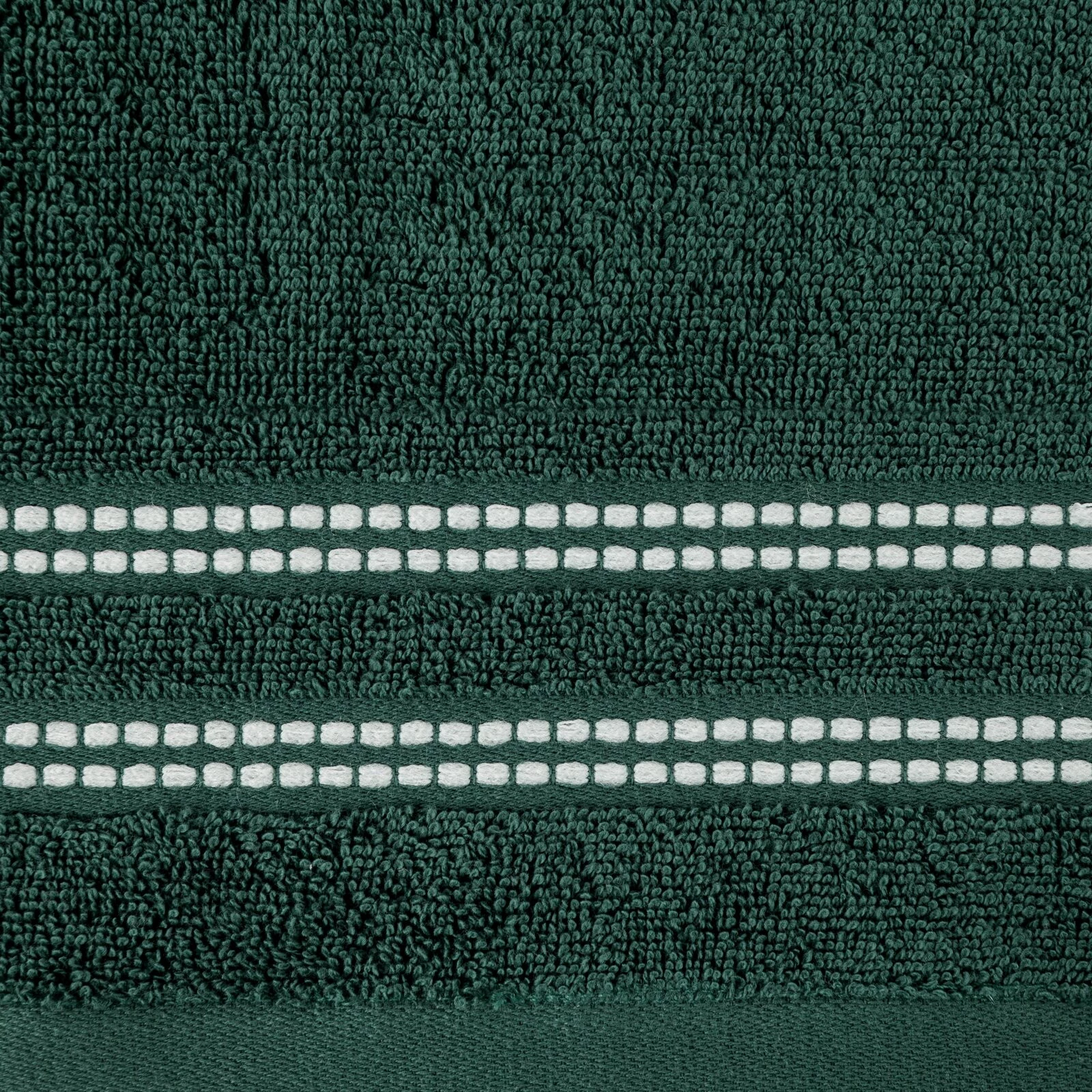 Klasyczny ręcznik kąpielowy z chłonnej tkaniny bawełnianej o splocie frotte. Minimalistyczna bordiura z weluru z dodatkiem lśniącej, metalicznej nici. szerokość: 30 cm, długość: 50 cm, kolor: zielony, Gramatura: 500 GSM, Skład: 100% bawełna; część ozdobna: 96% bawełna, 4% poliester