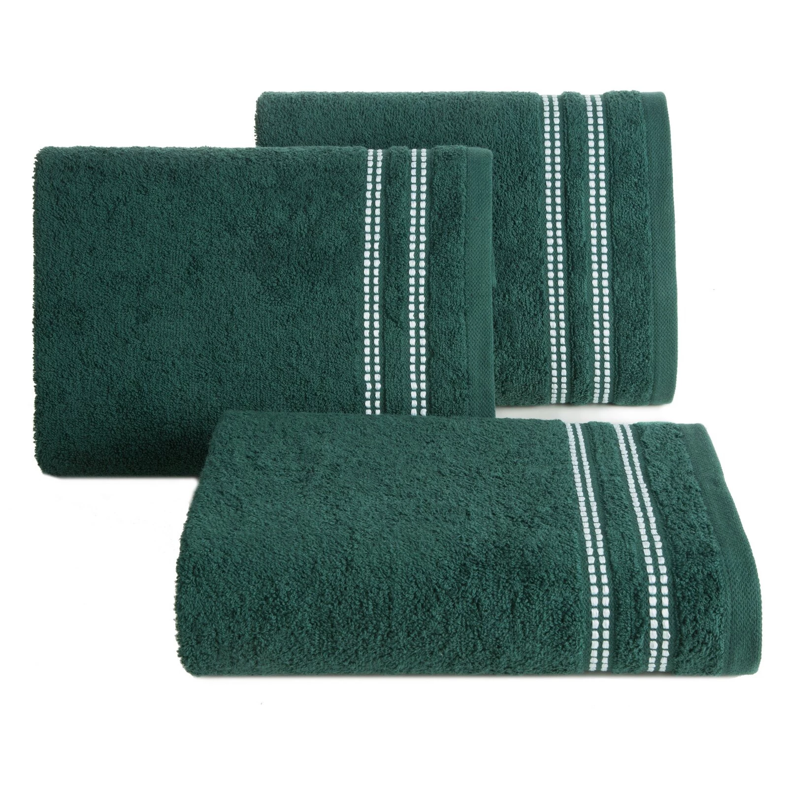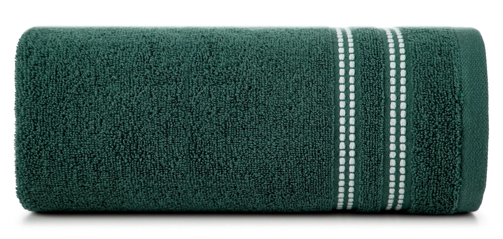 Klasyczny ręcznik kąpielowy z chłonnej tkaniny bawełnianej o splocie frotte. Minimalistyczna bordiura z weluru z dodatkiem lśniącej, metalicznej nici. szerokość: 50 cm, długość: 90 cm, kolor: zielony, Gramatura: 500 GSM, Skład: 100% bawełna; część ozdobna: 96% bawełna, 4% poliester