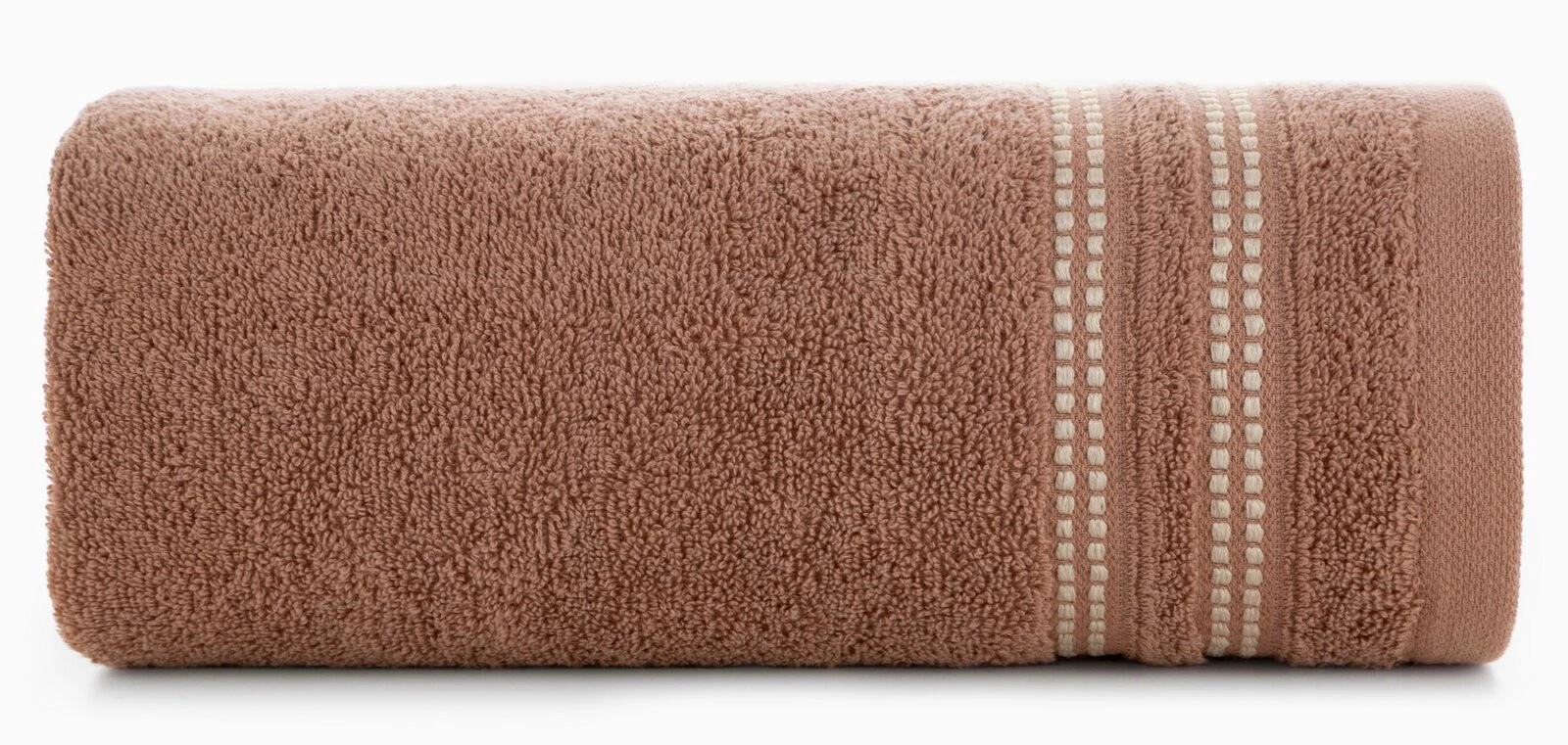 Klasyczny ręcznik kąpielowy z chłonnej tkaniny bawełnianej o splocie frotte. Minimalistyczna bordiura z weluru z dodatkiem lśniącej, metalicznej nici. szerokość: 50 cm, długość: 90 cm, kolor: ceglasty, Gramatura: 500 GSM, Skład: 100% bawełna; część ozdobna: 96% bawełna, 4% poliester
