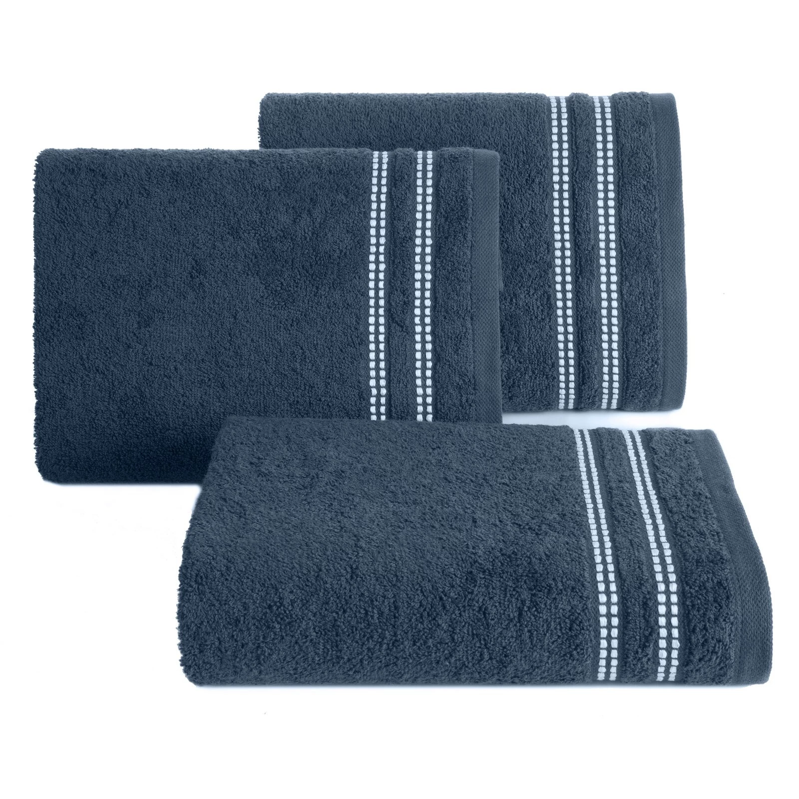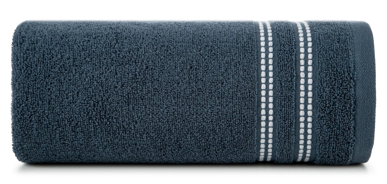 Klasyczny ręcznik kąpielowy z chłonnej tkaniny bawełnianej o splocie frotte. Minimalistyczna bordiura z weluru z dodatkiem lśniącej, metalicznej nici. szerokość: 30 cm, długość: 50 cm, kolor: granatowy, Gramatura: 500 GSM, Skład: 100% bawełna; część ozdobna: 96% bawełna, 4% poliester