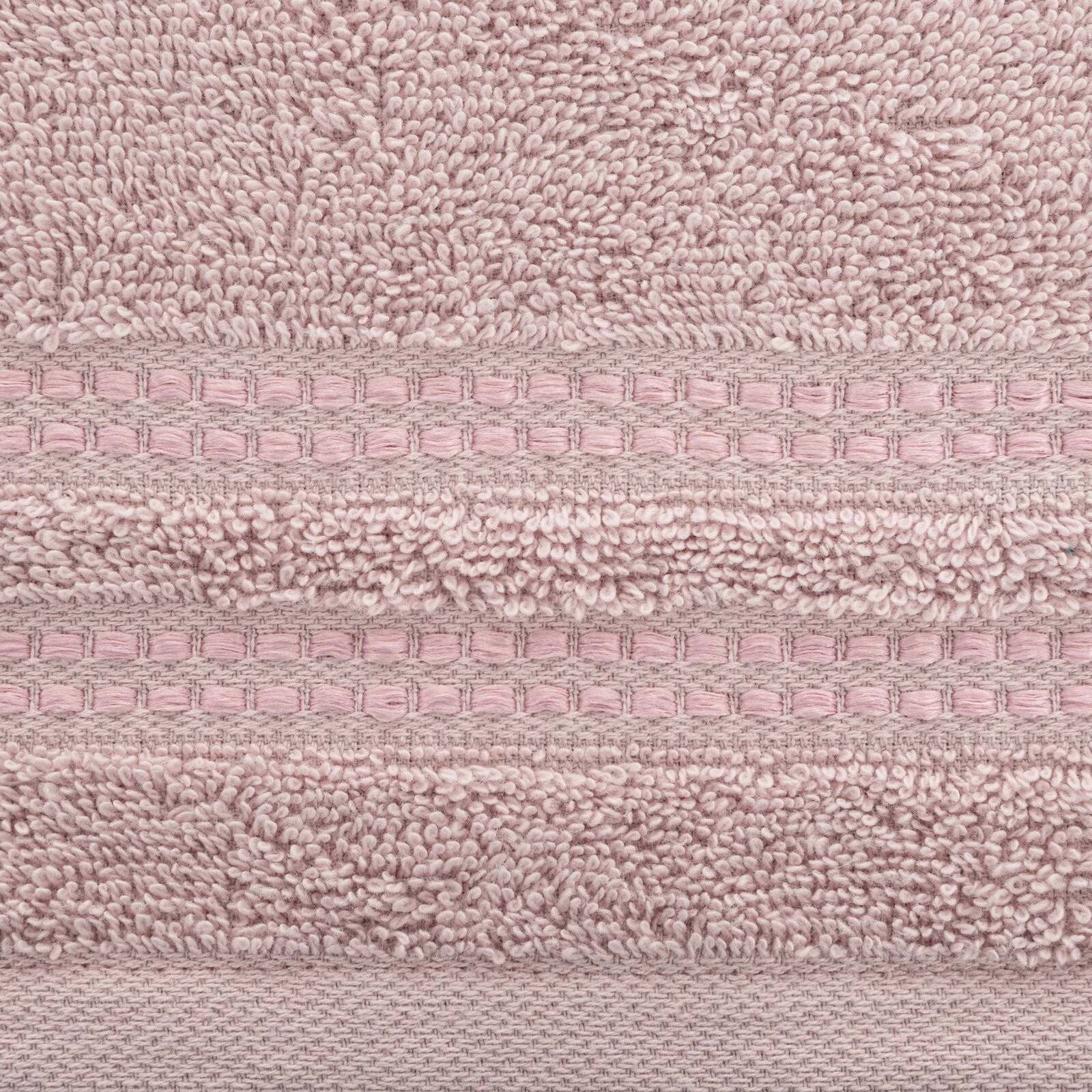 Klasyczny ręcznik kąpielowy z chłonnej tkaniny bawełnianej o splocie frotte. Minimalistyczna bordiura z weluru z dodatkiem lśniącej, metalicznej nici. szerokość: 30 cm, długość: 50 cm, kolor: pudrowy róż, Gramatura: 500 GSM, Skład: 100% bawełna; część ozdobna: 96% bawełna, 4% poliester