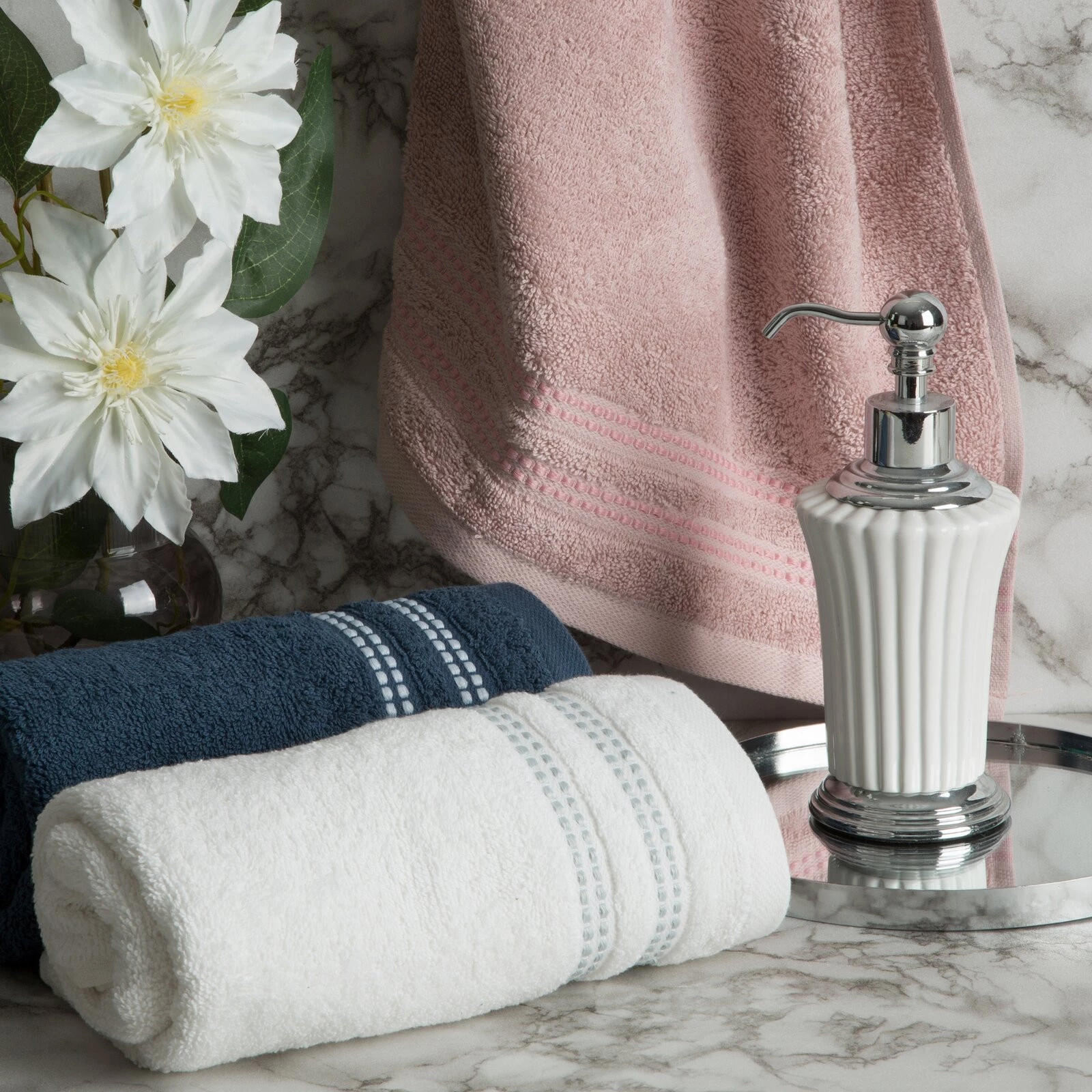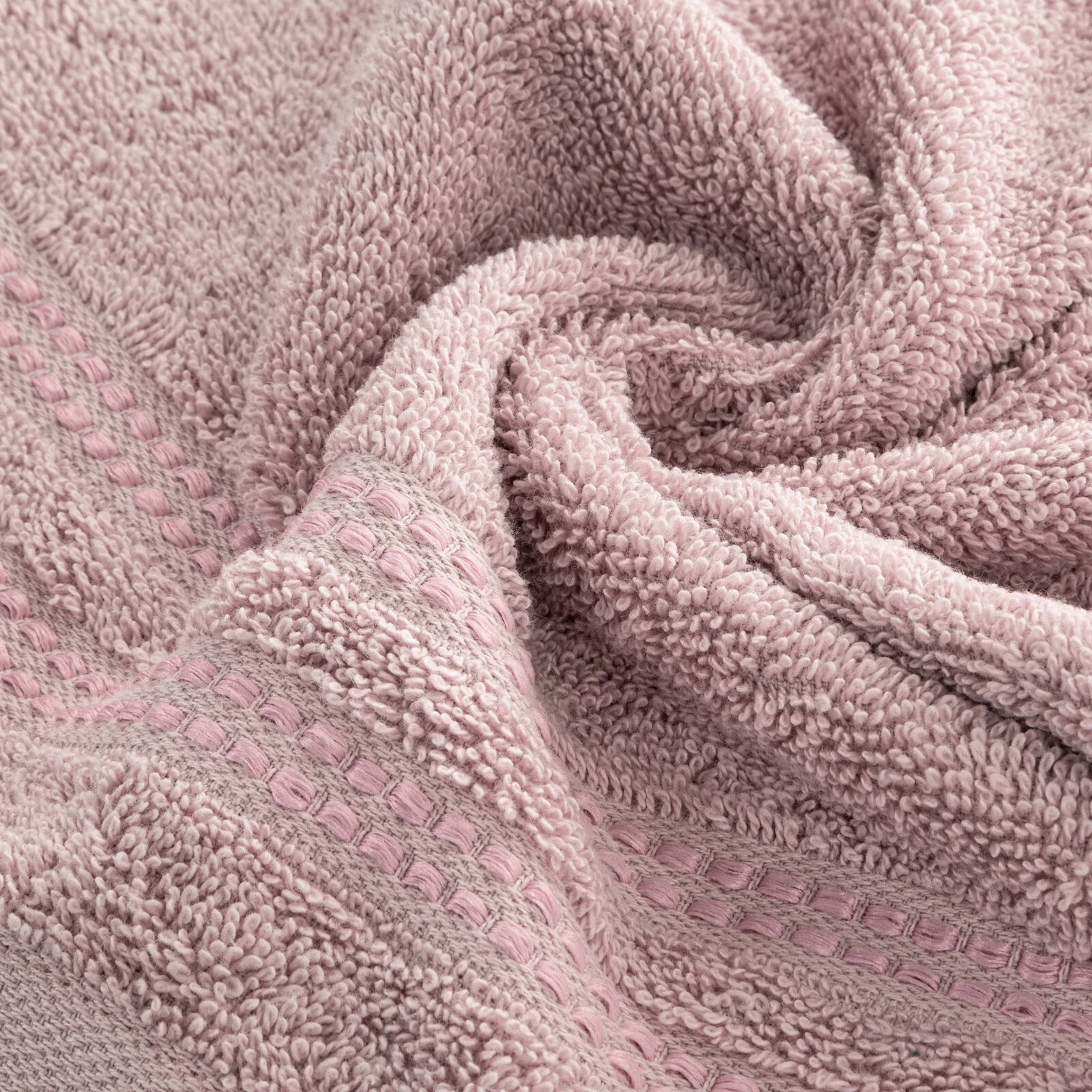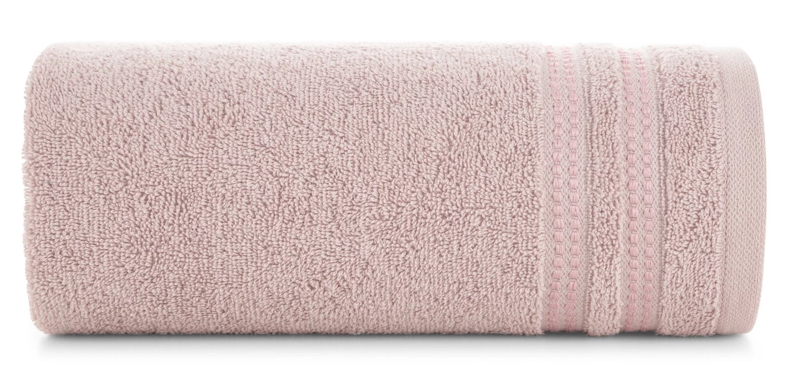 Klasyczny ręcznik kąpielowy z chłonnej tkaniny bawełnianej o splocie frotte. Minimalistyczna bordiura z weluru z dodatkiem lśniącej, metalicznej nici. szerokość: 50 cm, długość: 90 cm, kolor: pudrowy róż, Gramatura: 500 GSM, Skład: 100% bawełna; część ozdobna: 96% bawełna, 4% poliester