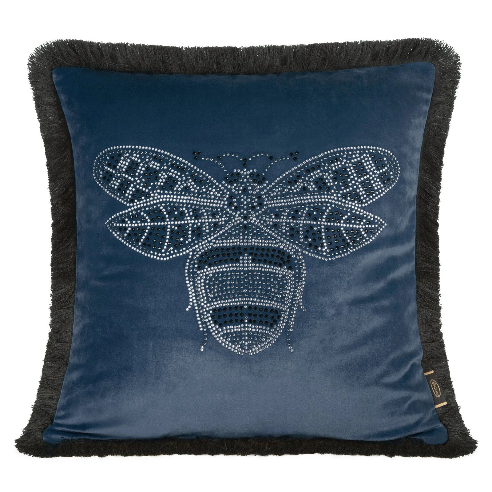 Welwetowa poszewka z frędzlami zdobiona cyrkoniami szerokość: 45 cm, długość: 45 cm, kolor: granatowy, Gramatura: 250 GSM, Skład: 100% poliester