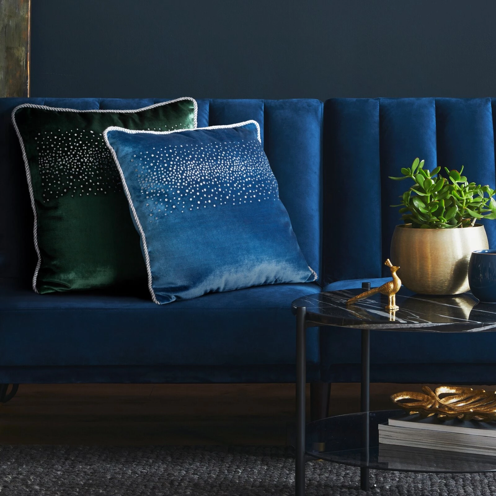 Poszewka velvetowa z cyrkoniami i ozdobną lamówką szerokość: 45 cm, długość: 45 cm, kolor: granatowy, Gramatura: 400 GSM, Skład: 100% poliester