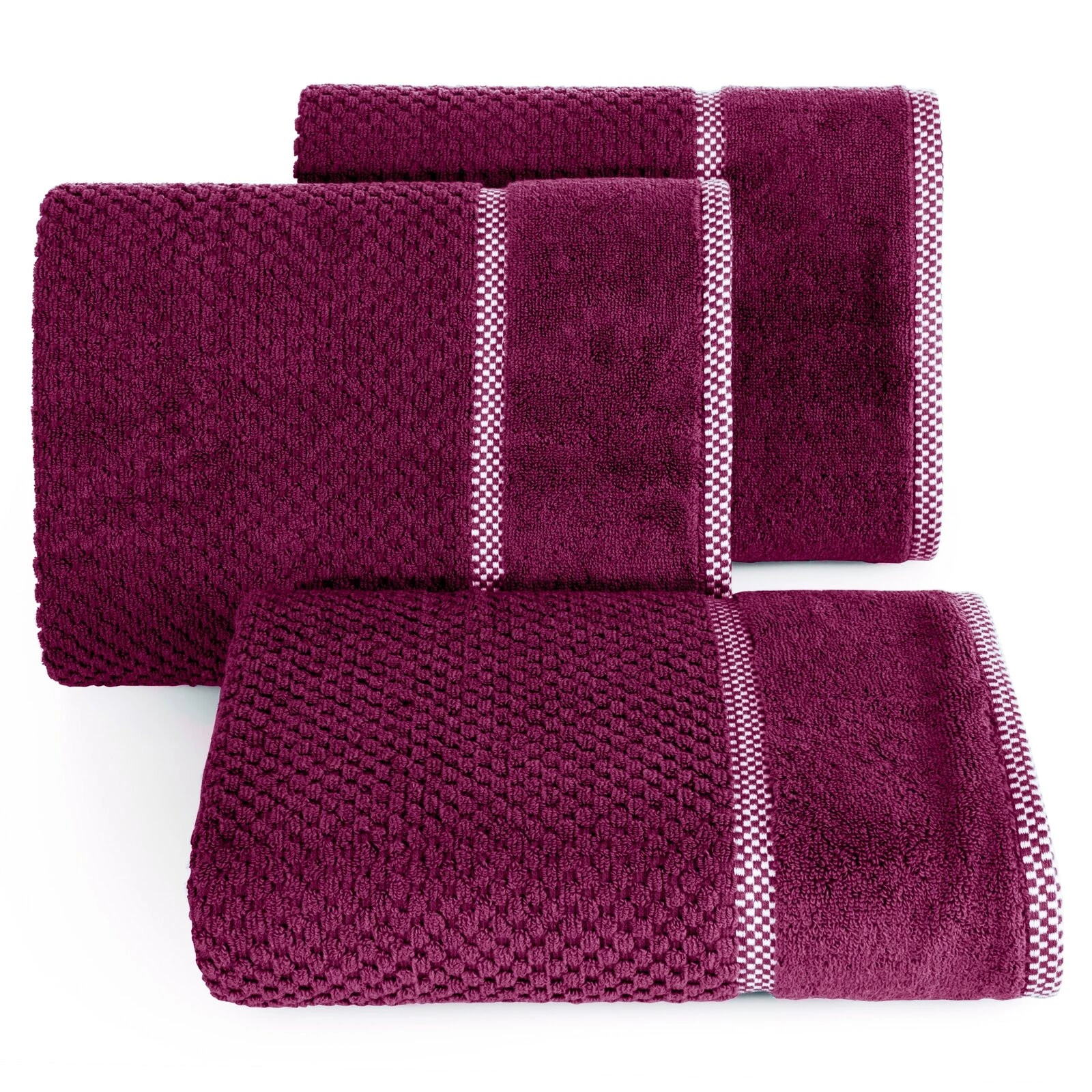 Bardzo chłonny ręcznik z miękkiej bawełny frotte z delikatnym tłoczeniem krateczki i bordiurą o tym samym, wyraźniejszym wzorze. Bardzo chłonny, łatwy w praniu. szerokość: 50 cm, długość: 90 cm, kolor: amarantowy, Gramatura: 540 GSM, Skład: 100% bawełna; część ozdobna: 69% bawełna, 31% poliester