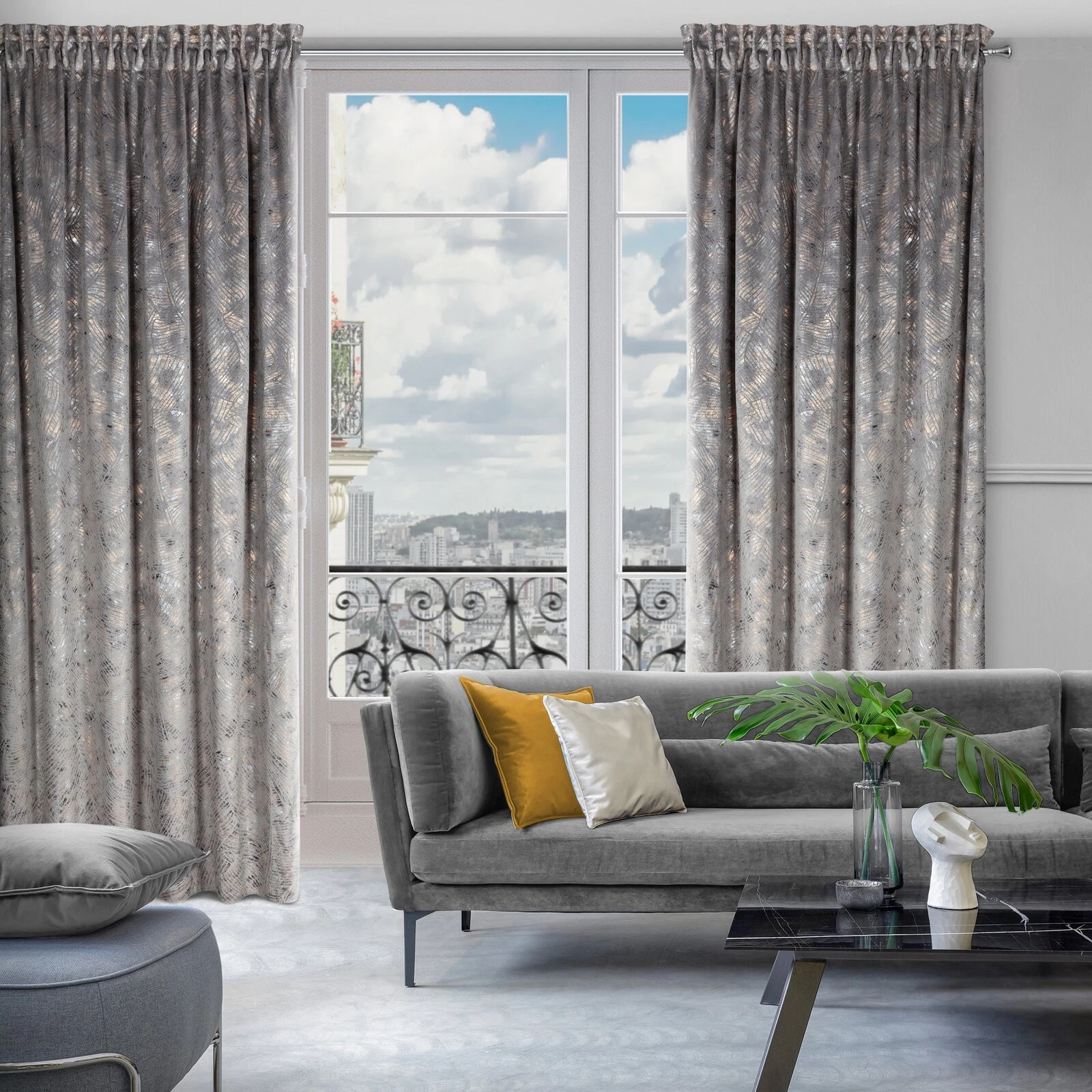 - Zasłona welwetowa z cieniowanym błyszczącym nadrukiem szerokość: 135 cm, długość: 270 cm, kolor: stalowy, Gramatura: 200 GSM, Skład: 100% poliester