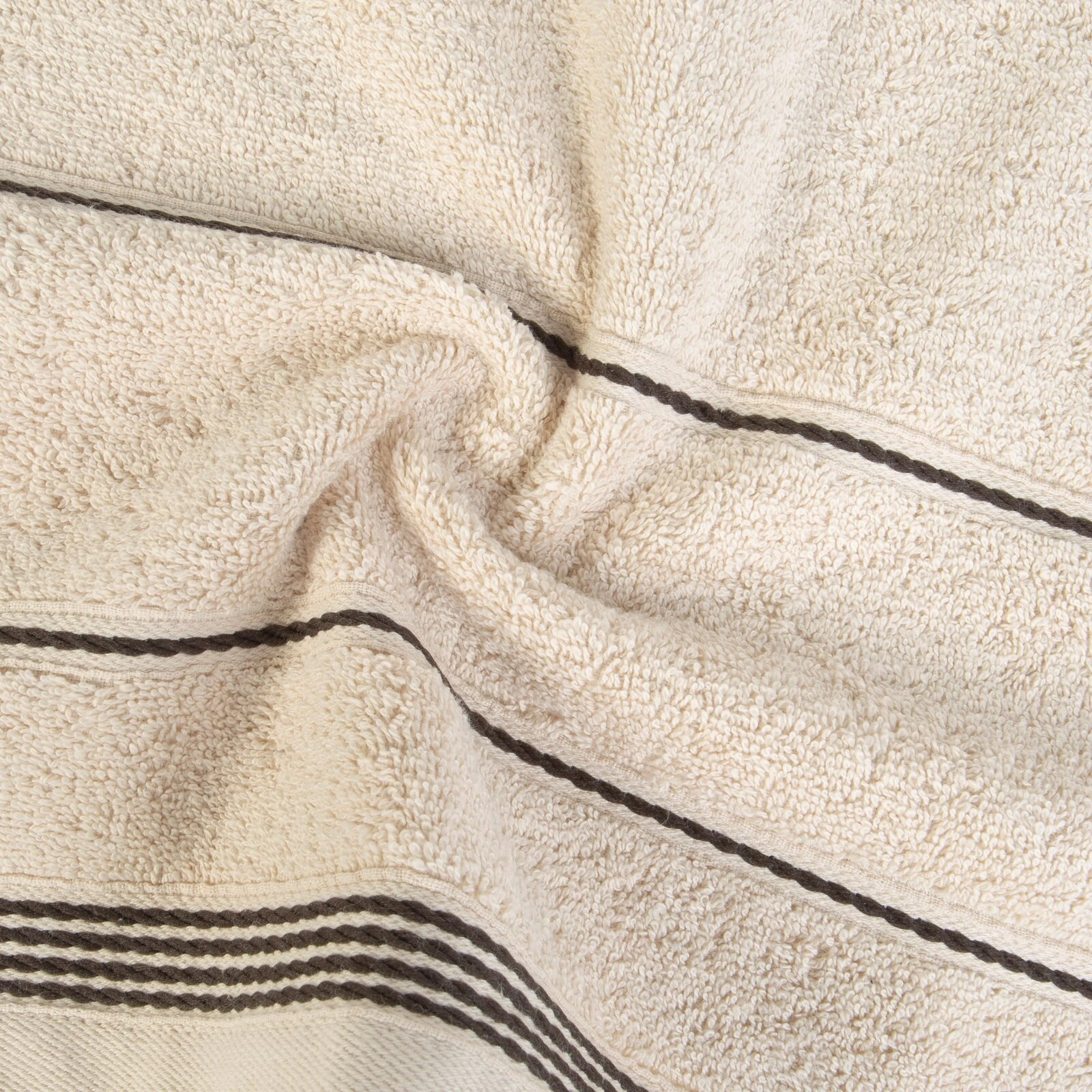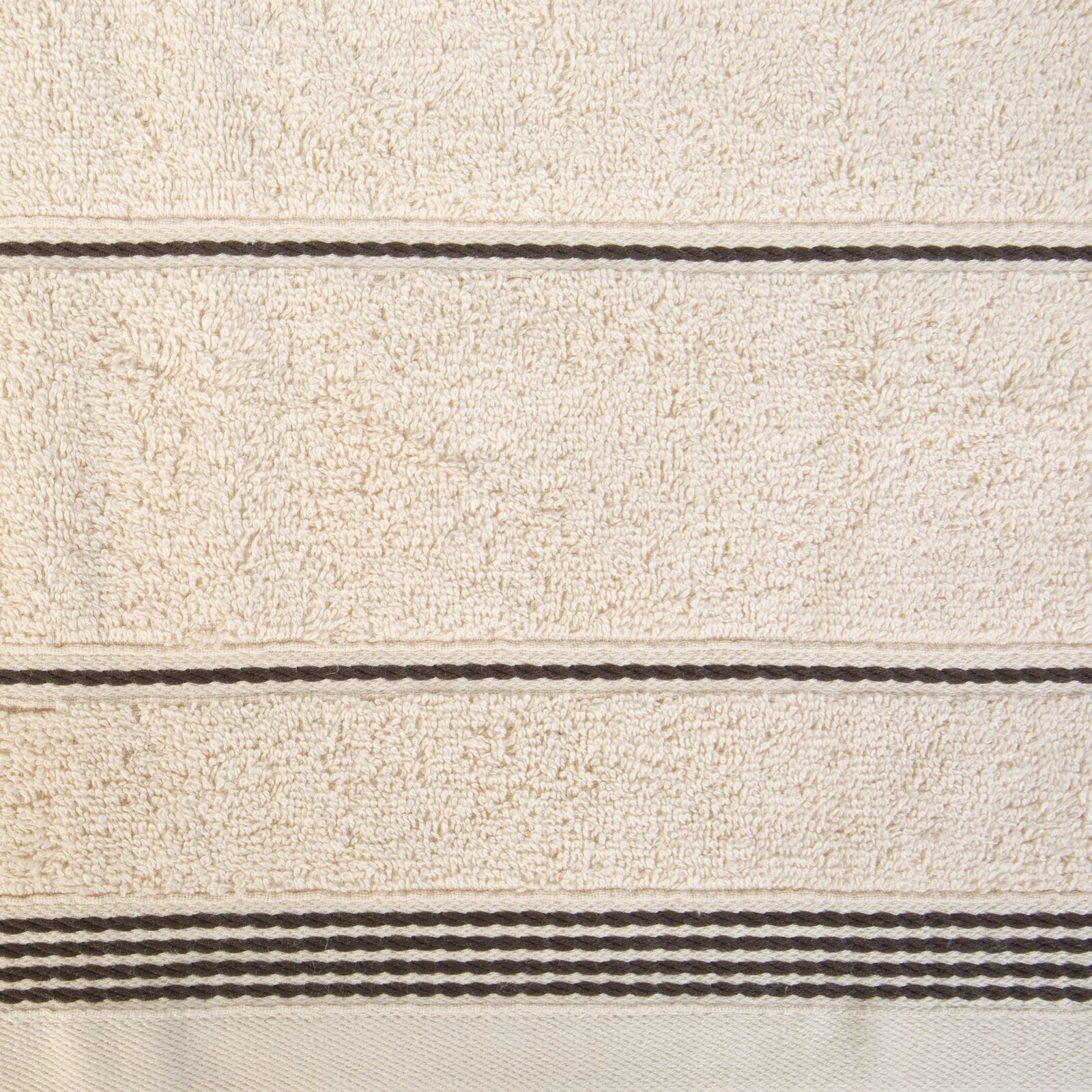 Miękki, klasyczny ręcznik kąpielowy z chłonnej tkaniny bawełnianej frotte zdobiony subtelną, elegancką bordiurą. Jednokolorowy ręcznik nie farbuje. szerokość: 30 cm, długość: 50 cm, kolor: beżowy, Gramatura: 500 GSM, Skład: 100% bawełna; część ozdobna: 60% bawełna, 40% poliester