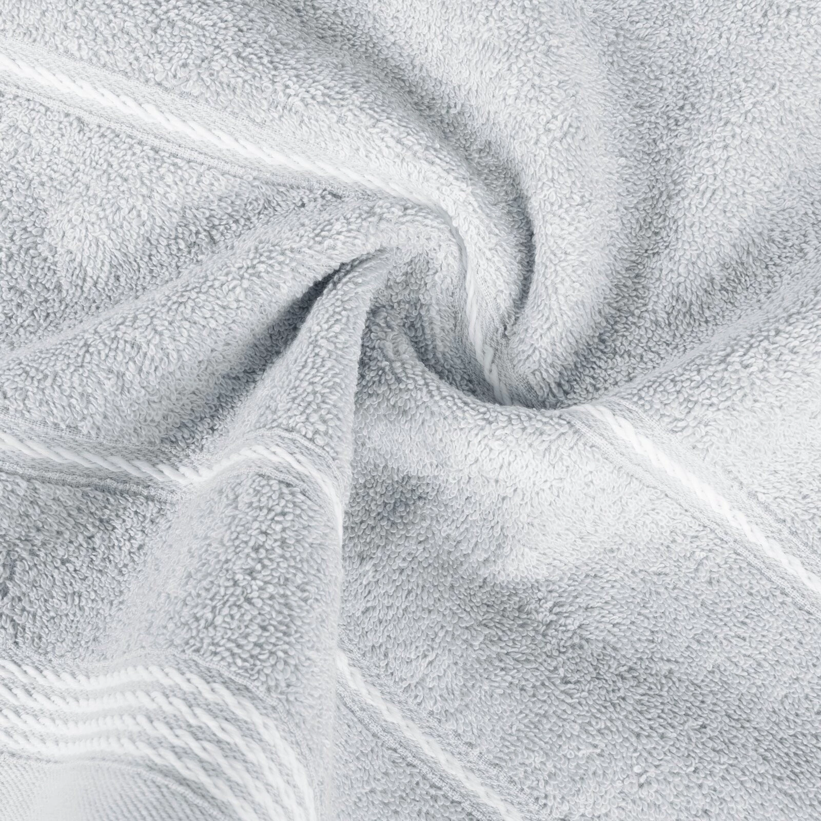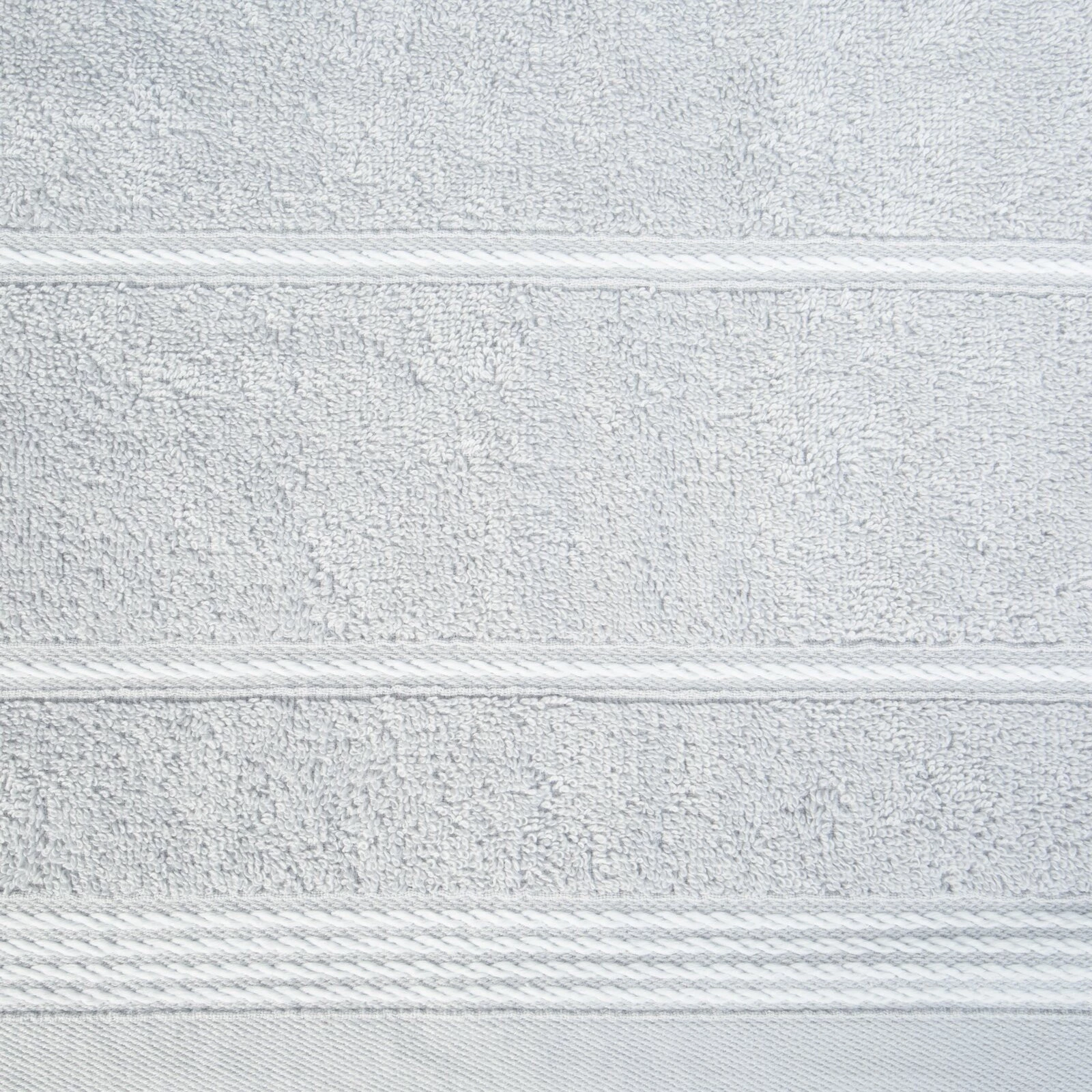 Miękki, klasyczny ręcznik kąpielowy z chłonnej tkaniny bawełnianej frotte zdobiony subtelną, elegancką bordiurą. Jednokolorowy ręcznik nie farbuje. szerokość: 30 cm, długość: 50 cm, kolor: jasnopopielaty, Gramatura: 500 GSM, Skład: 100% bawełna; część ozdobna: 60% bawełna, 40% poliester