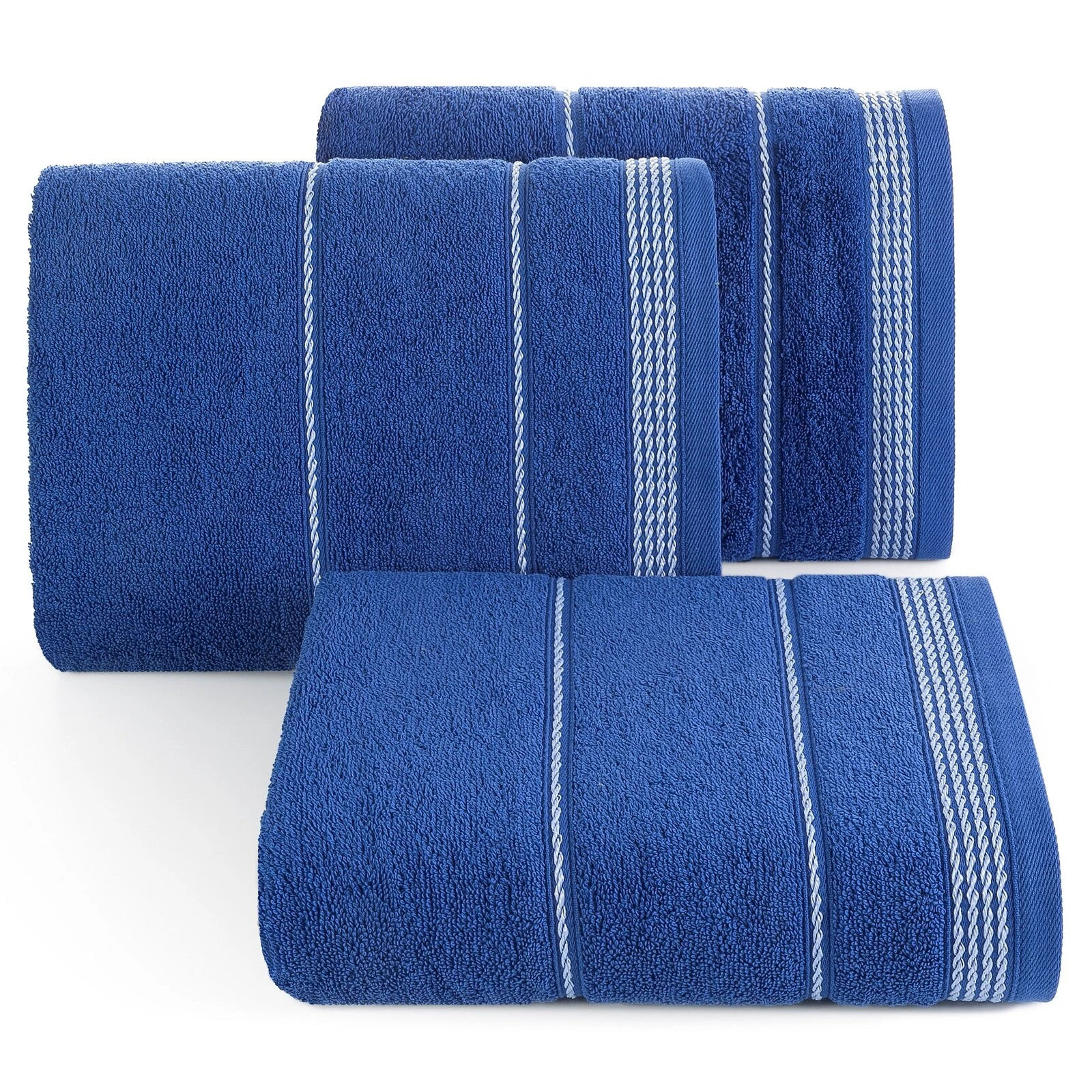 Miękki, klasyczny ręcznik kąpielowy z chłonnej tkaniny bawełnianej frotte zdobiony subtelną, elegancką bordiurą. Jednokolorowy ręcznik nie farbuje. szerokość: 50 cm, długość: 90 cm, kolor: granatowy, Gramatura: 500 GSM, Skład: 100% bawełna; część ozdobna: 60% bawełna, 40% poliester