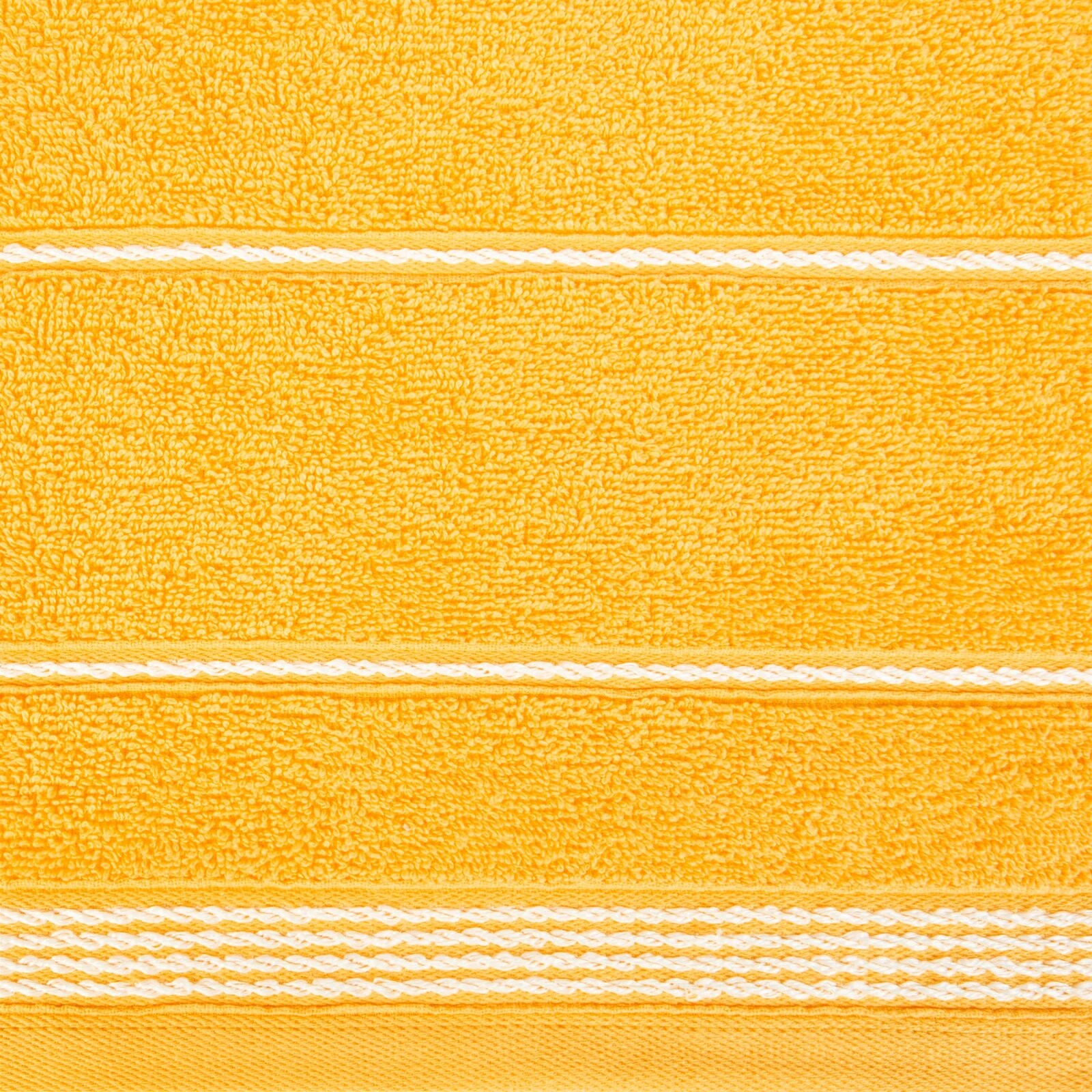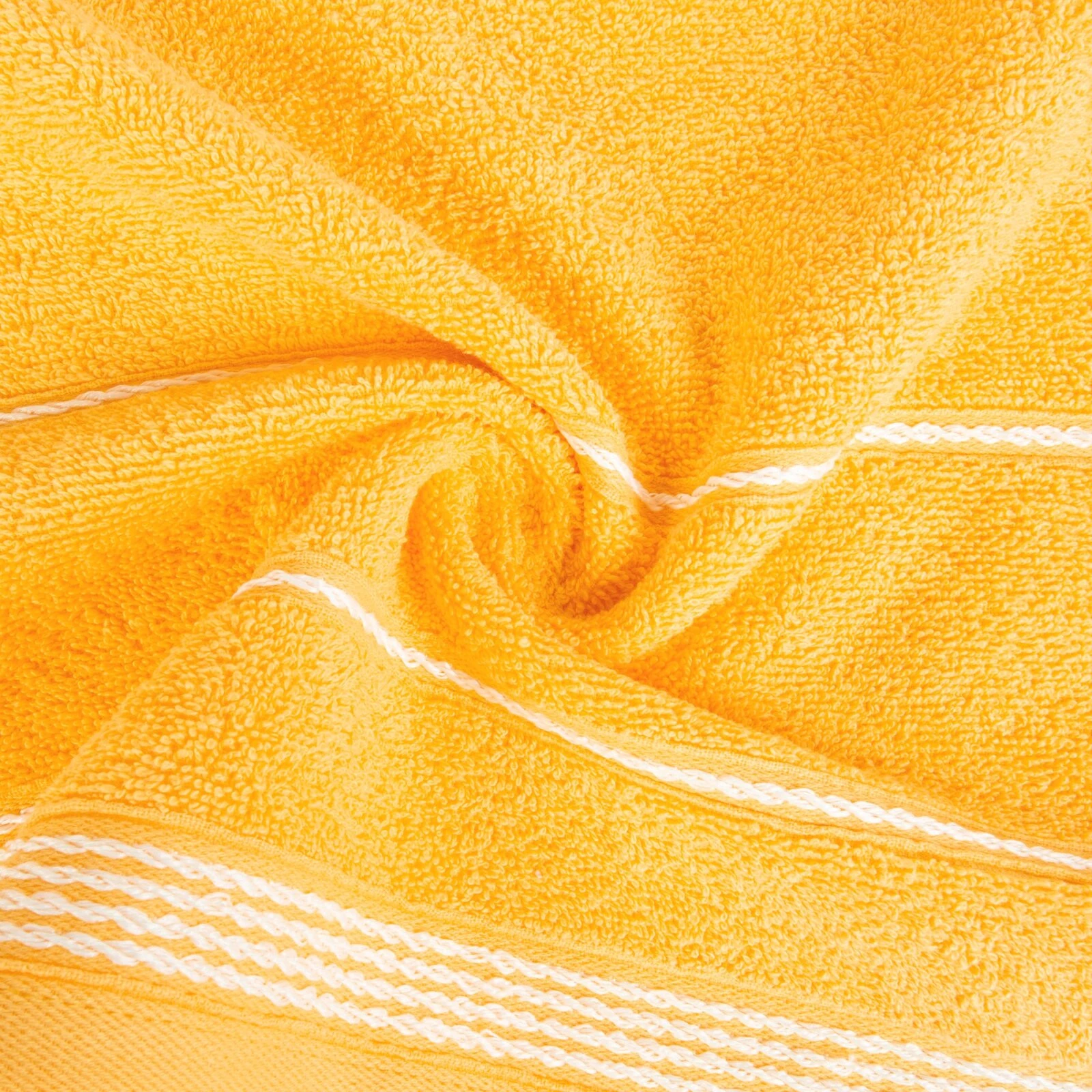 Miękki, klasyczny ręcznik kąpielowy z chłonnej tkaniny bawełnianej frotte zdobiony subtelną, elegancką bordiurą. Jednokolorowy ręcznik nie farbuje. szerokość: 30 cm, długość: 50 cm, kolor: żółty, Gramatura: 500 GSM, Skład: 100% bawełna; część ozdobna: 60% bawełna, 40% poliester