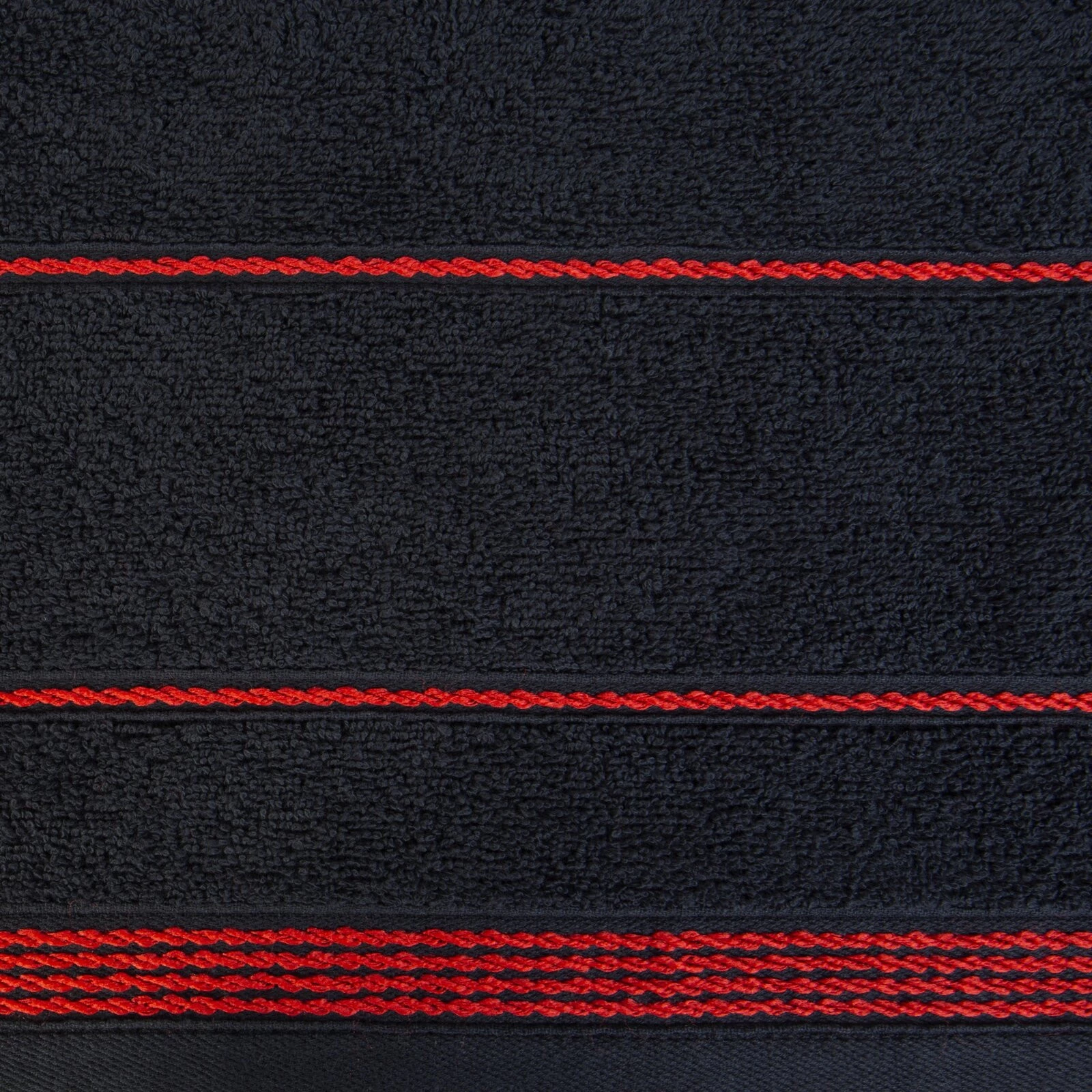 Miękki, klasyczny ręcznik kąpielowy z chłonnej tkaniny bawełnianej frotte zdobiony subtelną, elegancką bordiurą. Jednokolorowy ręcznik nie farbuje. szerokość: 50 cm, długość: 90 cm, kolor: czarny, Gramatura: 500 GSM, Skład: 100% bawełna; część ozdobna: 60% bawełna, 40% poliester