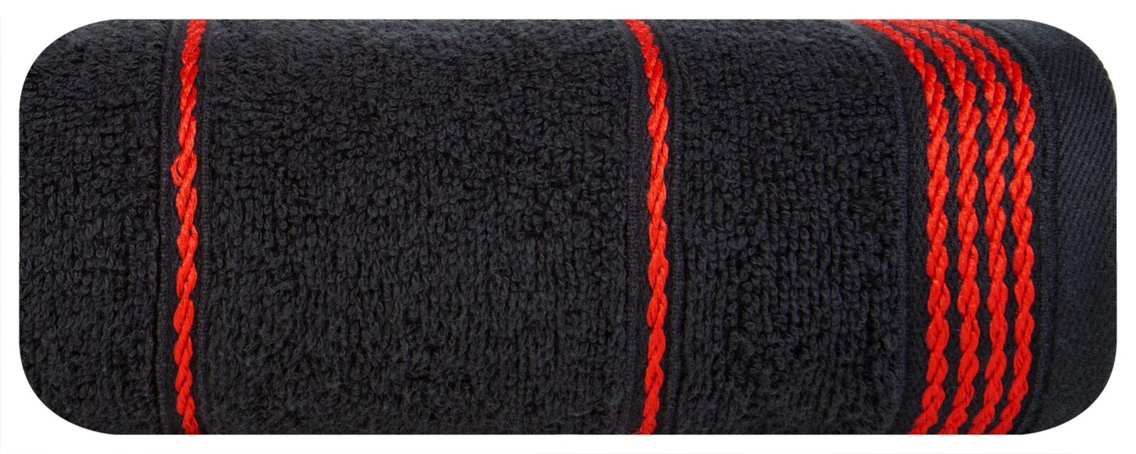 Miękki, klasyczny ręcznik kąpielowy z chłonnej tkaniny bawełnianej frotte zdobiony subtelną, elegancką bordiurą. Jednokolorowy ręcznik nie farbuje. szerokość: 70 cm, długość: 140 cm, kolor: czarny, Gramatura: 500 GSM, Skład: 100% bawełna; część ozdobna: 60% bawełna, 40% poliester