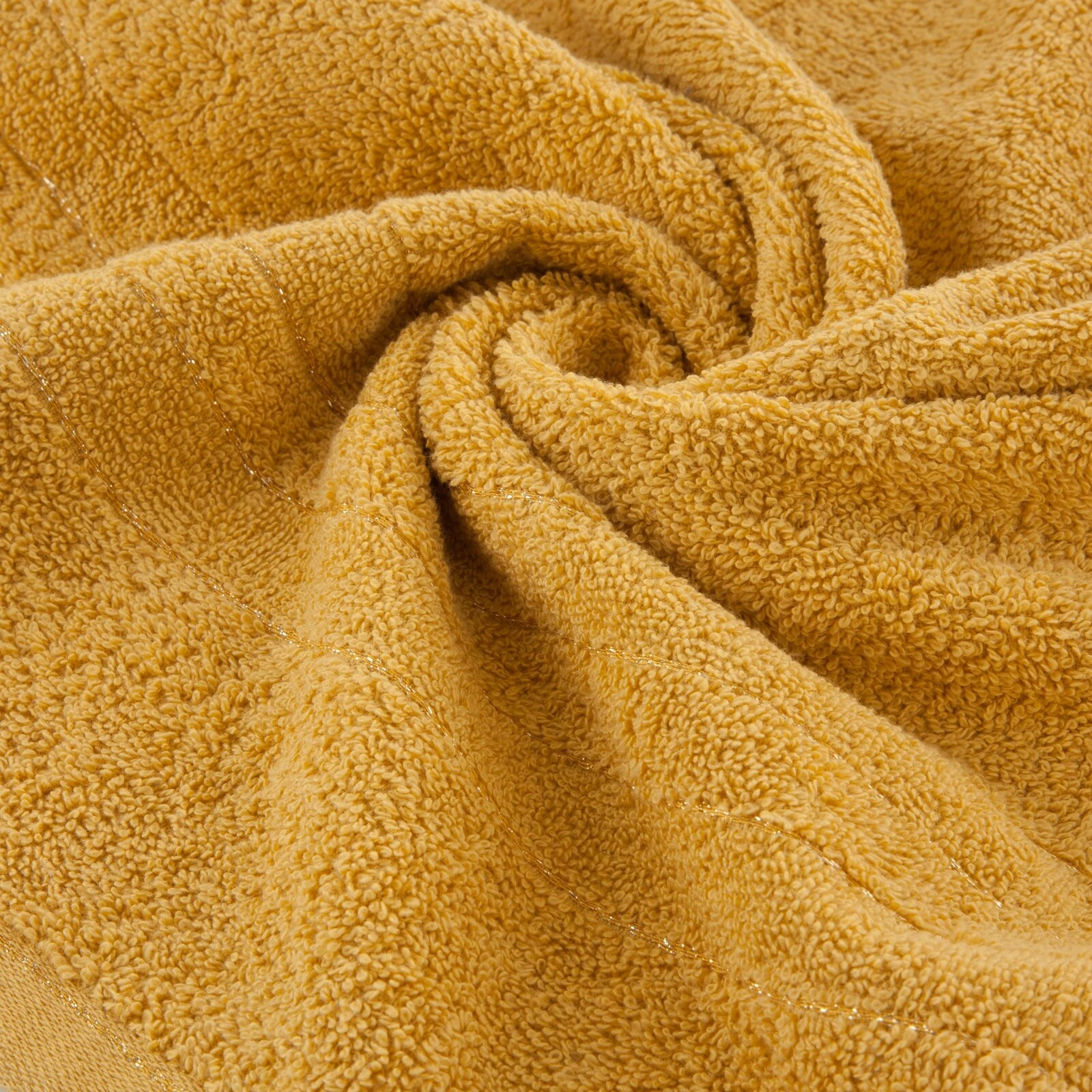 Ręcznik bawełniany z bordiurą zdobioną błyszczącą nicią szerokość: 50 cm, długość: 90 cm, kolor: musztardowy, Gramatura: 500 GSM, Skład: 100% bawełna; część ozdobna: 95% bawełna, 5% poliester