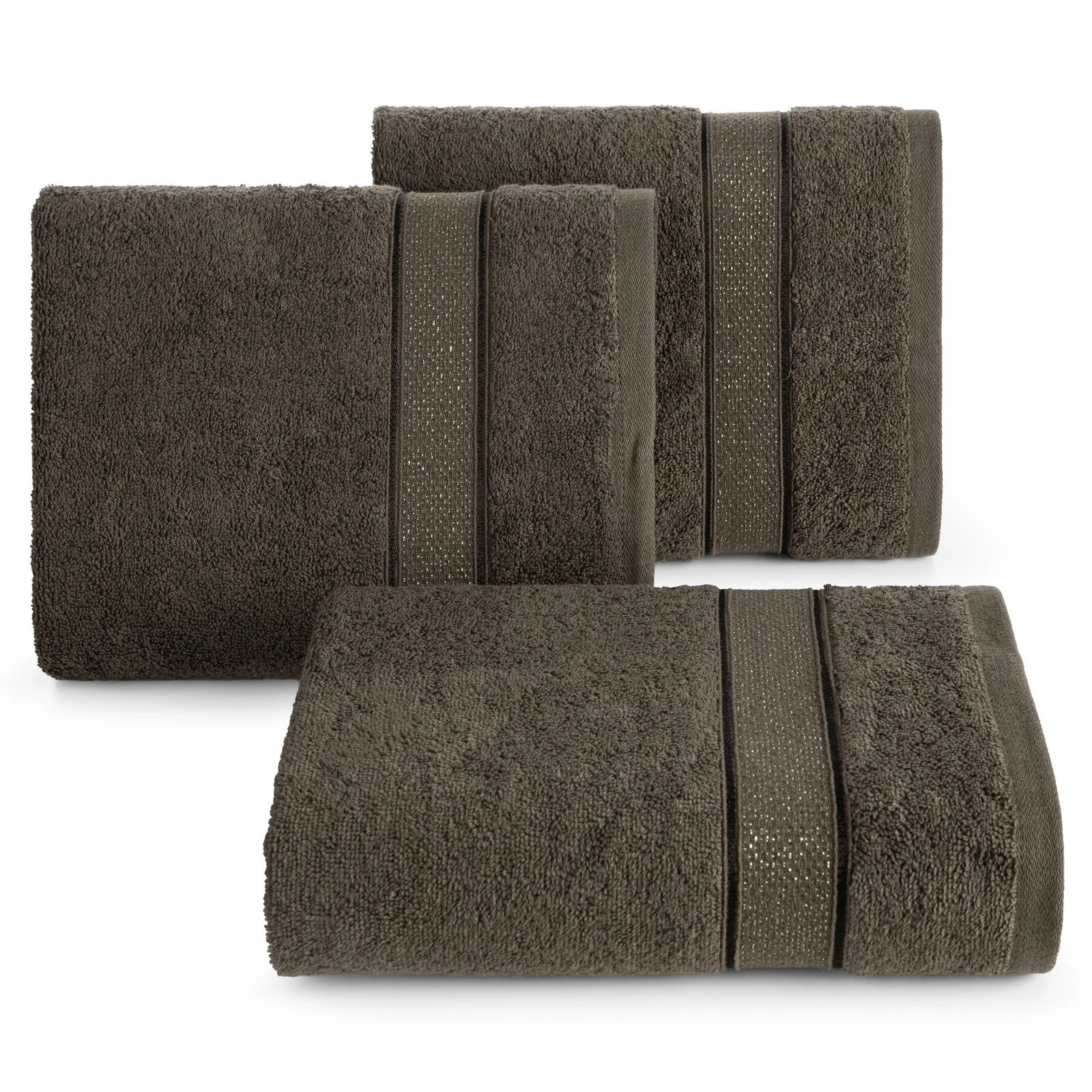 Ręcznik bawełniany z błyszczącą nicią szerokość: 50 cm, długość: 90 cm, kolor: ciemnobrązowy, Gramatura: 500 GSM, Skład: 100% bawełna; część ozdobna: 95% bawełna, 5% poliester