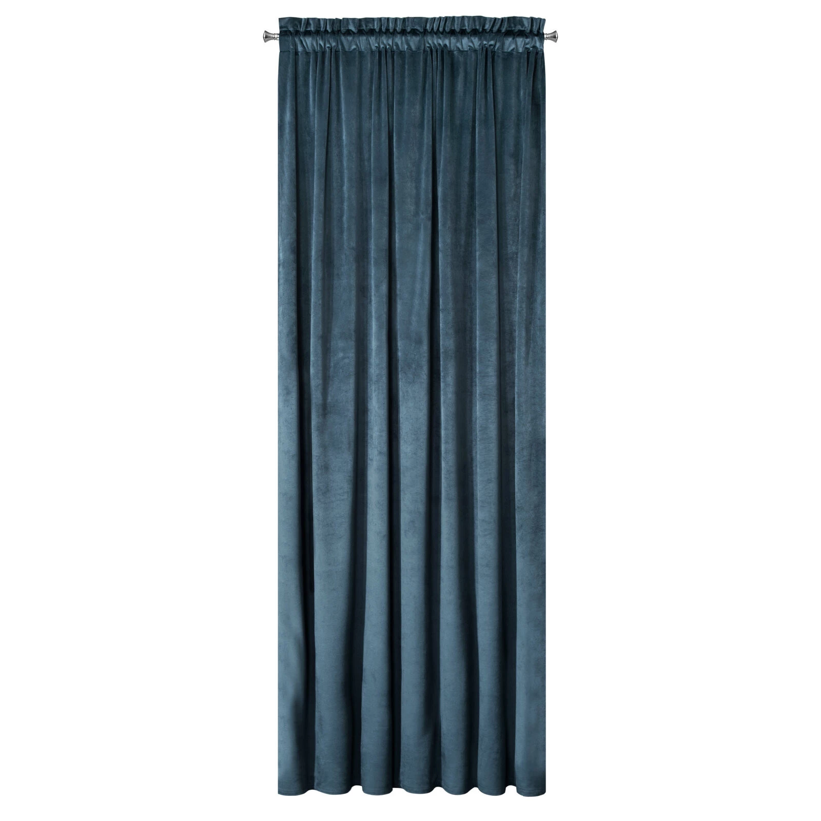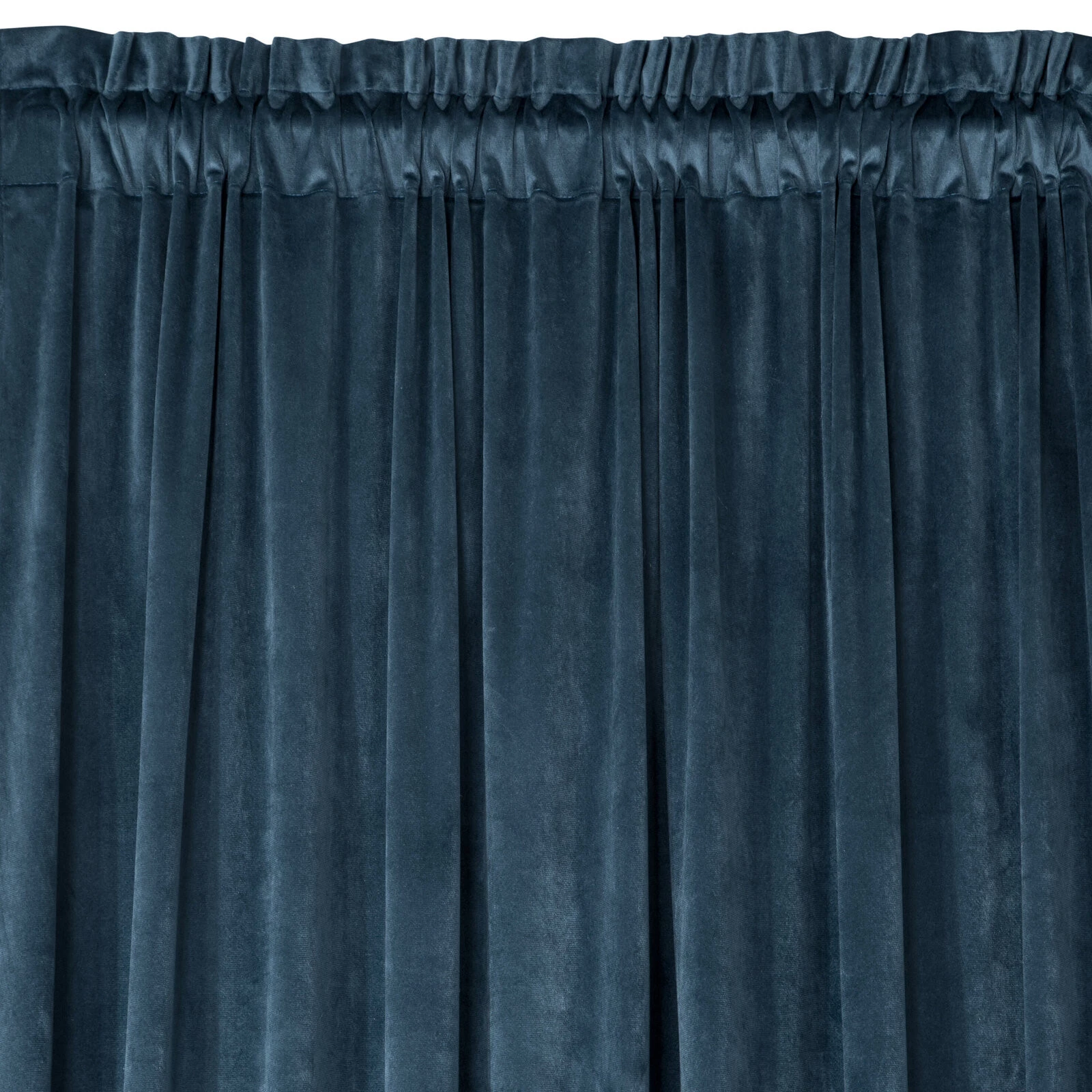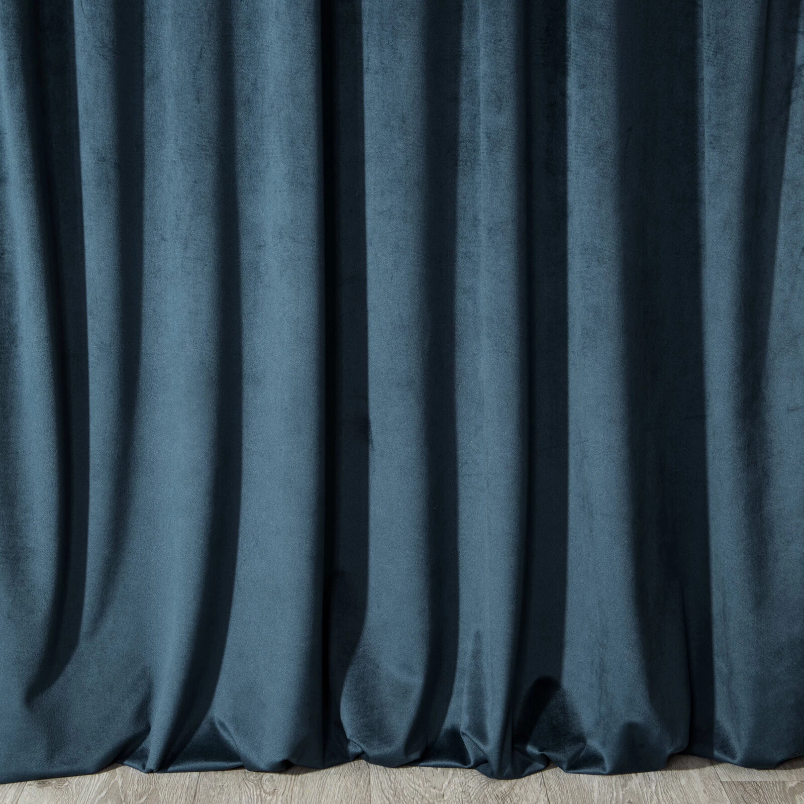 Miękka zasłona gotowa z jednokolorowego aksamitu o charakterystycznym dla welwetu połysku. Mięsista tkanina daje wysoki stopień zaciemnienia wnętrza. szerokość: 140 cm, długość: 300 cm, kolor: granatowy, Gramatura: 215 GSM, Skład: 100% poliester