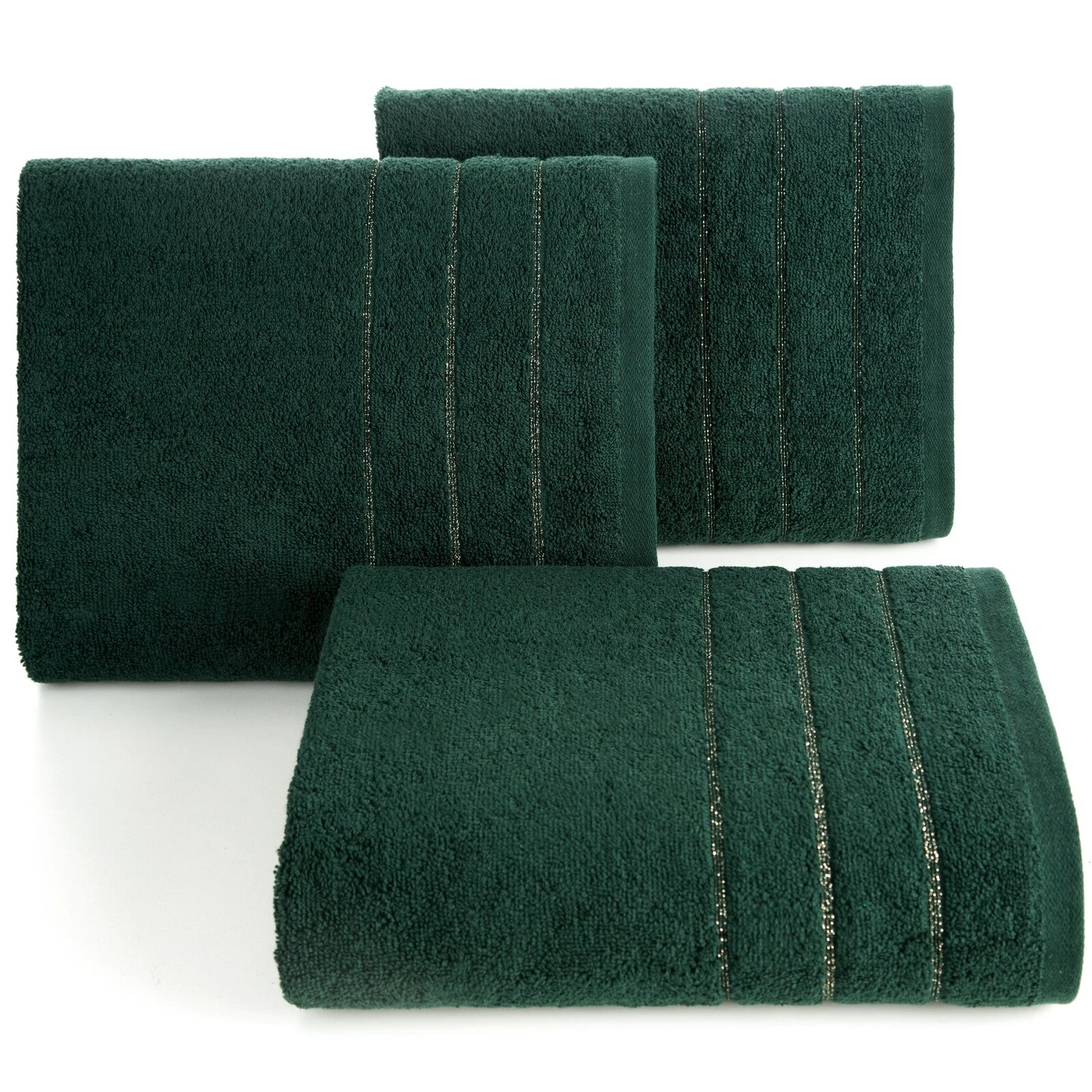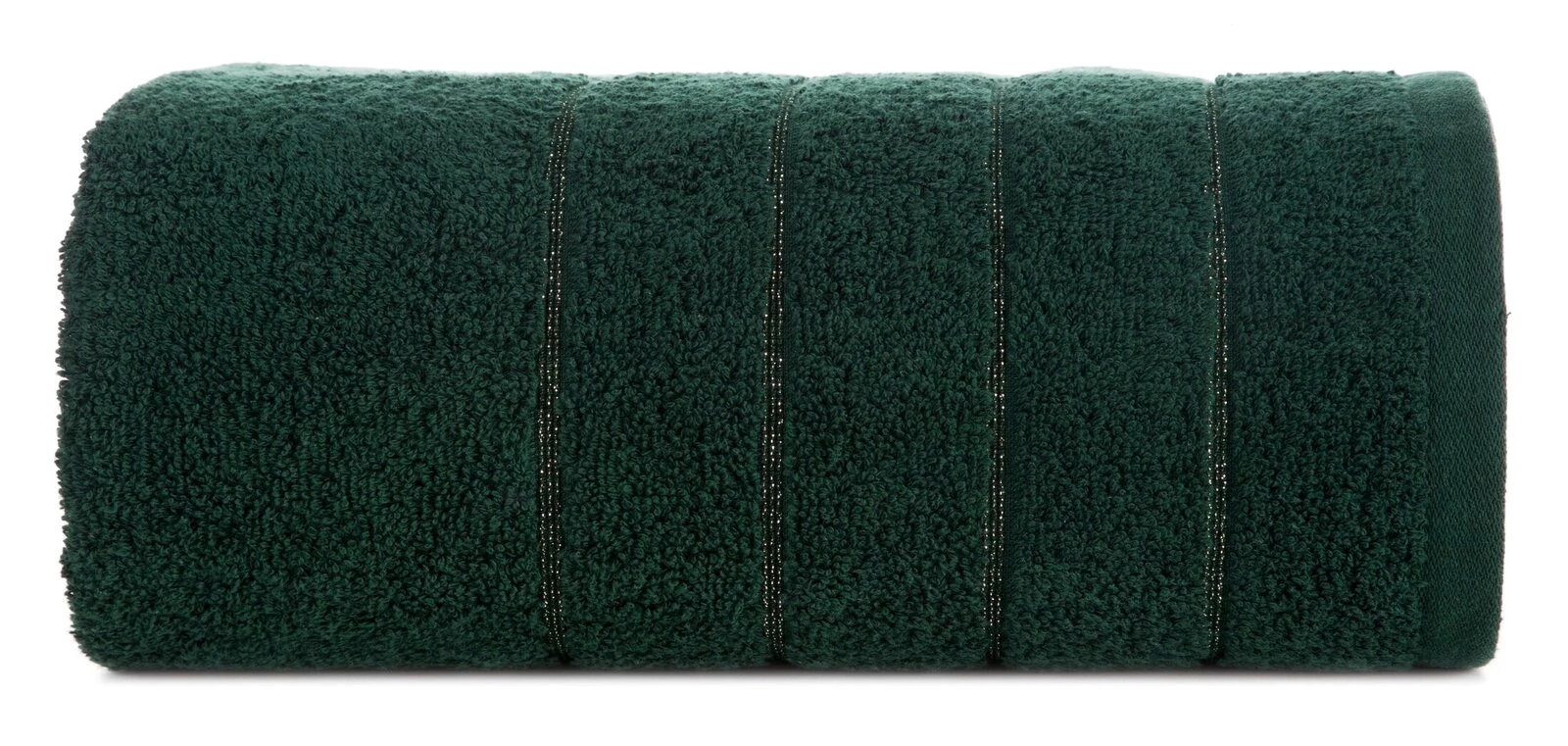 Ręcznik bawełniany zdobiony błyszczącą nicią szerokość: 50 cm, długość: 90 cm, kolor: ciemnozielony, Gramatura: 500 GSM, Skład: 100% bawełna; część ozdobna: 95% bawełna, 5% poliester