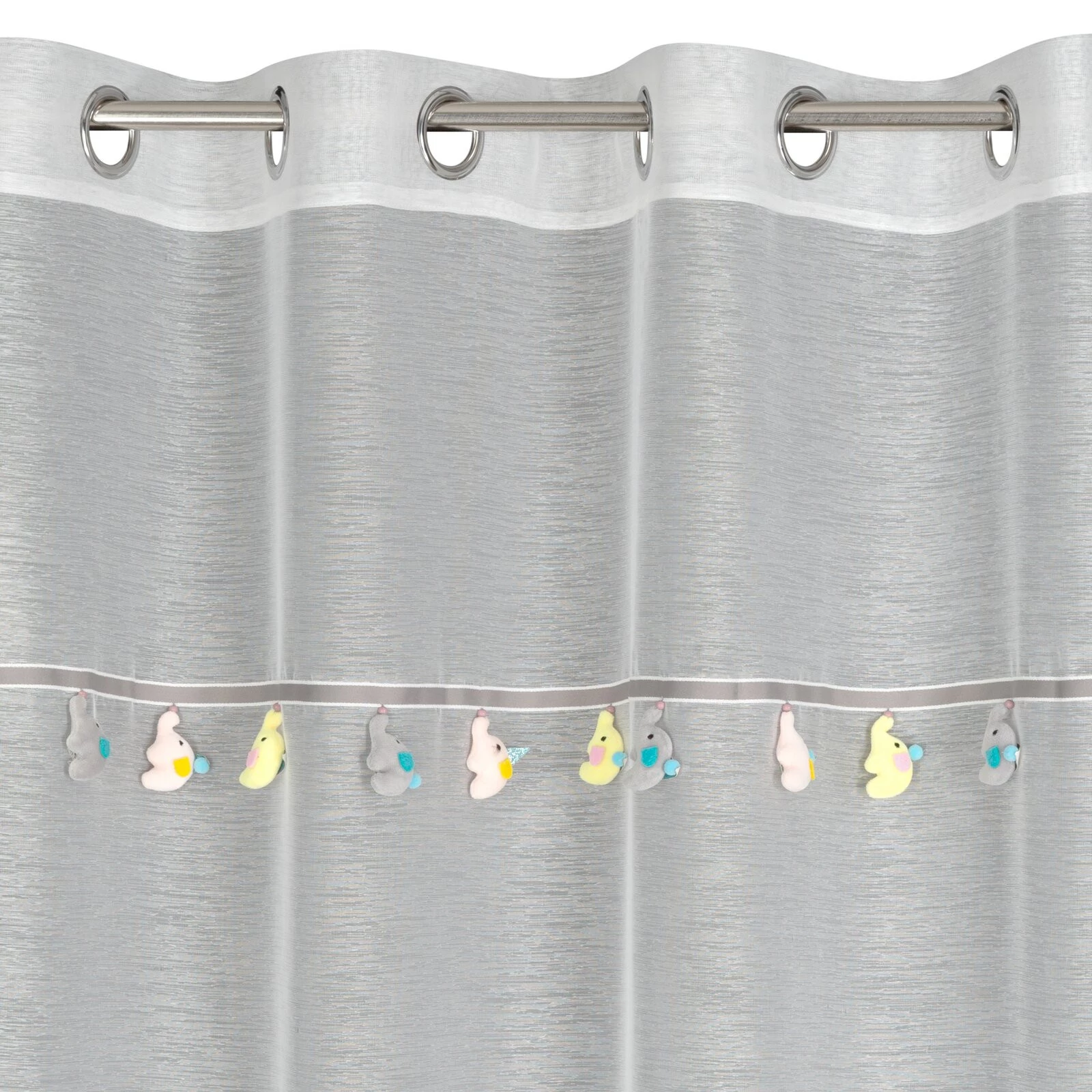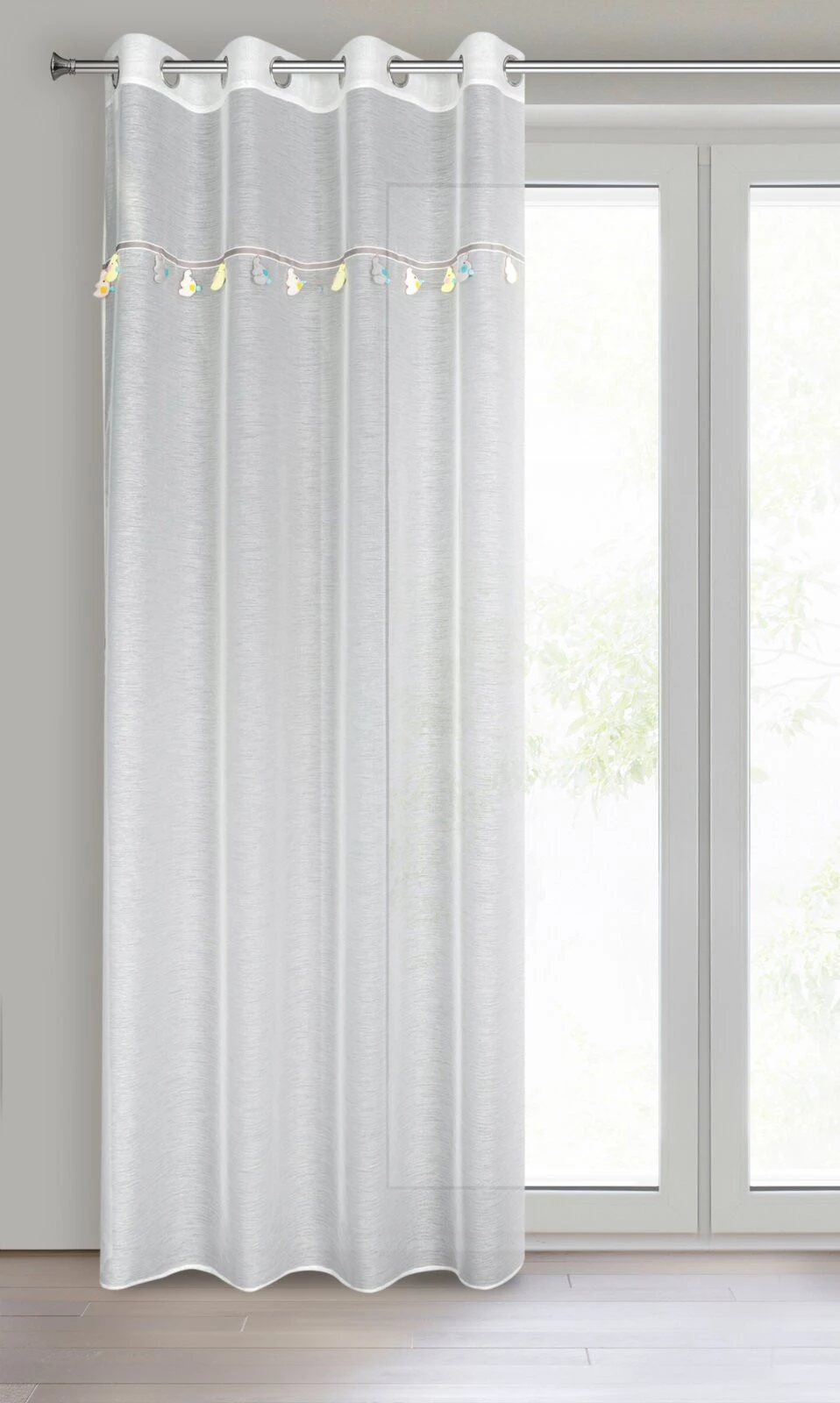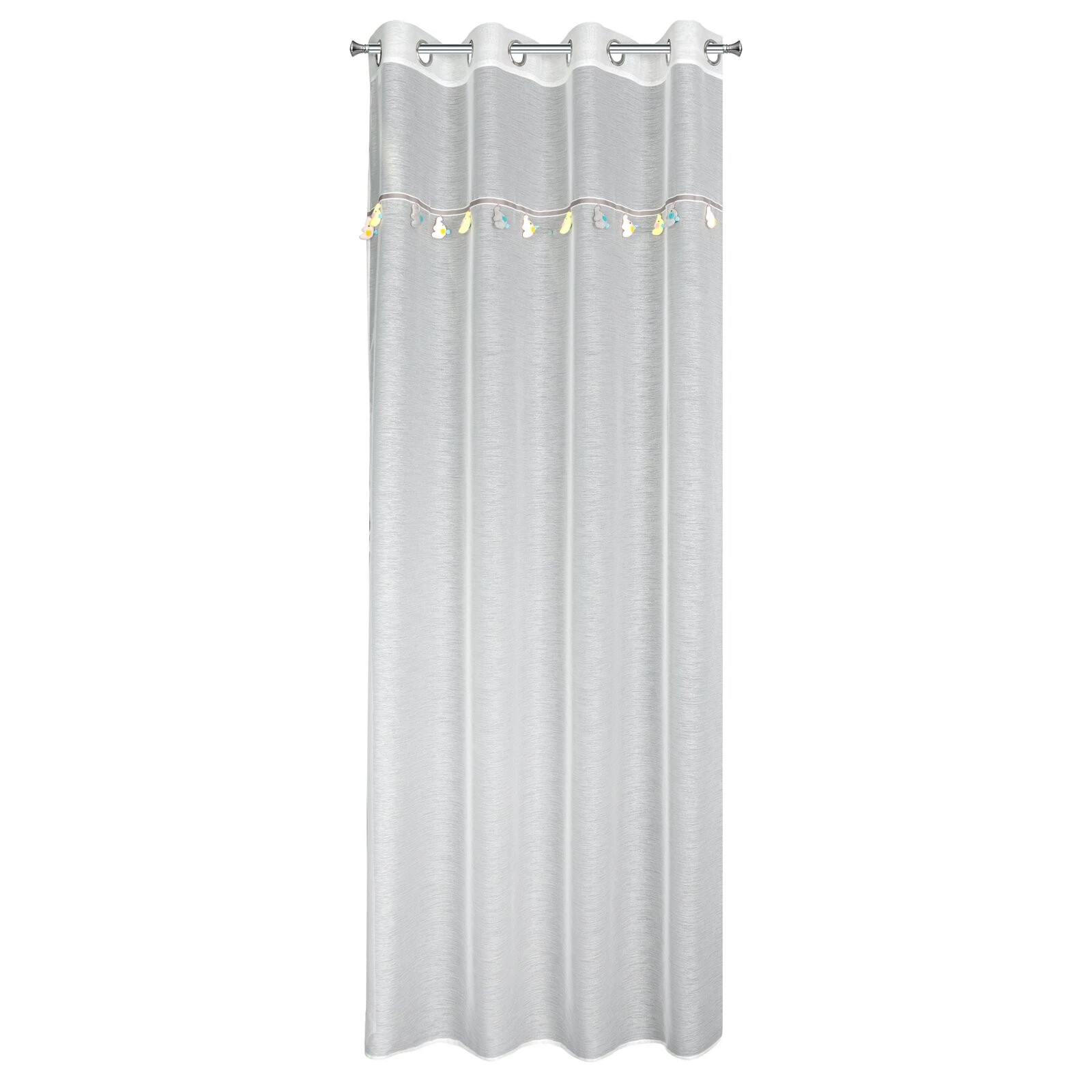 - Firana gotowa z wszytą taśmą dekoracyjną z motywem dziecięcym szerokość: 140 cm, długość: 250 cm, kolor: kremowy, Gramatura: 50 GSM, Skład: 100% poliester