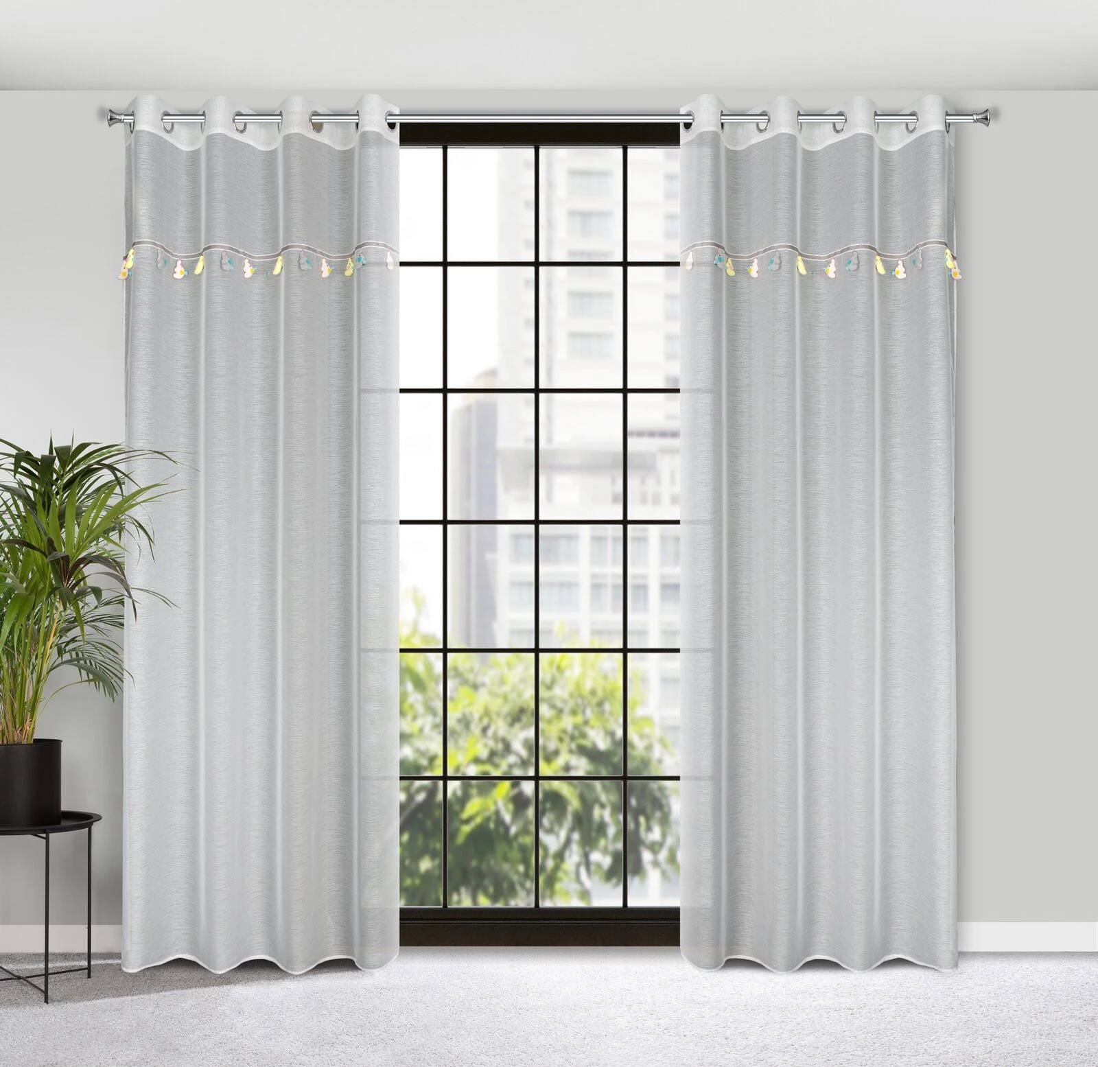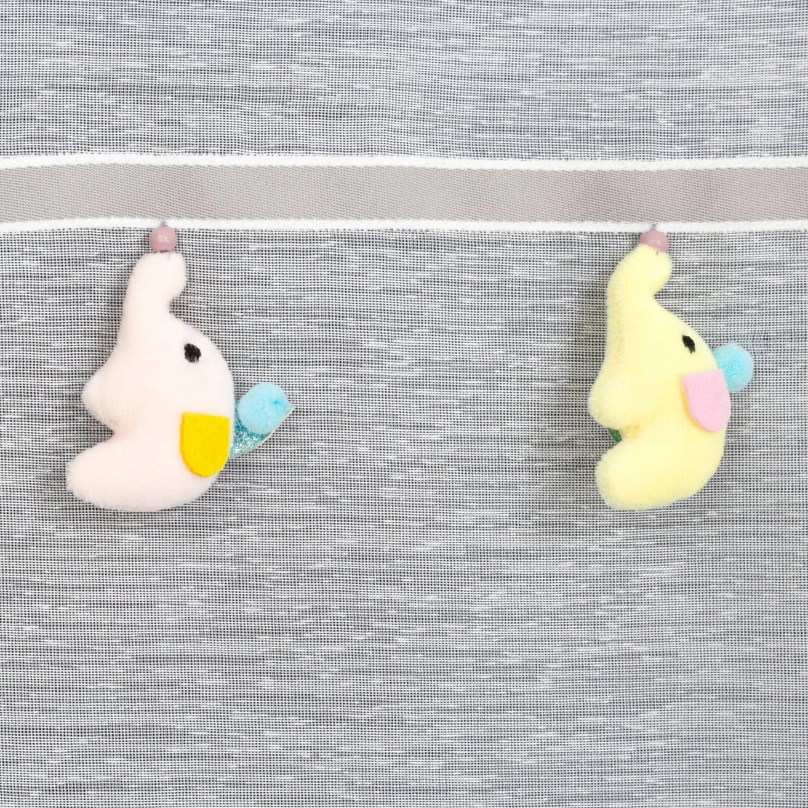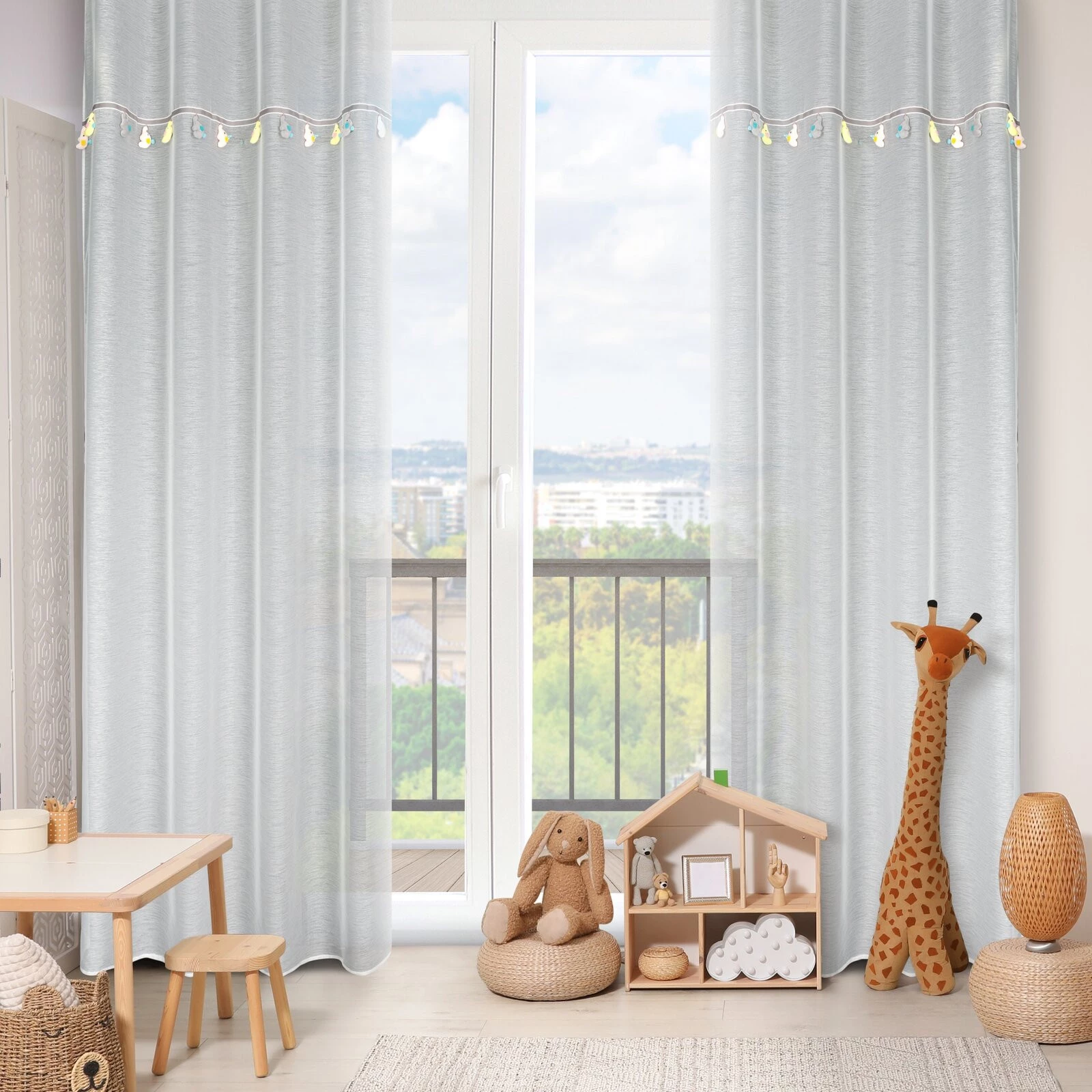 - Firana gotowa z wszytą taśmą dekoracyjną z motywem dziecięcym szerokość: 140 cm, długość: 250 cm, kolor: kremowy, Gramatura: 50 GSM, Skład: 100% poliester
