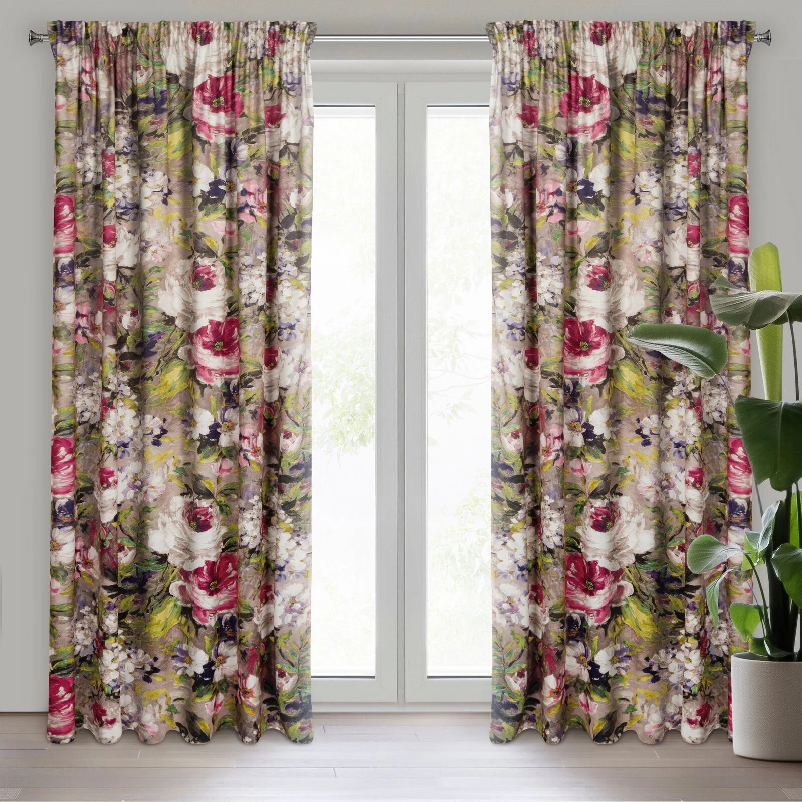 Gotowa zasłona welwetowa, drukowana szerokość: 140 cm, długość: 270 cm, kolor: beżowy, Gramatura: 200 GSM, Skład: 100% poliester