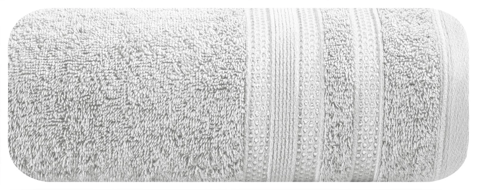 Minimalistyczny ręcznik kąpielowy z chłonnej bawełny frotte. Bordiura zdobiona cienkimi pasami z dodatkiem lśniącej nici. Ręcznik odpornym na częste pranie. szerokość: 50 cm, długość: 90 cm, kolor: srebrny, Gramatura: 500 GSM, Skład: 100% bawełna; część ozdobna: 89% bawełna; 11% nić metaliczna
