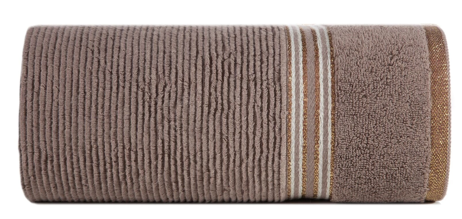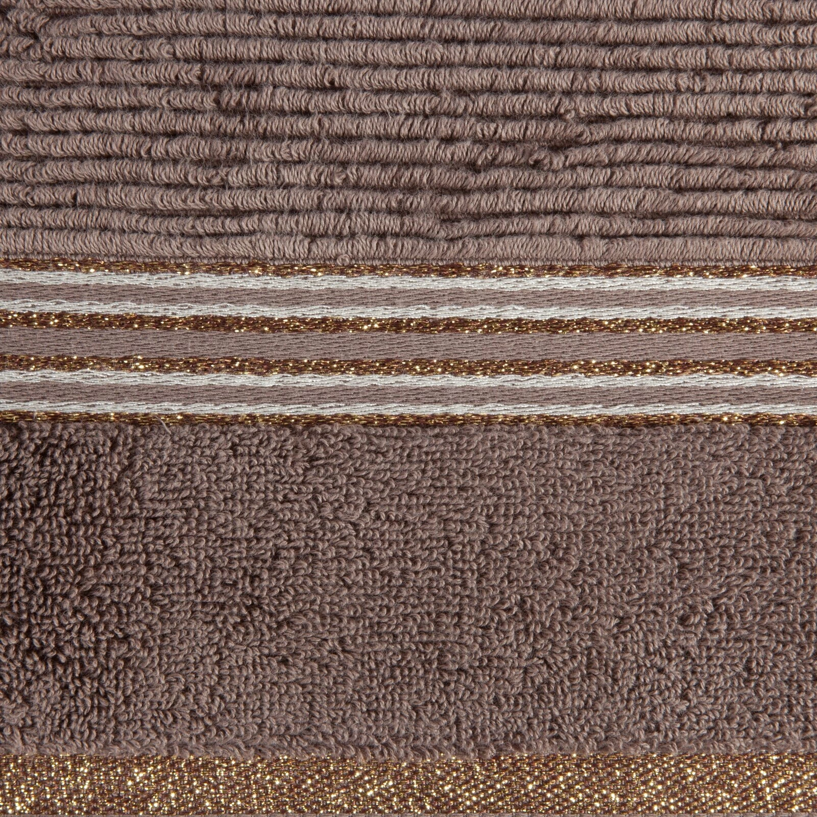 Bardzo puszysty i wyjątkowo chłonny ręcznik z bawełny frotte o strukturze delikatnych prążków. Bordiura w ciemniejszym kolorze z dodatkiem lśniącej nitki. szerokość: 30 cm, długość: 50 cm, kolor: jasnobrązowy, Gramatura: 530 GSM, Skład: 100% bawełna; część ozdobna: 97% bawełna, 3% poliester