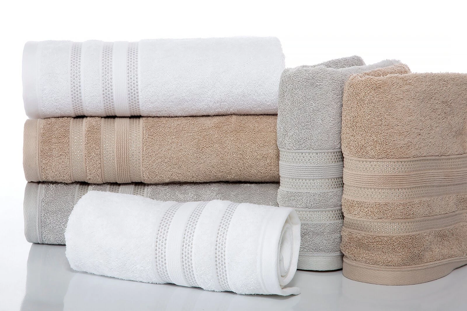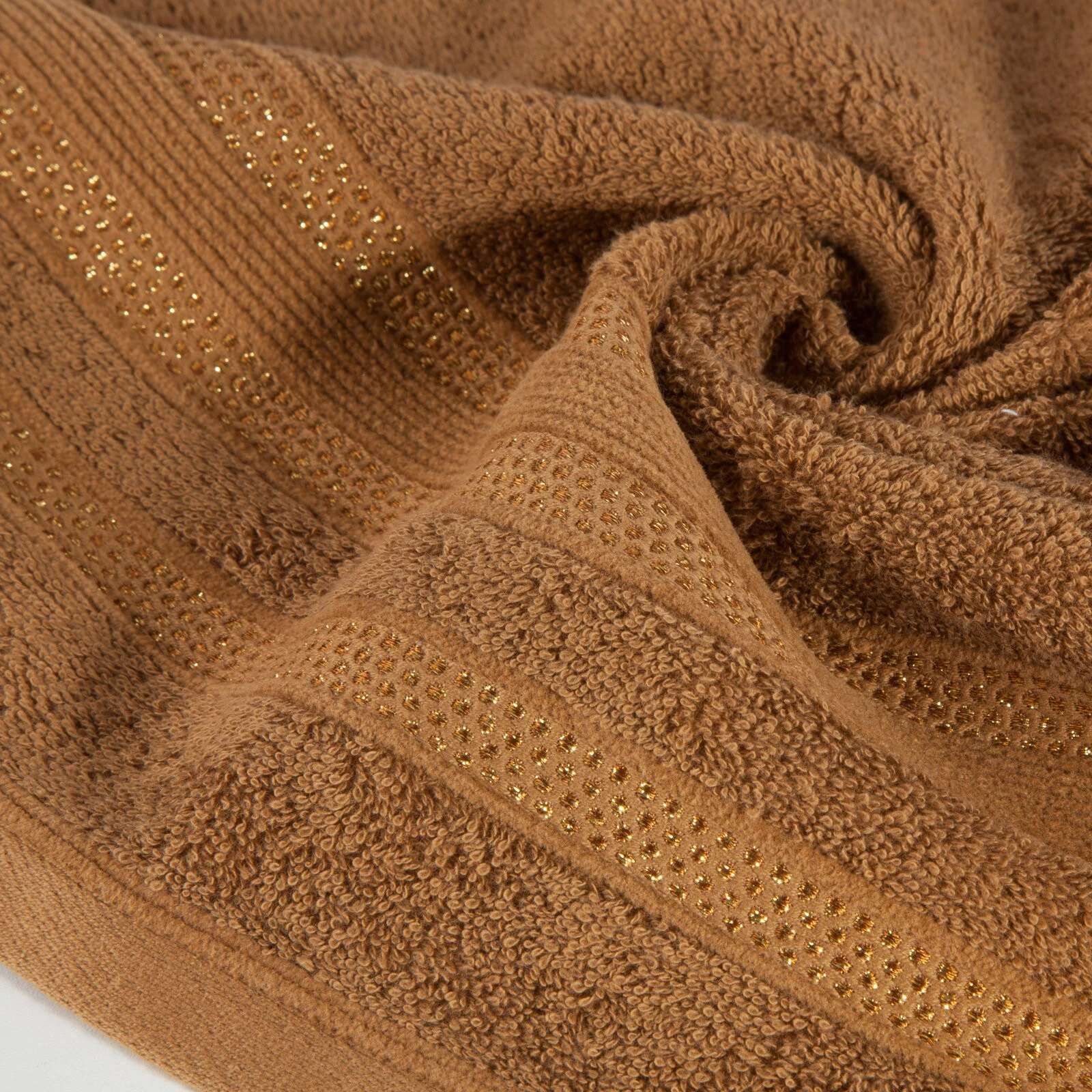 Ręcznik z bordiurą z wplecioną błyszczącą nicią szerokość: 50 cm, długość: 90 cm, kolor: brązowy, Gramatura: 500 GSM, Skład: 100% bawełna; część ozdobna: 89% bawełna, 11% nić metaliczna