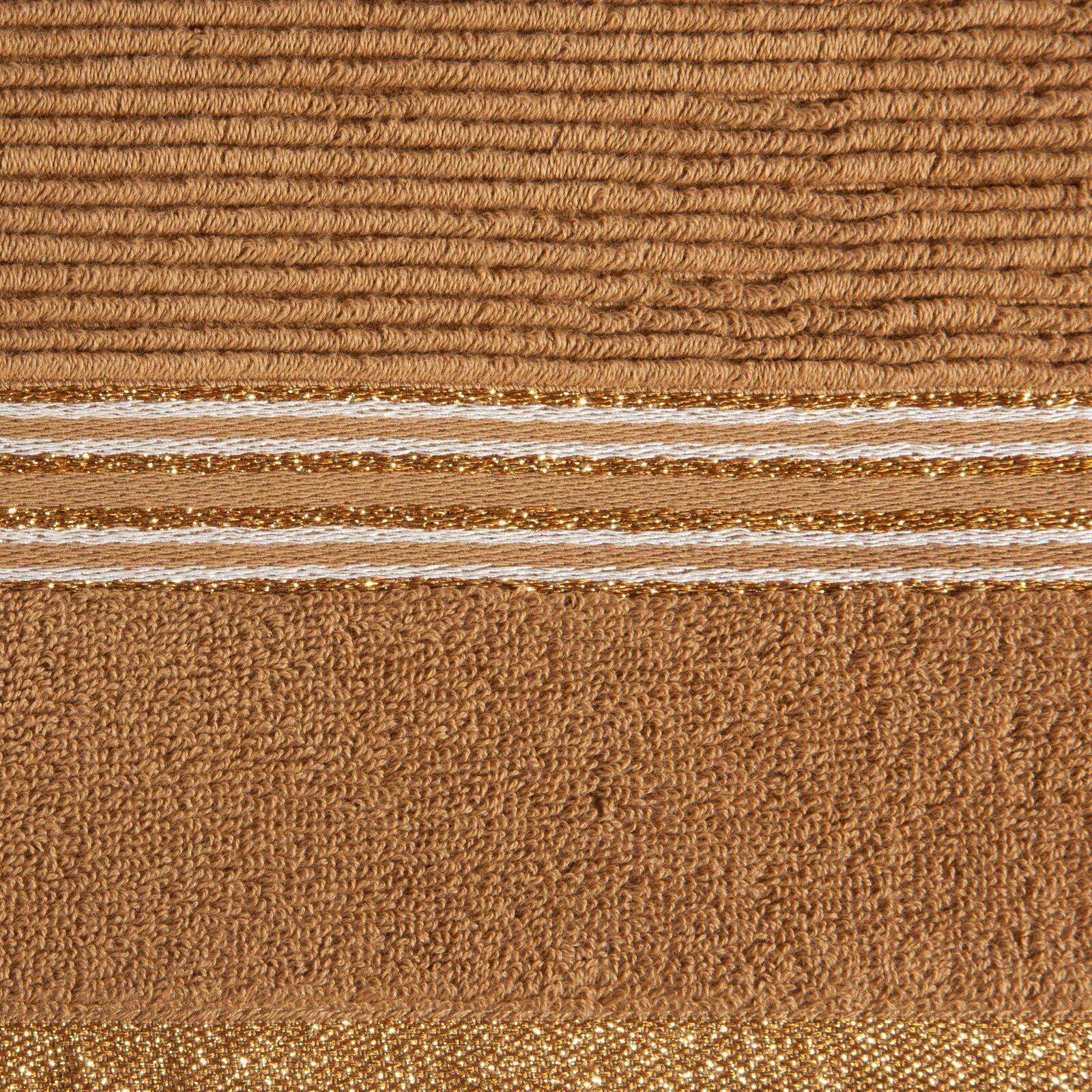 Ręcznik w prążki z ozdobną bordiurą przetykaną błyszczącą nicią szerokość: 70 cm, długość: 140 cm, kolor: brązowy, Gramatura: 530 GSM, Skład: 100% bawełna; część ozdobna: 97% bawełna, 3% poliester