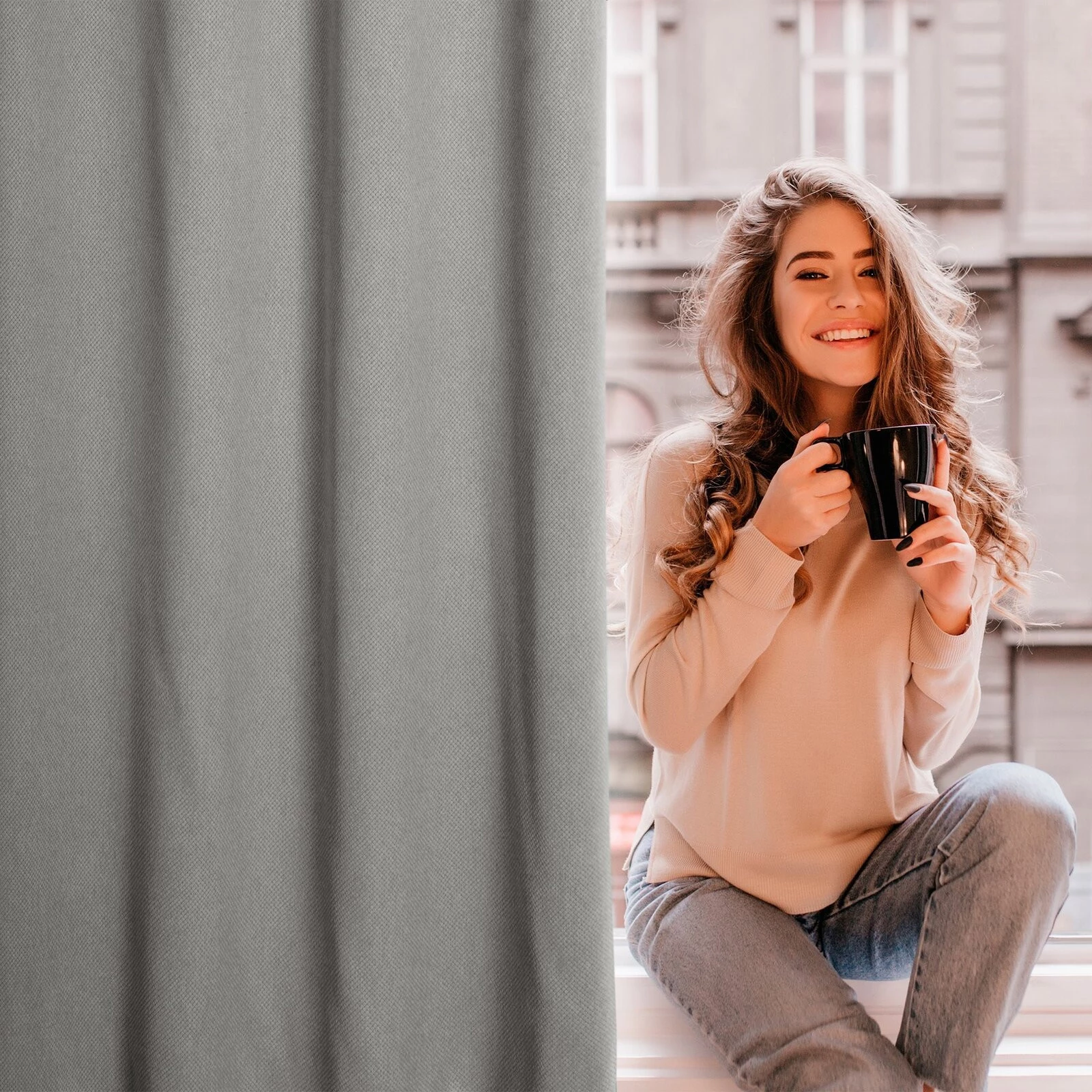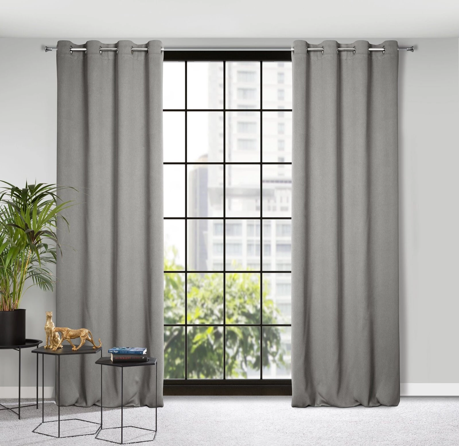 - Zasłona zaciemniająca jednokolorowa strukturalna typu blackout szerokość: 140 cm, długość: 250 cm, kolor: szarobeżowy, Gramatura: 340 GSM, Skład: 100% poliester