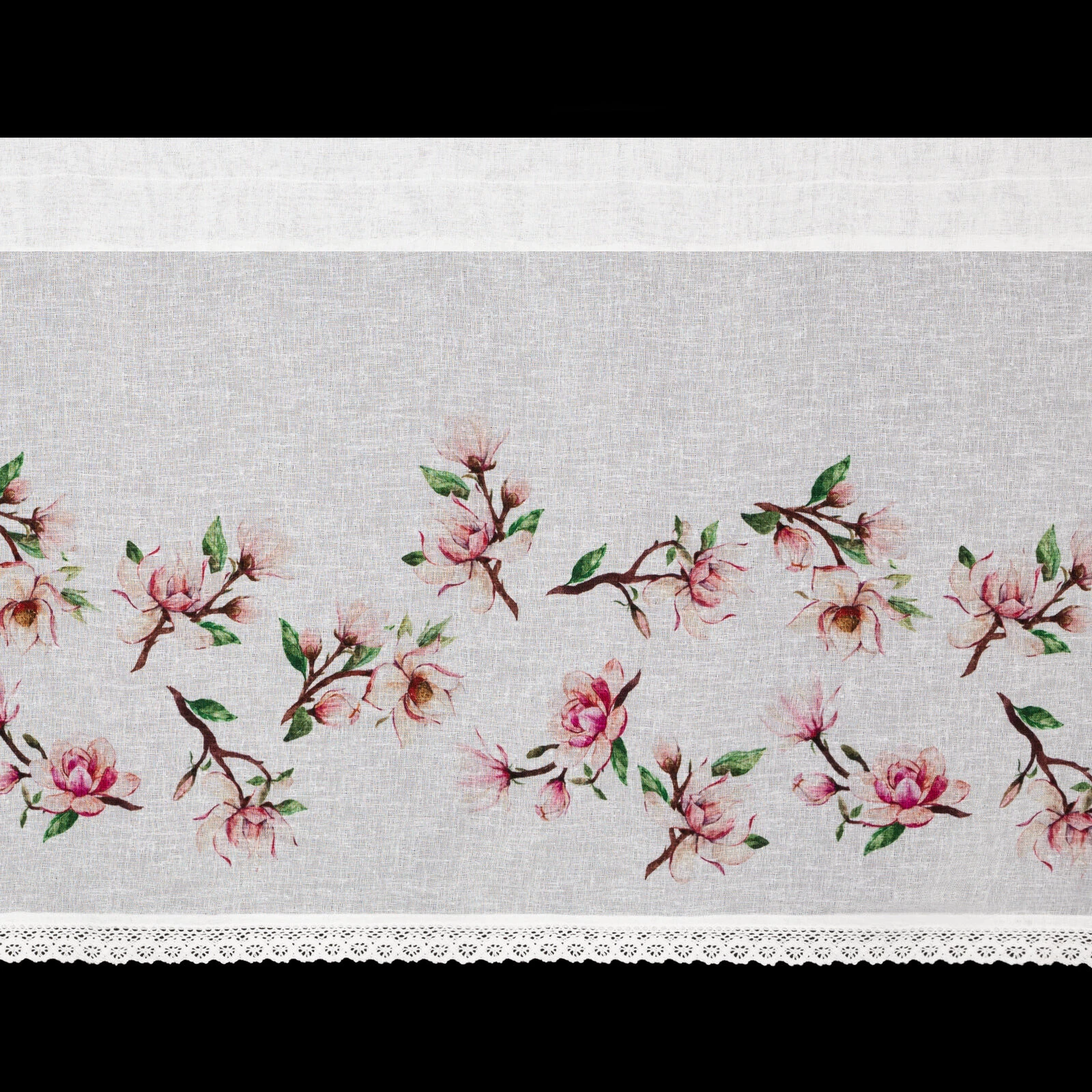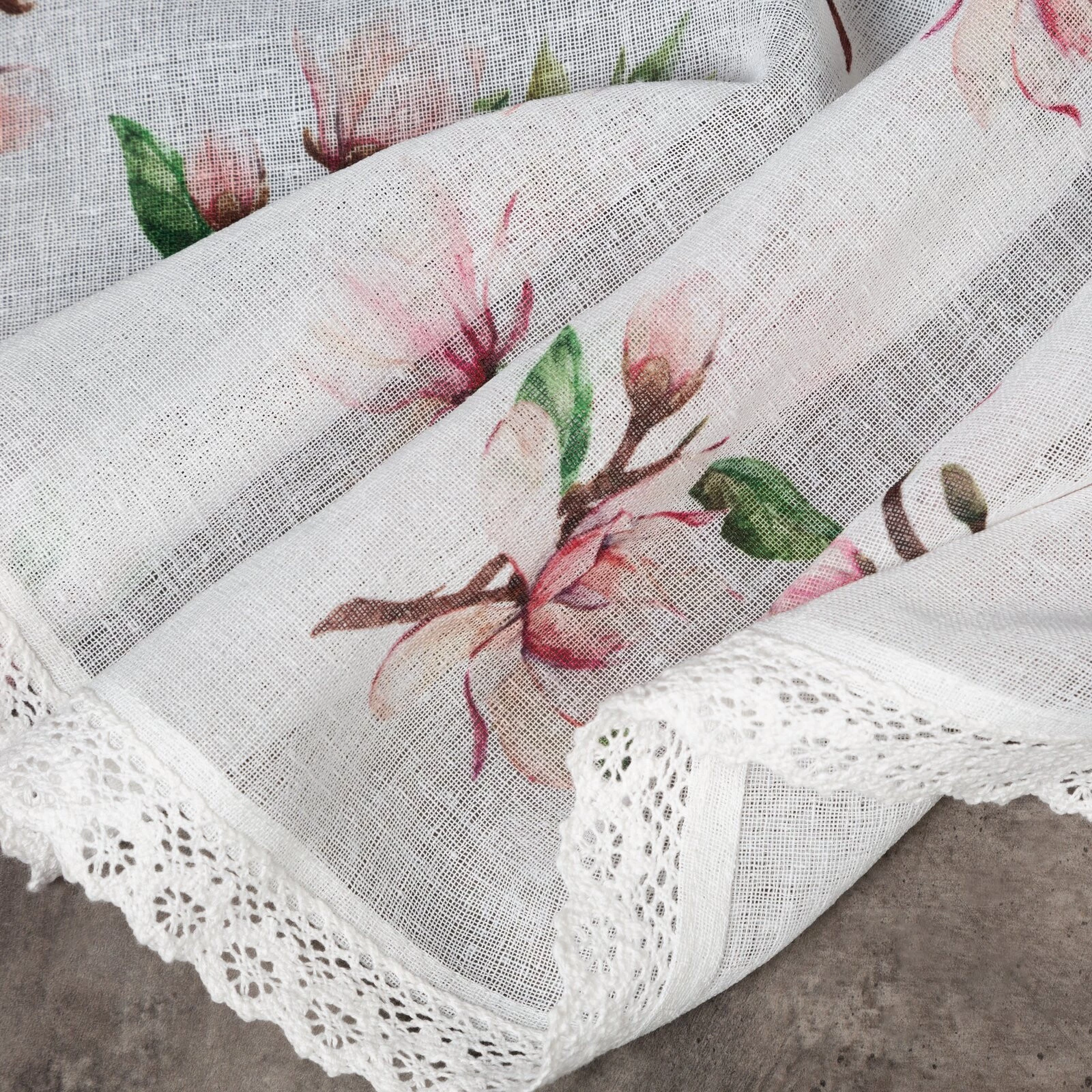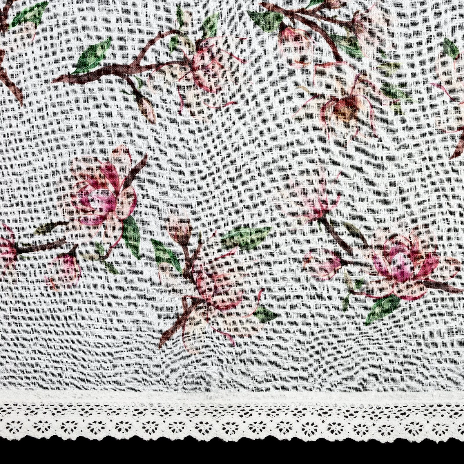 - Zazdrostka z nadrukiem zdobiona koronką szerokość: 150 cm, długość: 60 cm, kolor: biały, Gramatura: 110 GSM, Skład: 100% poliester