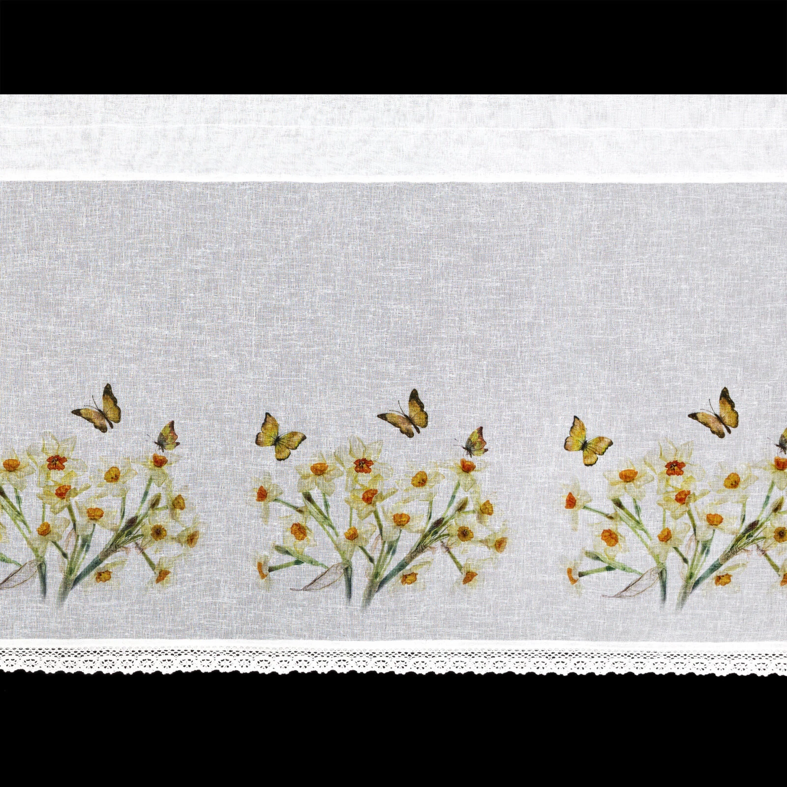- Zazdrostka z nadrukiem zdobiona koronką szerokość: 150 cm, długość: 60 cm, kolor: biały, Gramatura: 110 GSM, Skład: 100% poliester