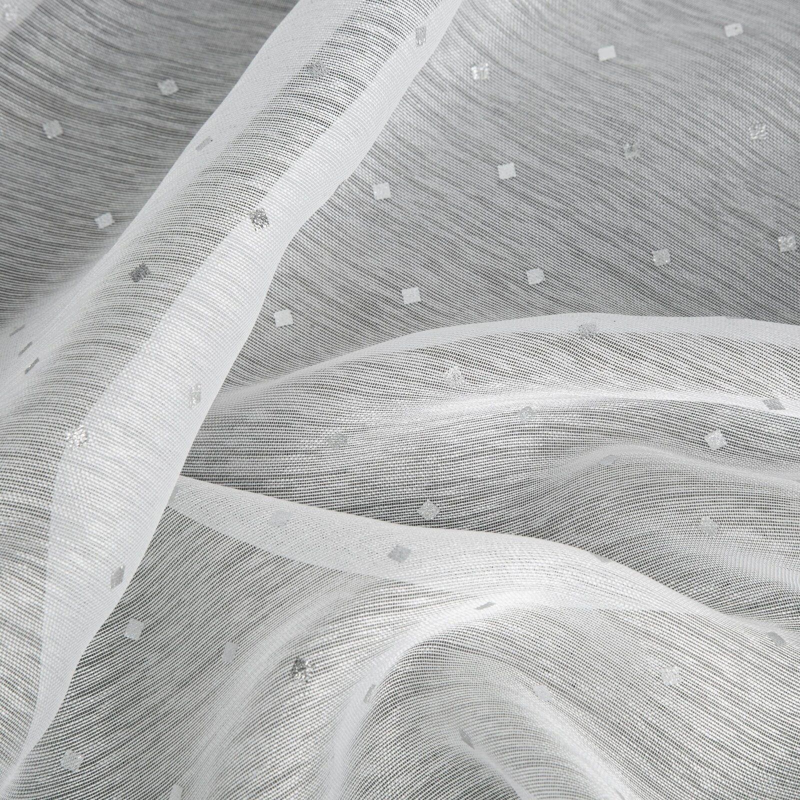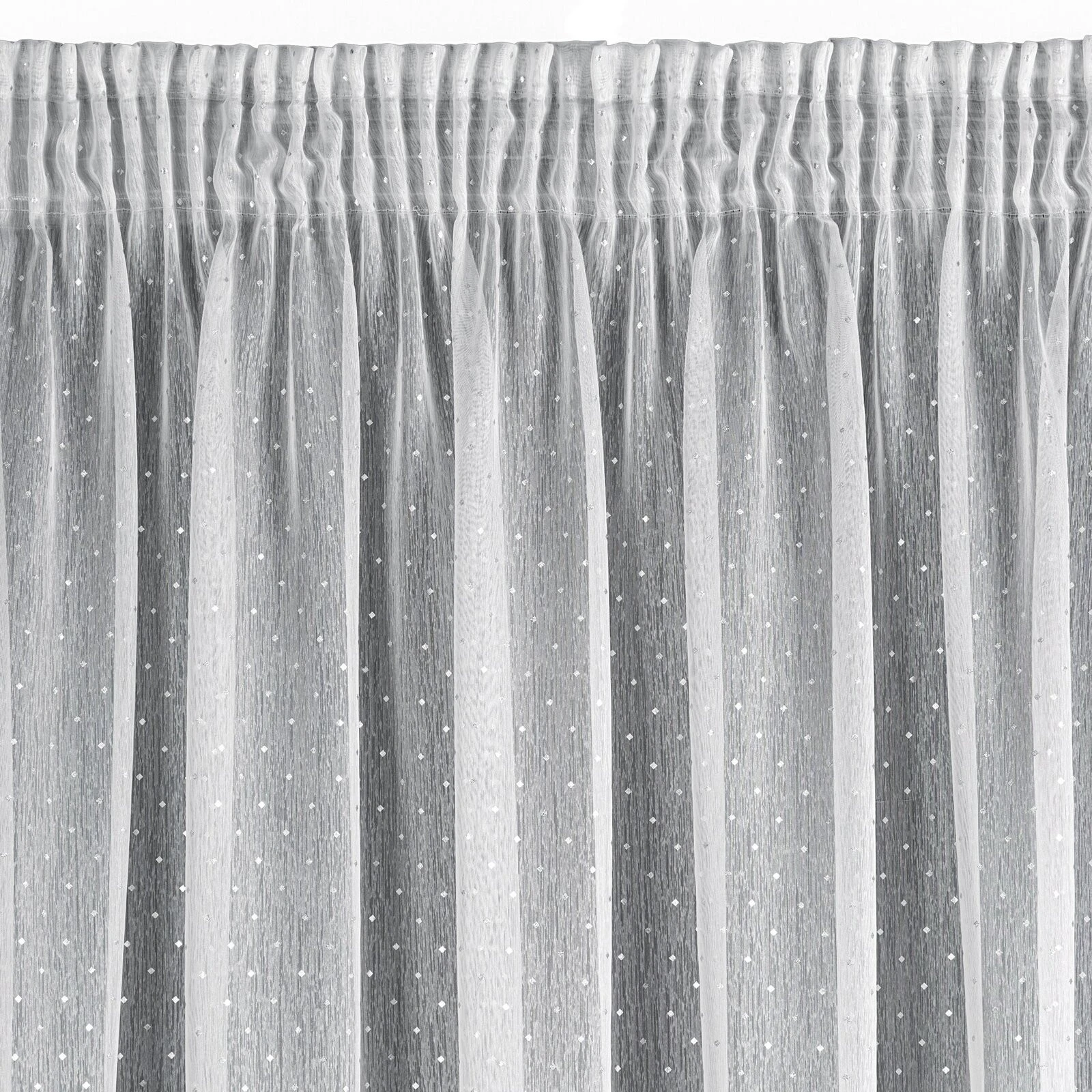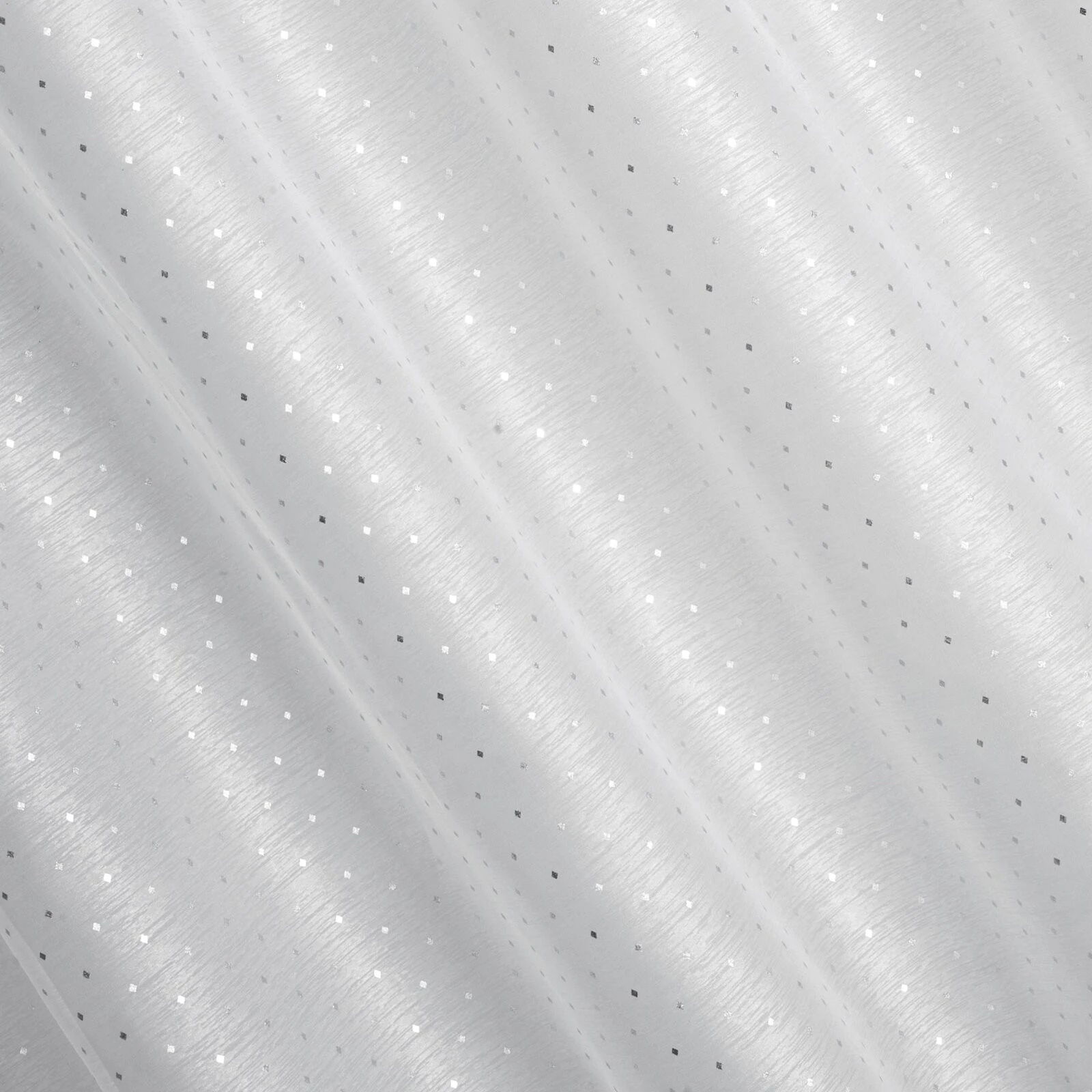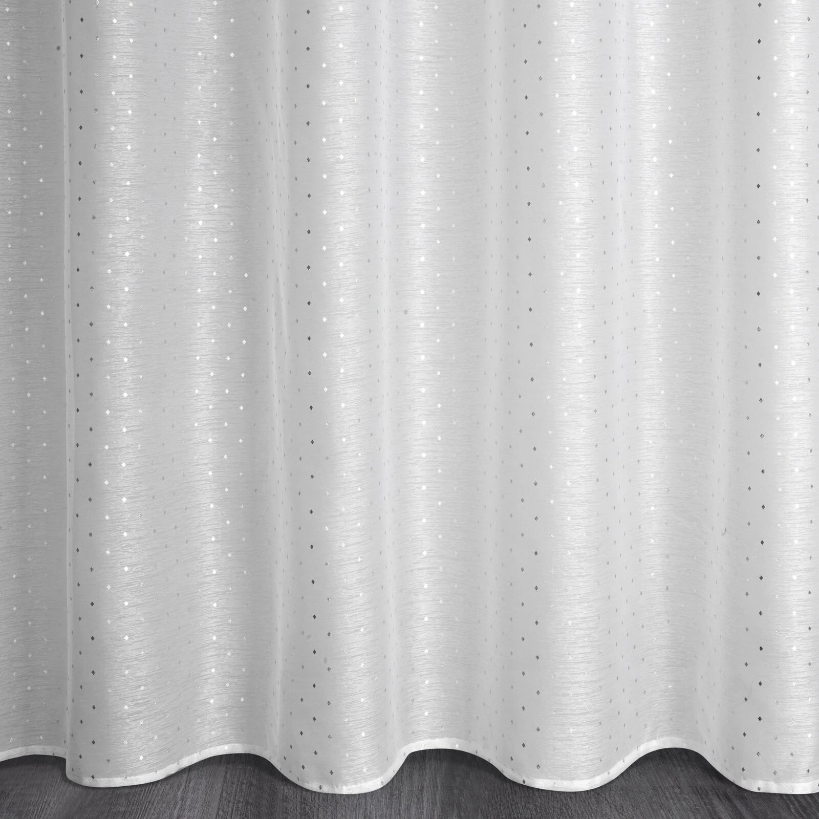 Miękka firana z nieprzejrzystej tkaniny dekorowanej drobnym nadrukiem srebrnych rombów. Doskonale rozprasza światło. Wymaga prasowania po lewej stronie. szerokość: 300 cm, długość: 250 cm, kolor: biały, Gramatura: 50 GSM, Skład: 100% poliester