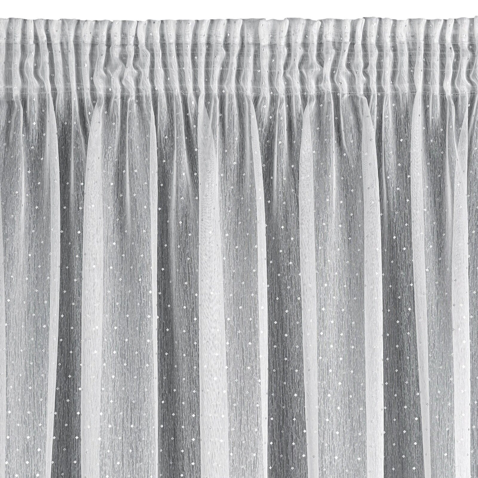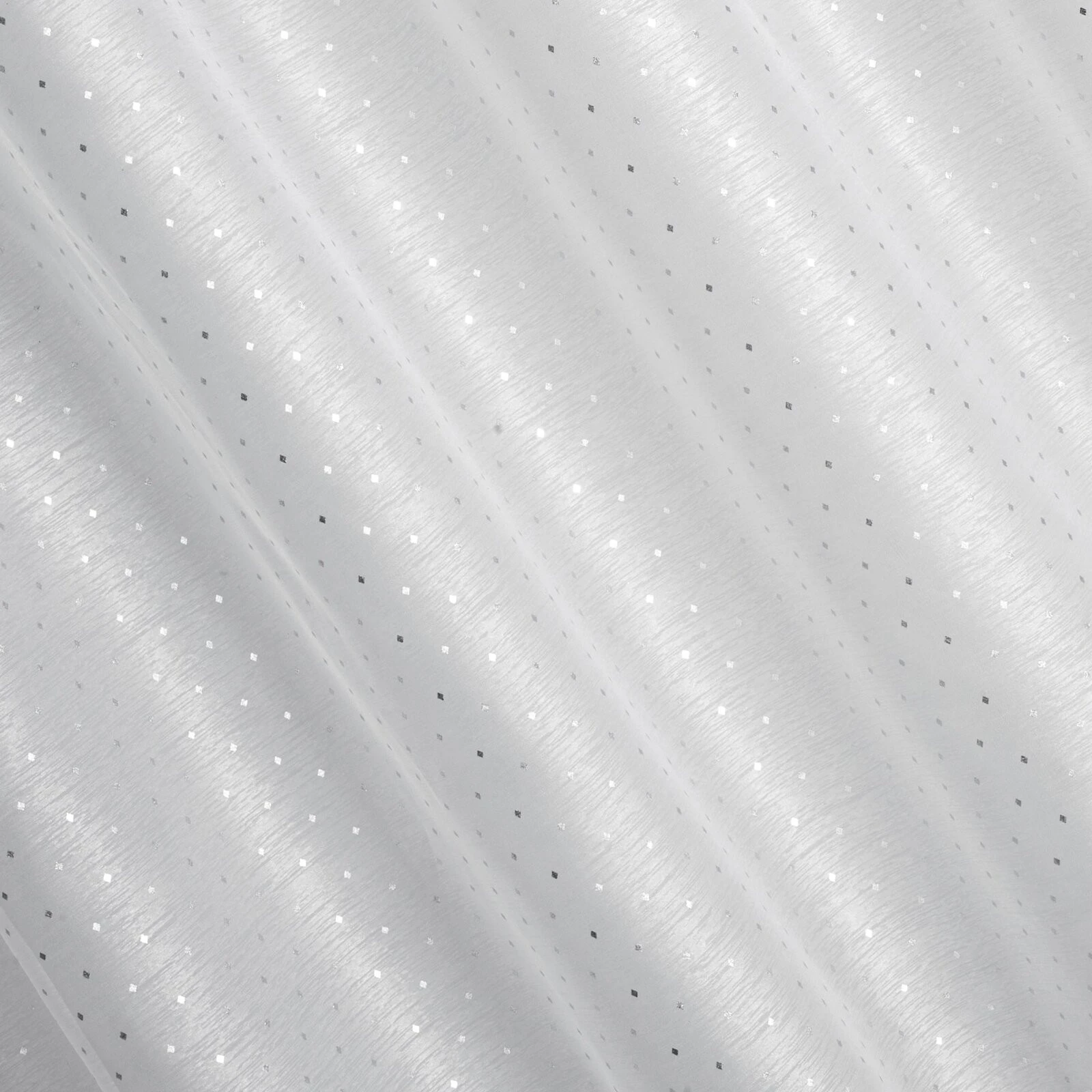 Miękka firana z nieprzejrzystej tkaniny dekorowanej drobnym nadrukiem srebrnych rombów. Doskonale rozprasza światło. Wymaga prasowania po lewej stronie. szerokość: 300 cm, długość: 150 cm, kolor: biały, Gramatura: 50 GSM, Skład: 100% poliester