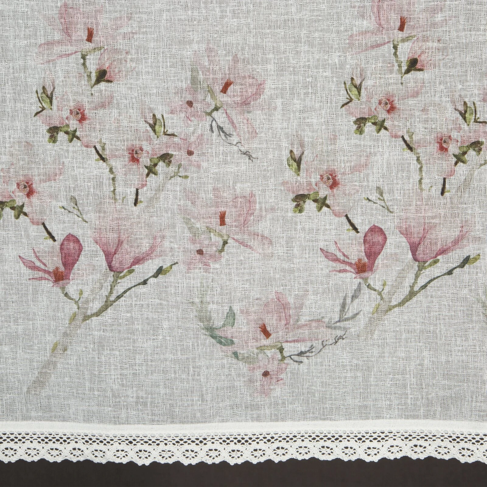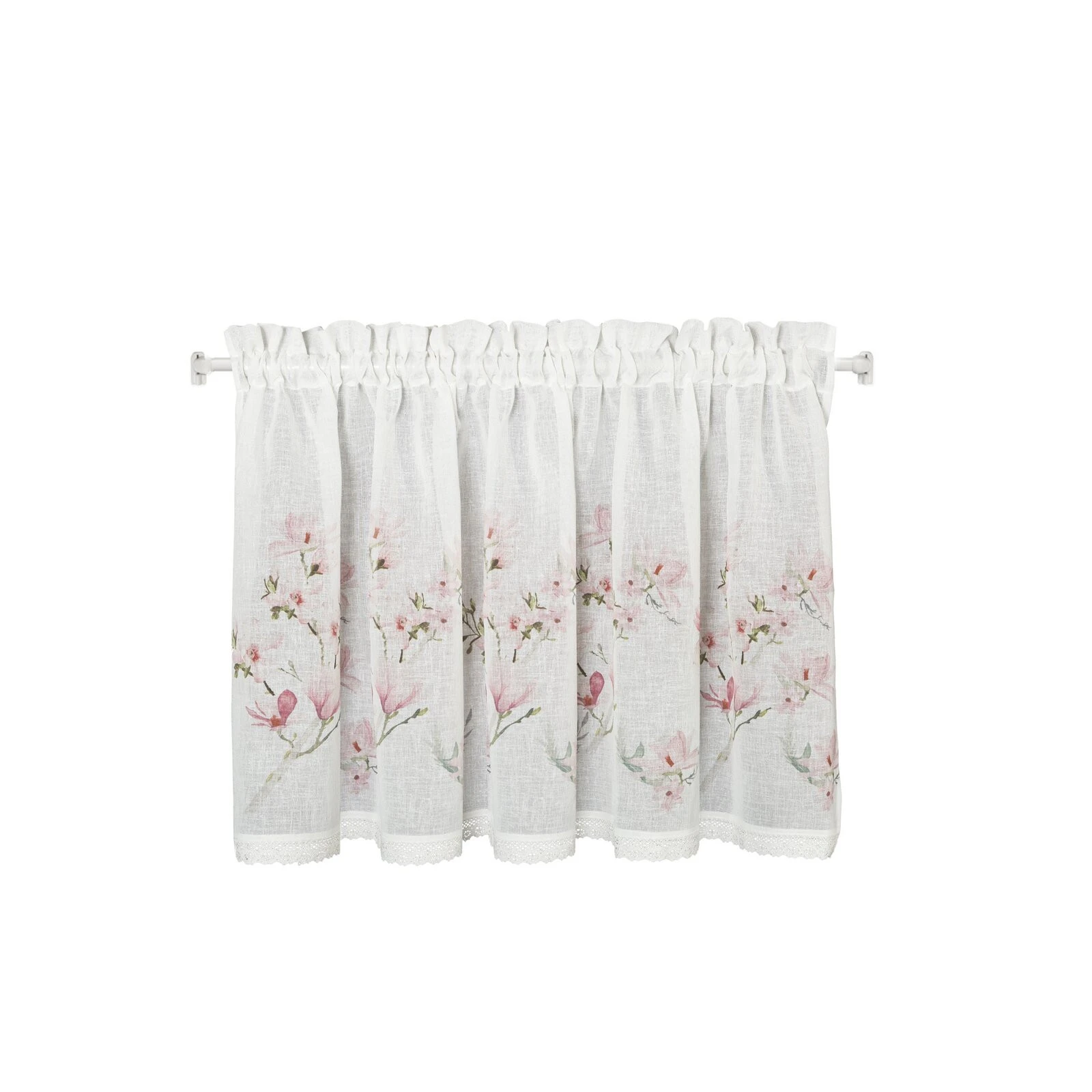 - Zazdrostka z nadrukiem zdobiona koronką szerokość: 150 cm, długość: 60 cm, kolor: biały, Gramatura: 110 GSM, Skład: 100% poliester