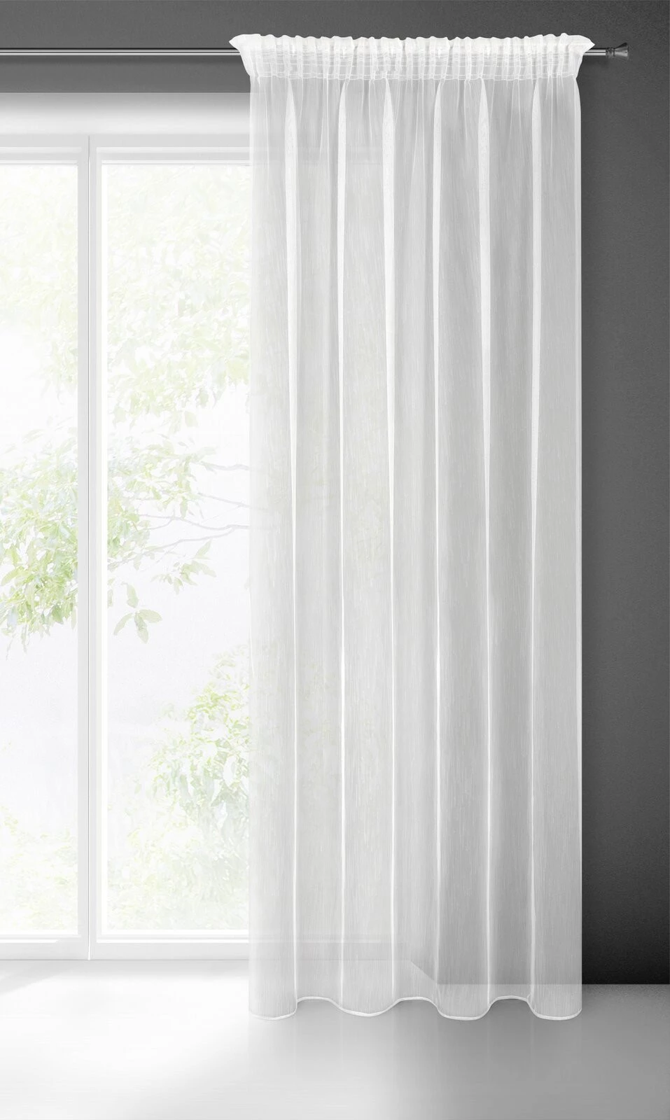 Delikatna firana w pięknym kolorze uszyta z tkaniny o strukturze drobnego deszczyku doskonale przepuszcza światło. Łatwa w prasowaniu i praniu dekoracja. szerokość: 140 cm, długość: 270 cm, kolor: biały, Gramatura: 50 GSM, Skład: 100% poliester