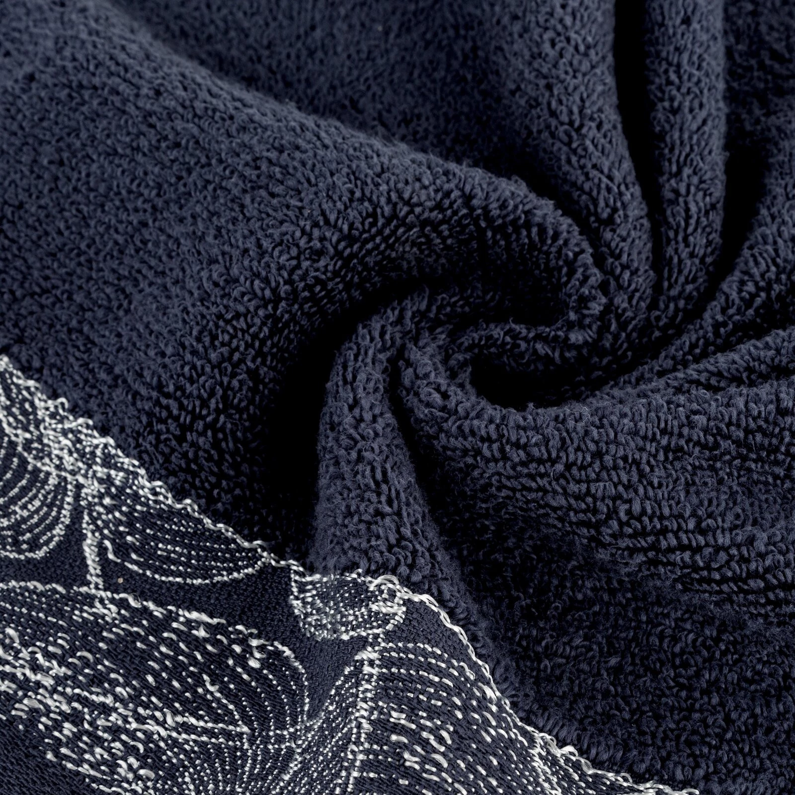 Ręcznik z ozdobną, żakardową bordiurą szerokość: 30 cm, długość: 50 cm, kolor: granatowy, Gramatura: 400 GSM, Skład: 100% bawełna; część ozdobna: 95% bawełna, 5% poliester