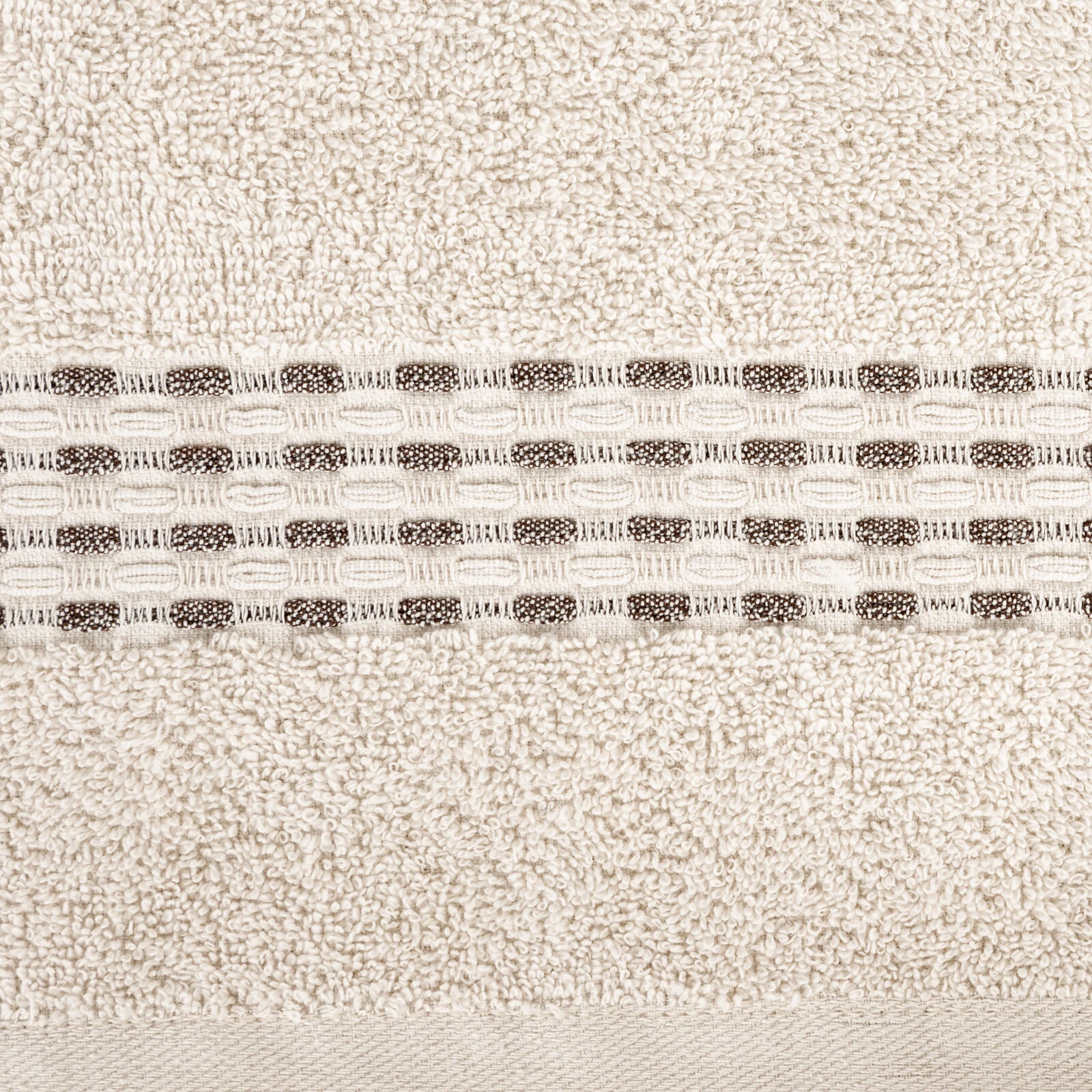 Ręcznik z ozdobną, żakardową bordiurą szerokość: 50 cm, długość: 90 cm, kolor: beżowy, Gramatura: 500 GSM, Skład: 100% bawełna; część ozdobna: 95% bawełna, 5% poliester