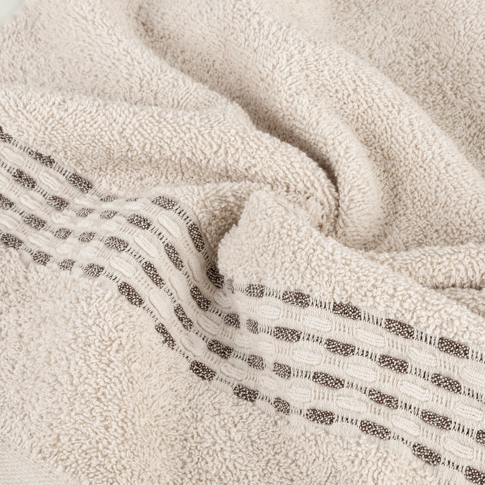 Ręcznik z ozdobną, żakardową bordiurą szerokość: 70 cm, długość: 140 cm, kolor: beżowy, Gramatura: 500 GSM, Skład: 100% bawełna; część ozdobna: 95% bawełna, 5% poliester