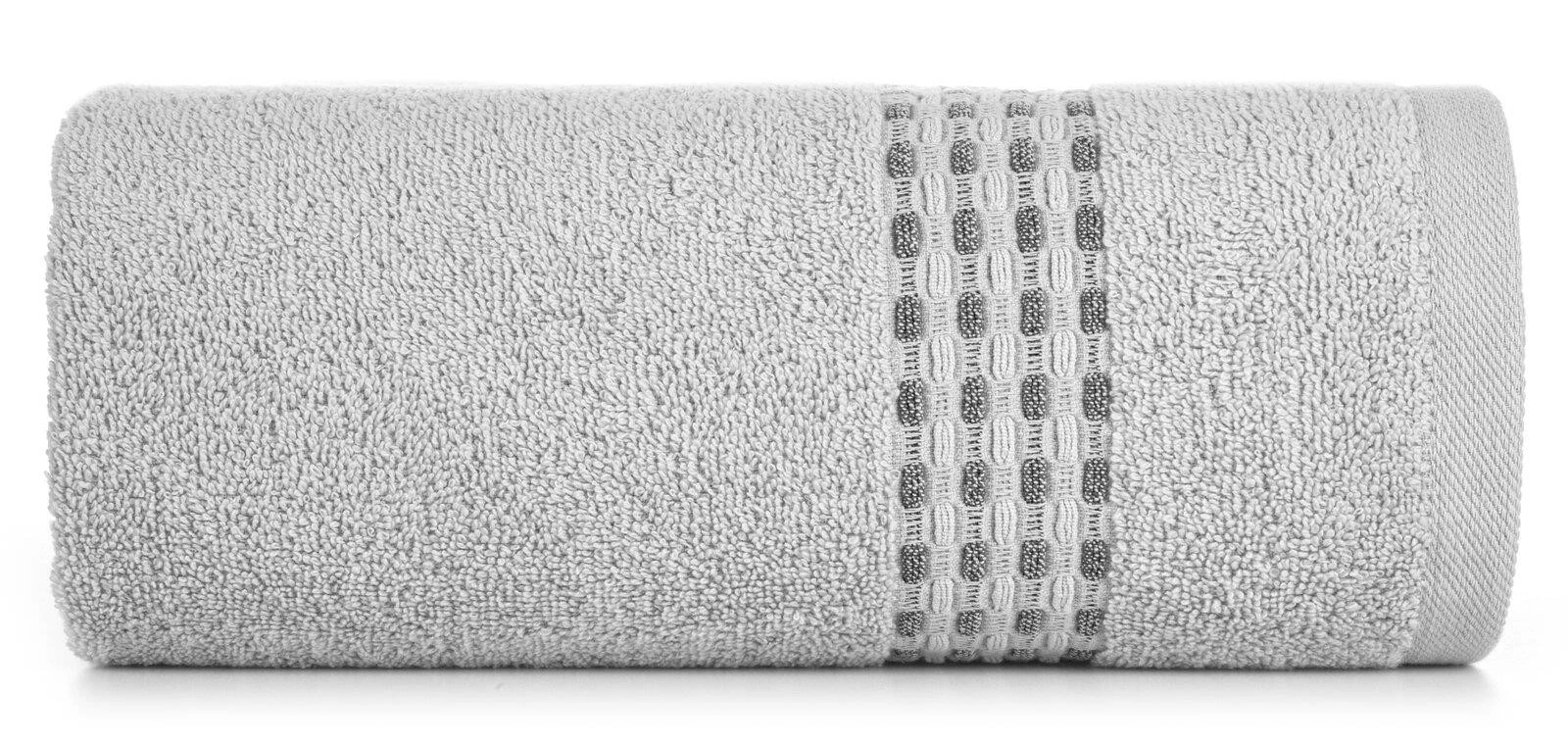 Ręcznik z ozdobną, żakardową bordiurą szerokość: 50 cm, długość: 90 cm, kolor: srebrny, Gramatura: 500 GSM, Skład: 100% bawełna; część ozdobna: 95% bawełna, 5% poliester
