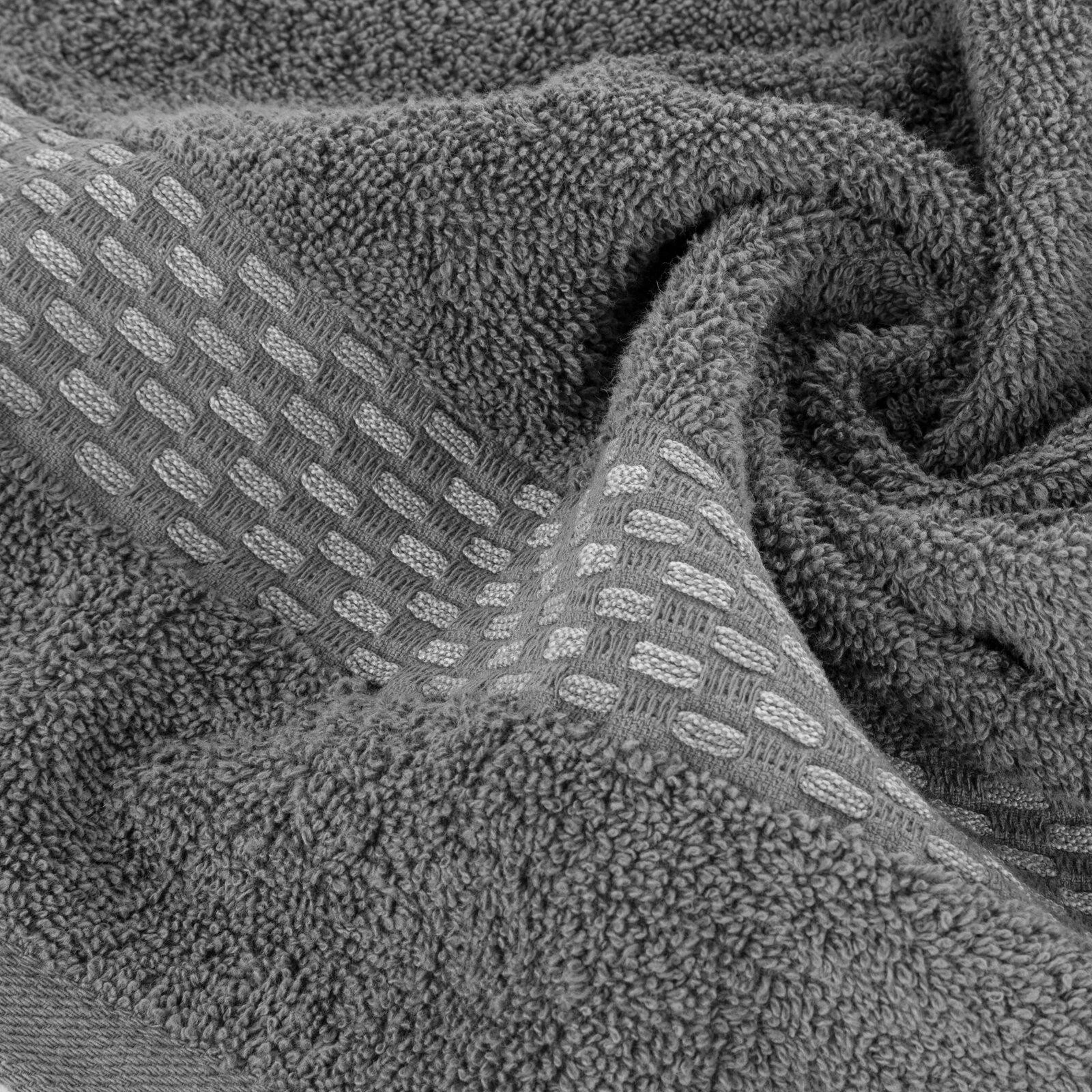 Ręcznik z ozdobną, żakardową bordiurą szerokość: 30 cm, długość: 50 cm, kolor: stalowy, Gramatura: 500 GSM, Skład: 100% bawełna; część ozdobna: 95% bawełna, 5% poliester