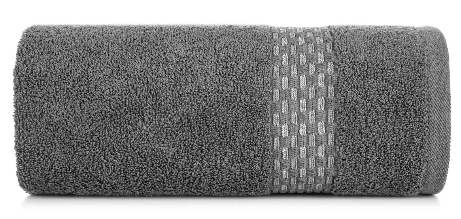 Ręcznik z ozdobną, żakardową bordiurą szerokość: 70 cm, długość: 140 cm, kolor: stalowy, Gramatura: 500 GSM, Skład: 100% bawełna; część ozdobna: 95% bawełna, 5% poliester
