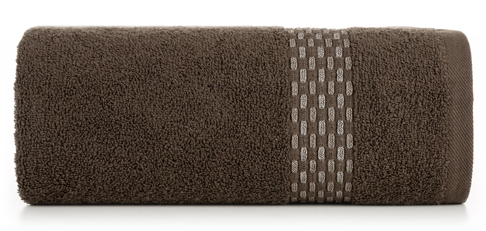 Ręcznik z ozdobną, żakardową bordiurą szerokość: 30 cm, długość: 50 cm, kolor: brązowy, Gramatura: 500 GSM, Skład: 100% bawełna; część ozdobna: 95% bawełna, 5% poliester