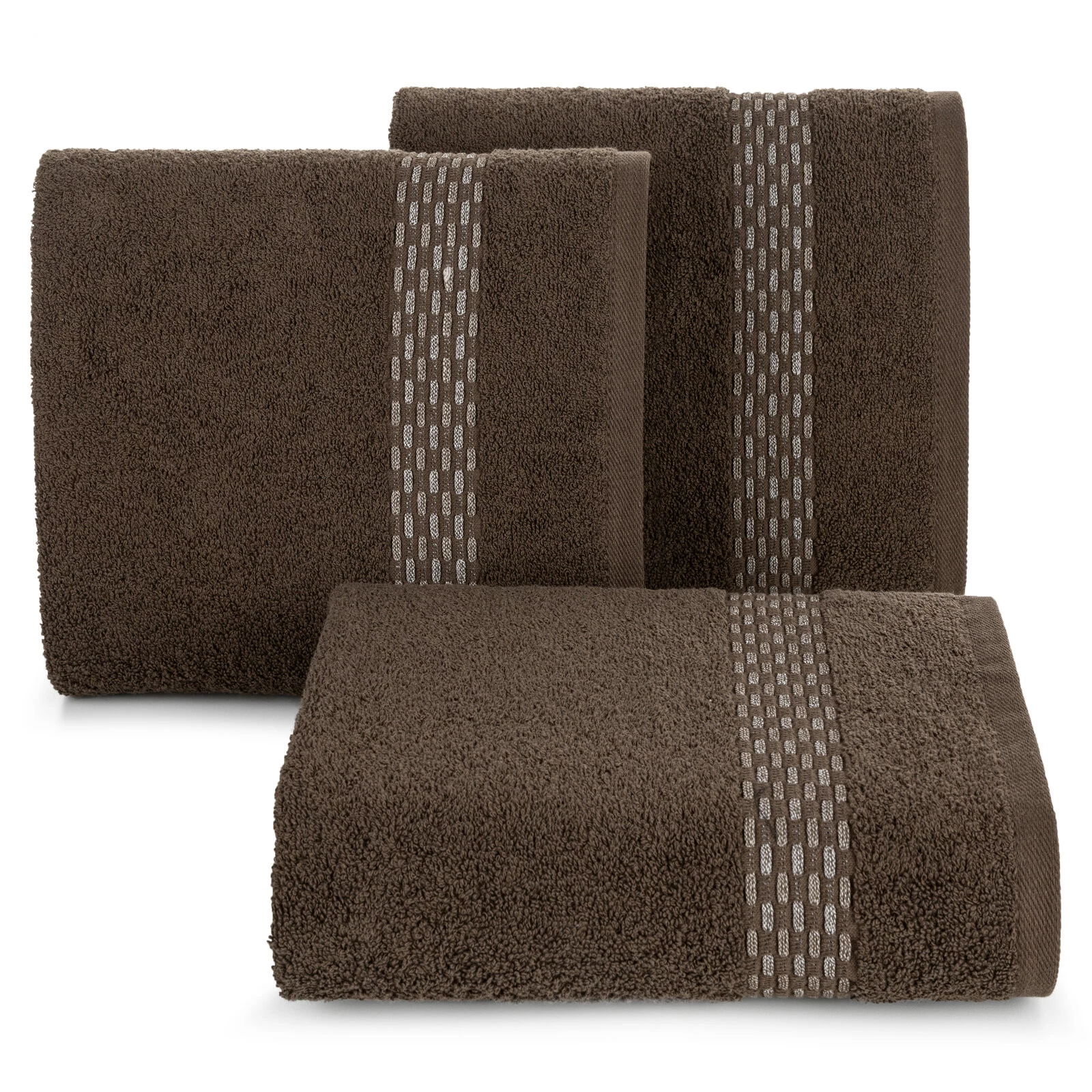 Ręcznik z ozdobną, żakardową bordiurą szerokość: 70 cm, długość: 140 cm, kolor: brązowy, Gramatura: 500 GSM, Skład: 100% bawełna; część ozdobna: 95% bawełna, 5% poliester