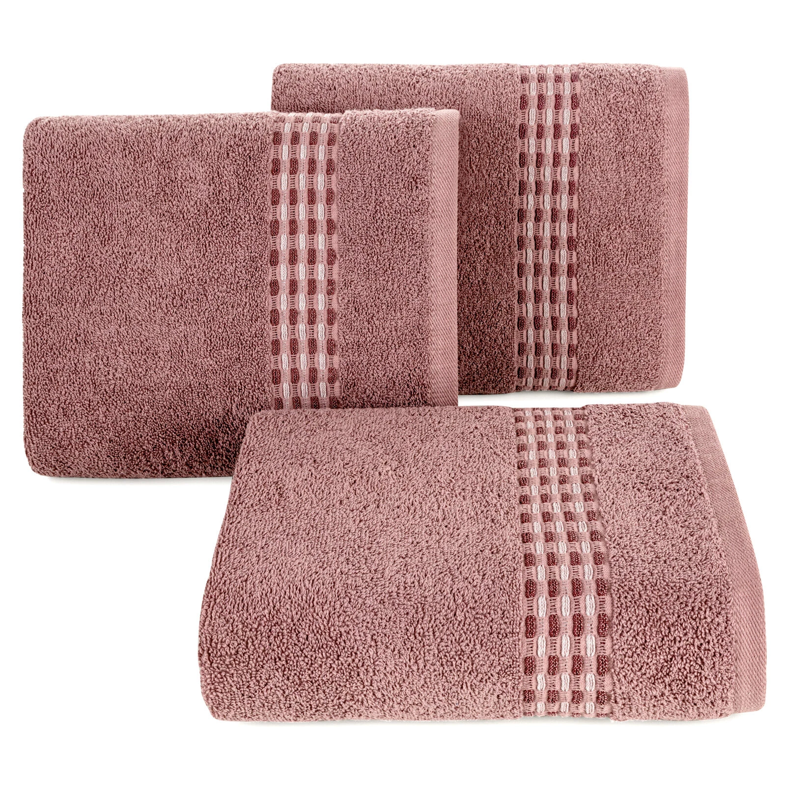 Ręcznik z ozdobną, żakardową bordiurą szerokość: 50 cm, długość: 90 cm, kolor: pudrowy róż, Gramatura: 500 GSM, Skład: 100% bawełna; część ozdobna: 95% bawełna, 5% poliester