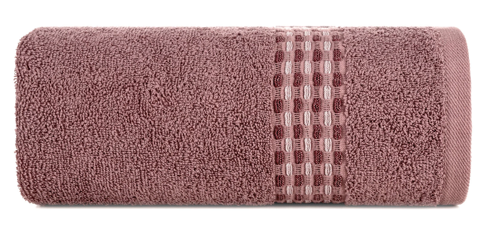 Ręcznik z ozdobną, żakardową bordiurą szerokość: 70 cm, długość: 140 cm, kolor: pudrowy róż, Gramatura: 500 GSM, Skład: 100% bawełna; część ozdobna: 95% bawełna, 5% poliester