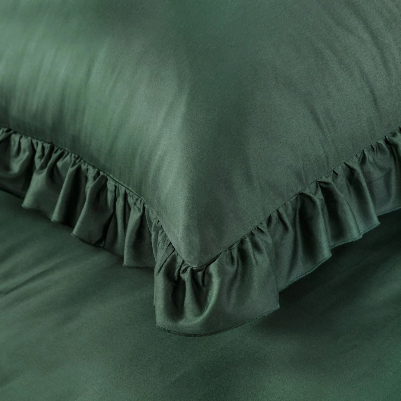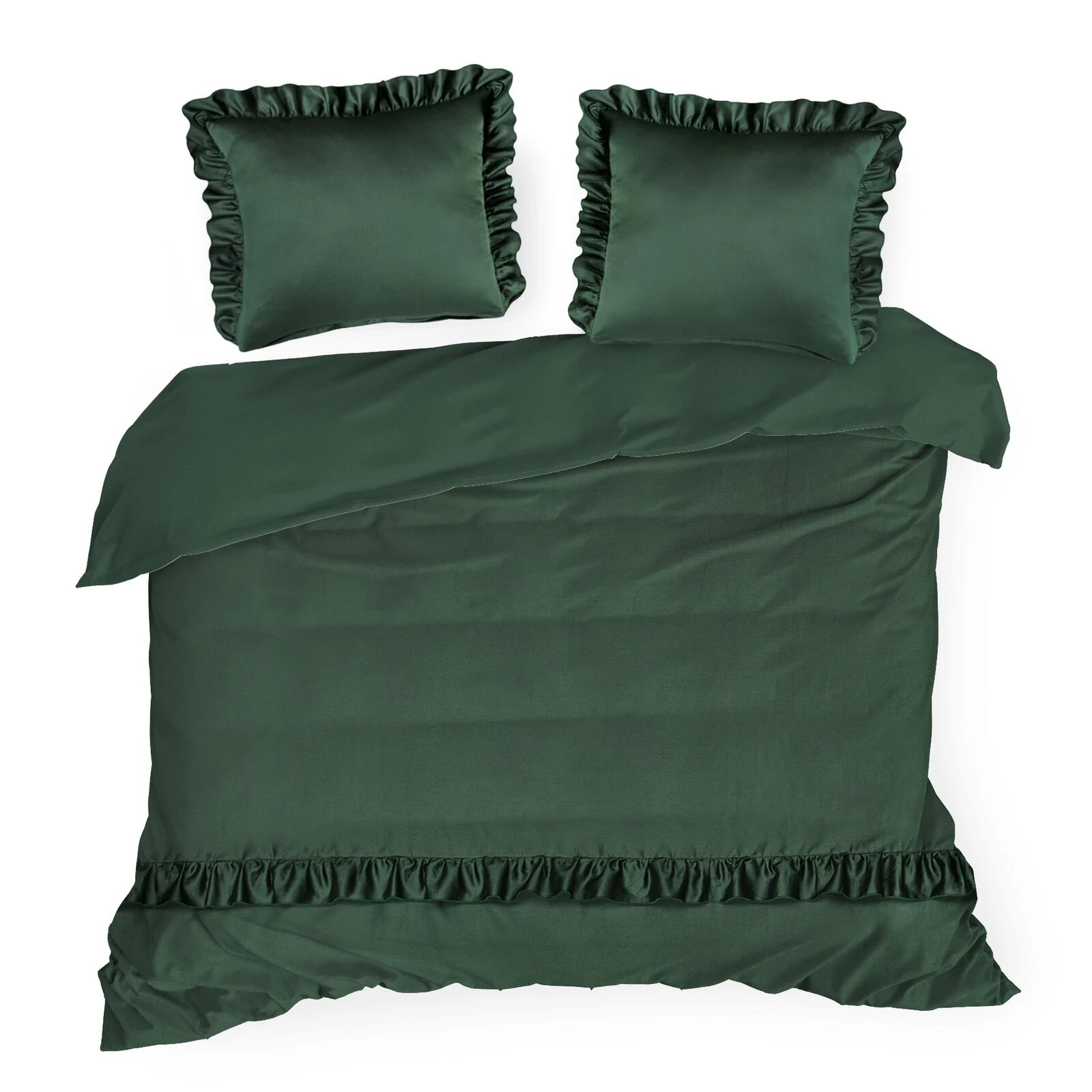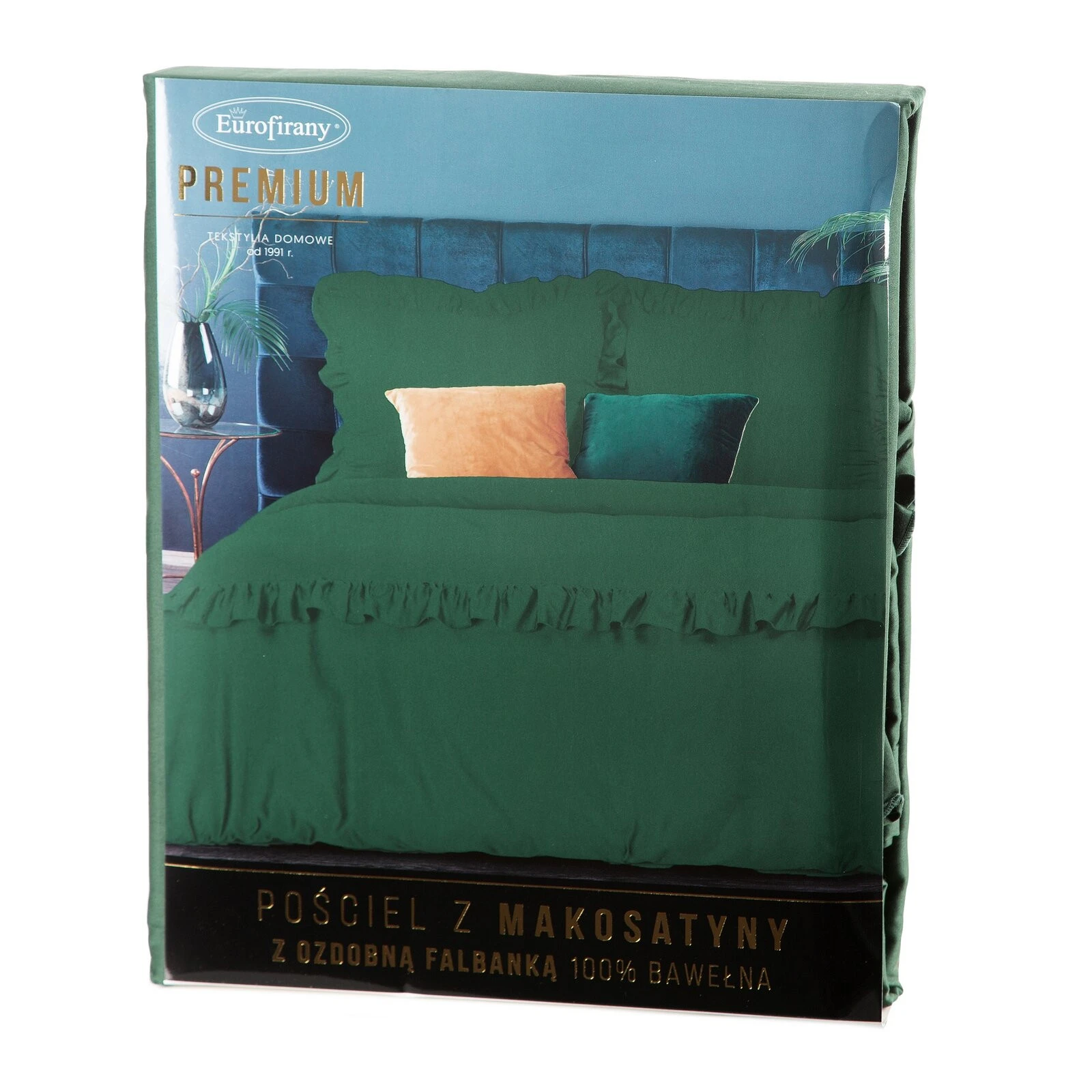 Pościel z makosatyny bawełnianej z falbanką szerokość: 160 cm, długość: 200 cm, kolor: butelkowy zielony, Gramatura: 125 GSM, Skład: makosatyna, 100% bawełna