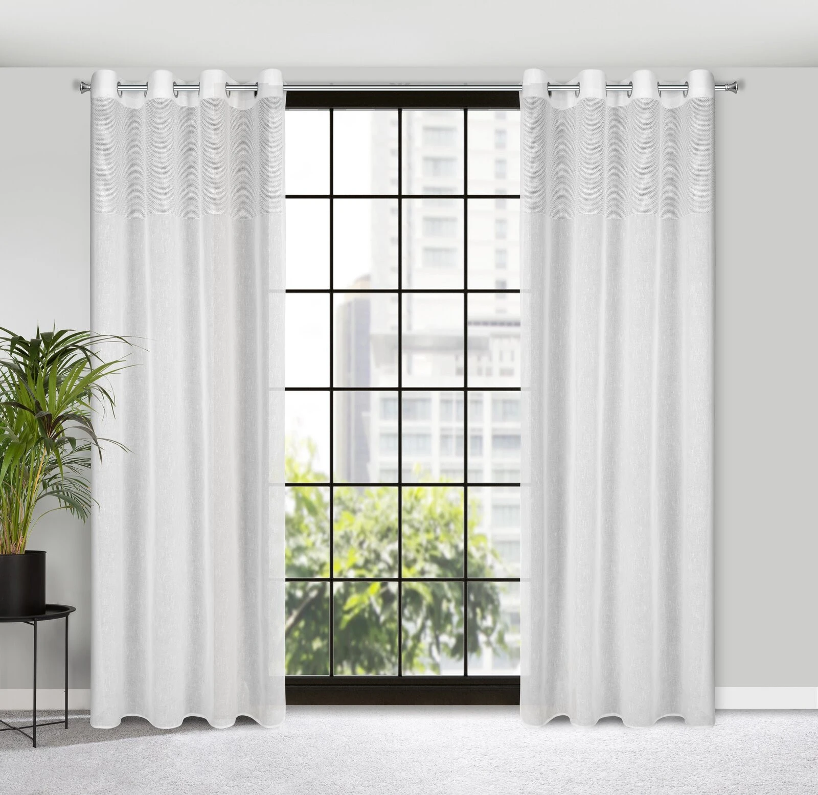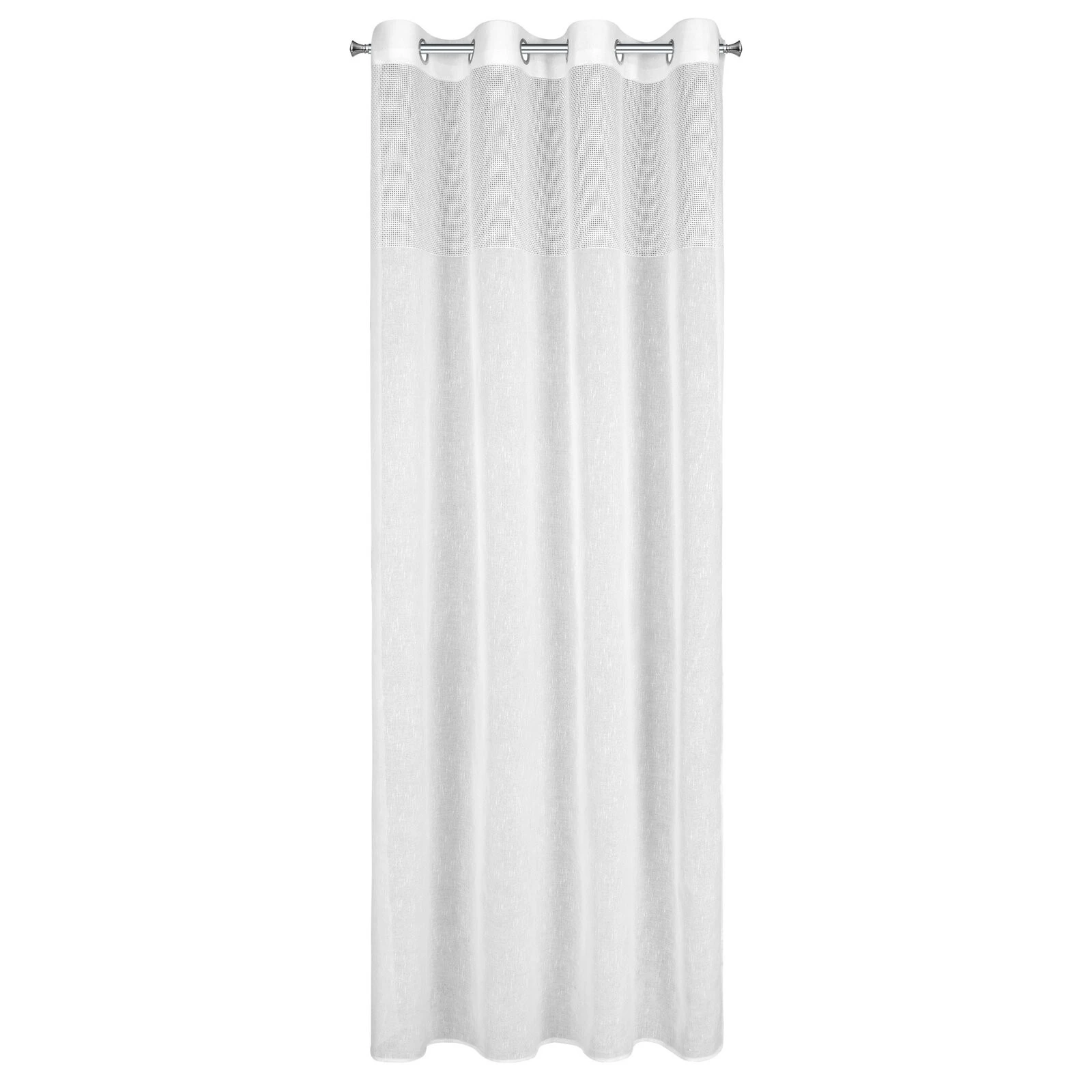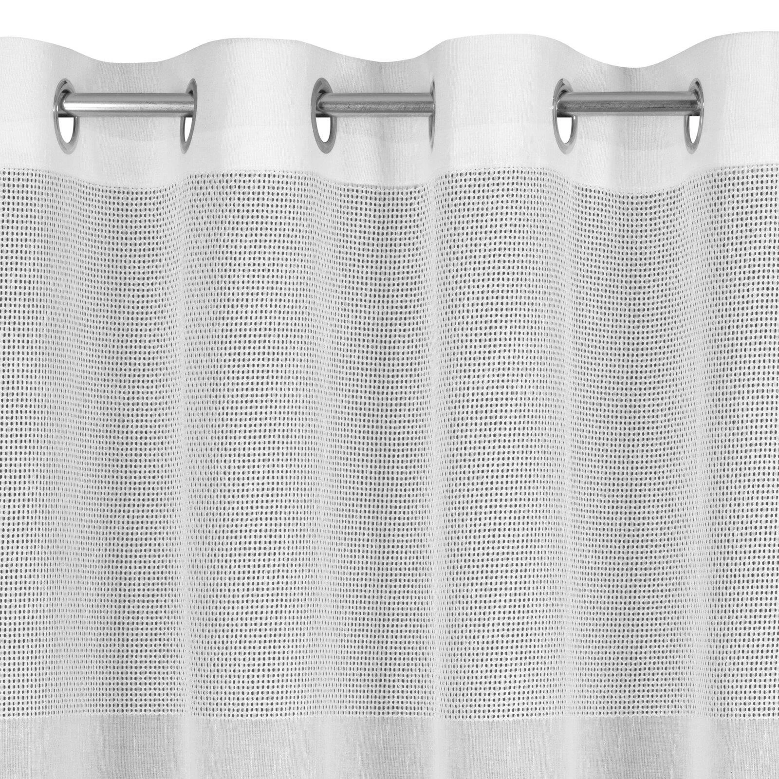 Firana gotowa zdobiona pasem tkaniny z siatki szerokość: 140 cm, długość: 250 cm, kolor: biały, Gramatura: 115 GSM, Skład: 100% poliester