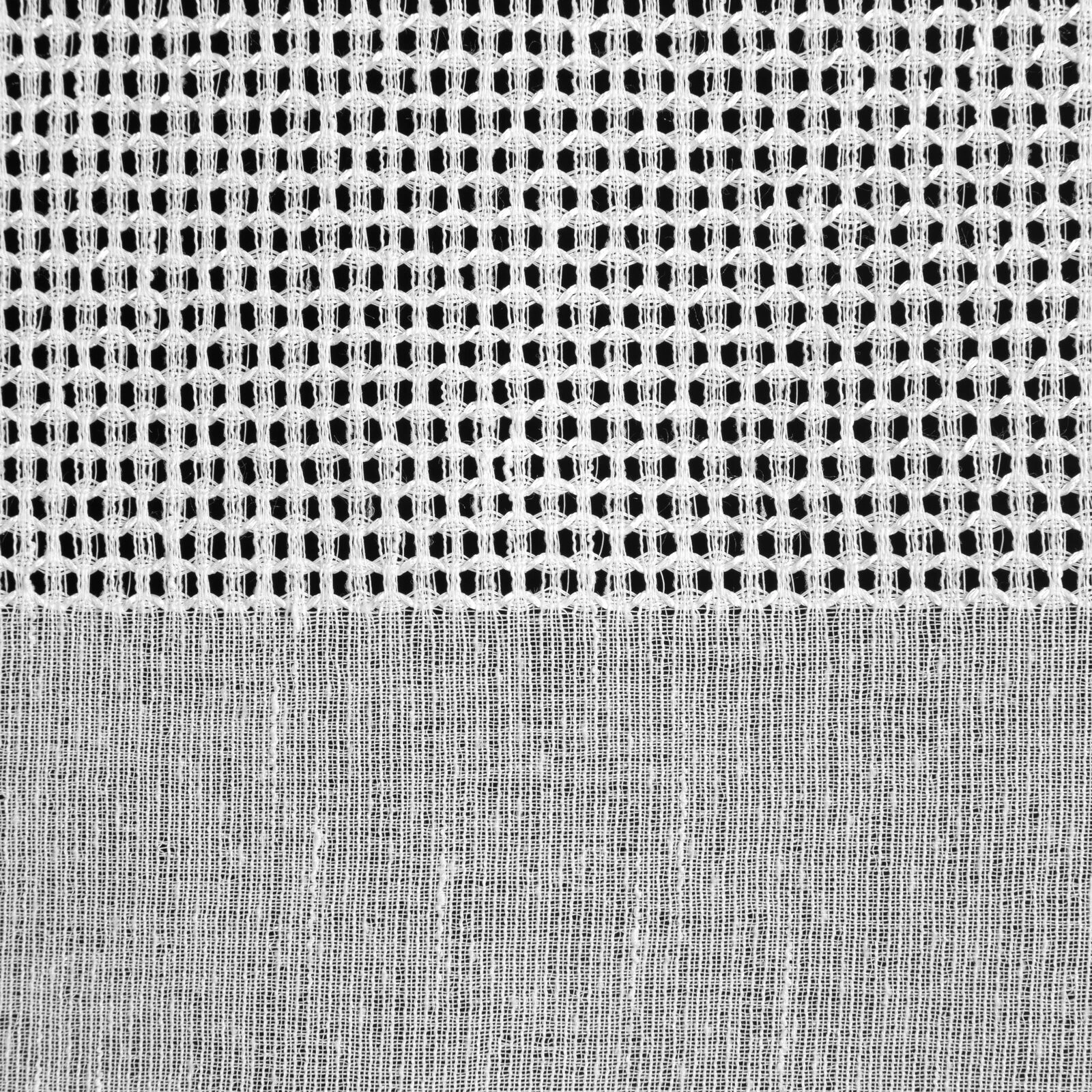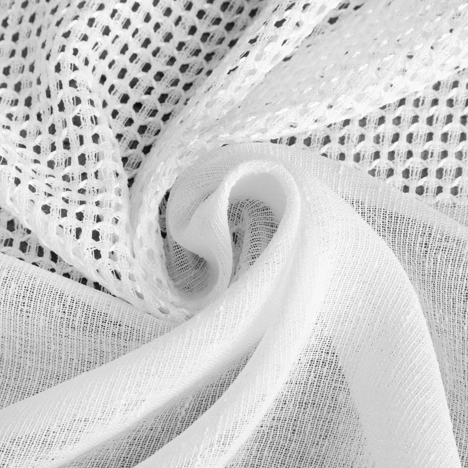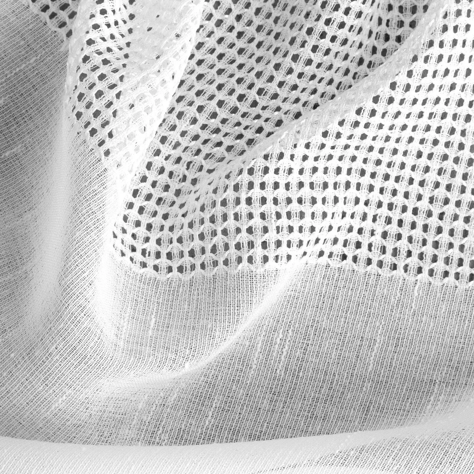 - Firana gotowa zdobiona pasem tkaniny z siatki szerokość: 140 cm, długość: 250 cm, kolor: biały, Gramatura: 115 GSM, Skład: 100% poliester