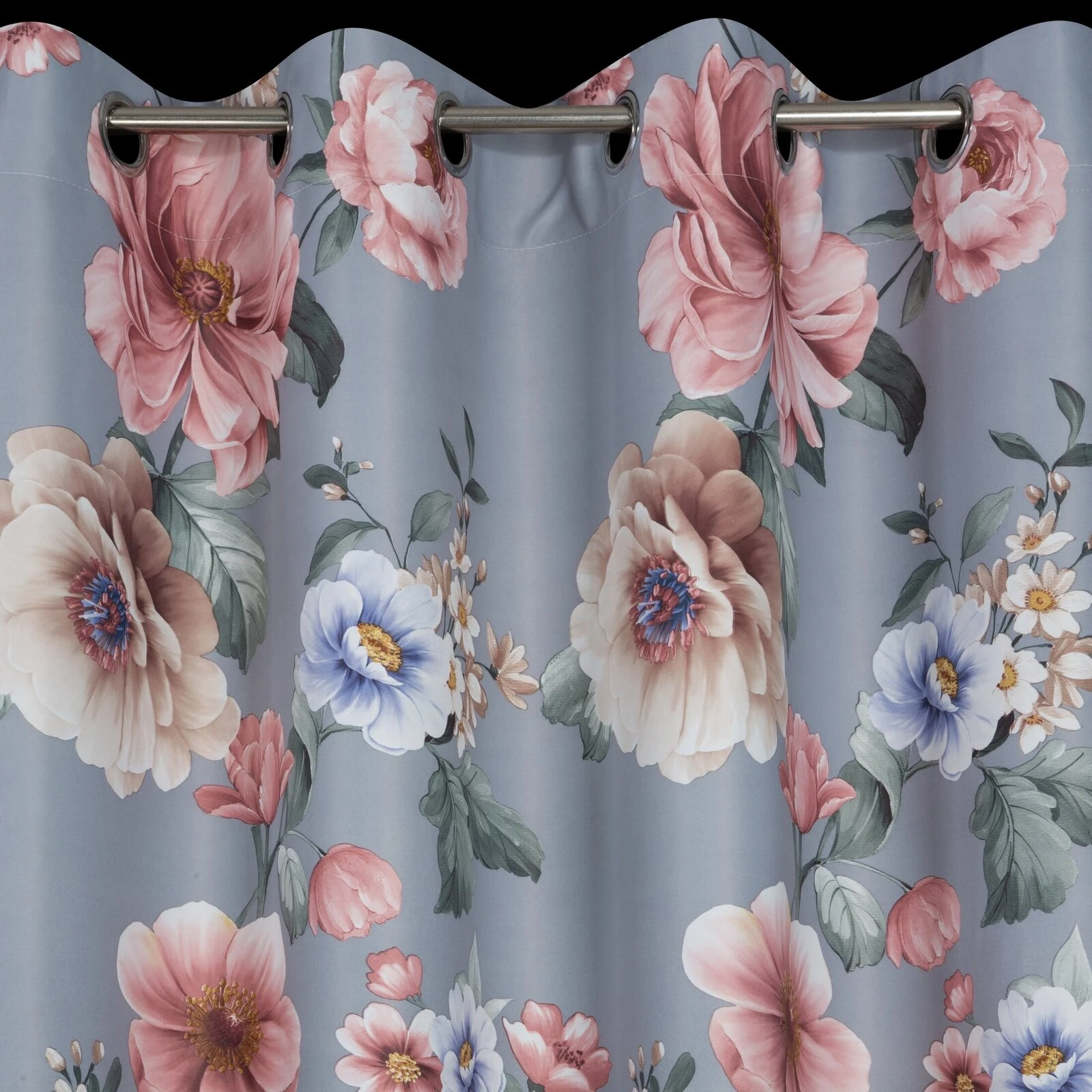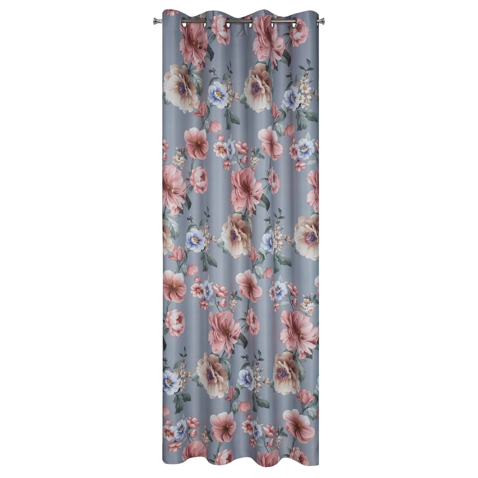 Zasłona gotowa zaciemniająca z motywem kwiatów szerokość: 140 cm, długość: 250 cm, kolor: szary, Gramatura: 210 GSM, Skład: 100% poliester