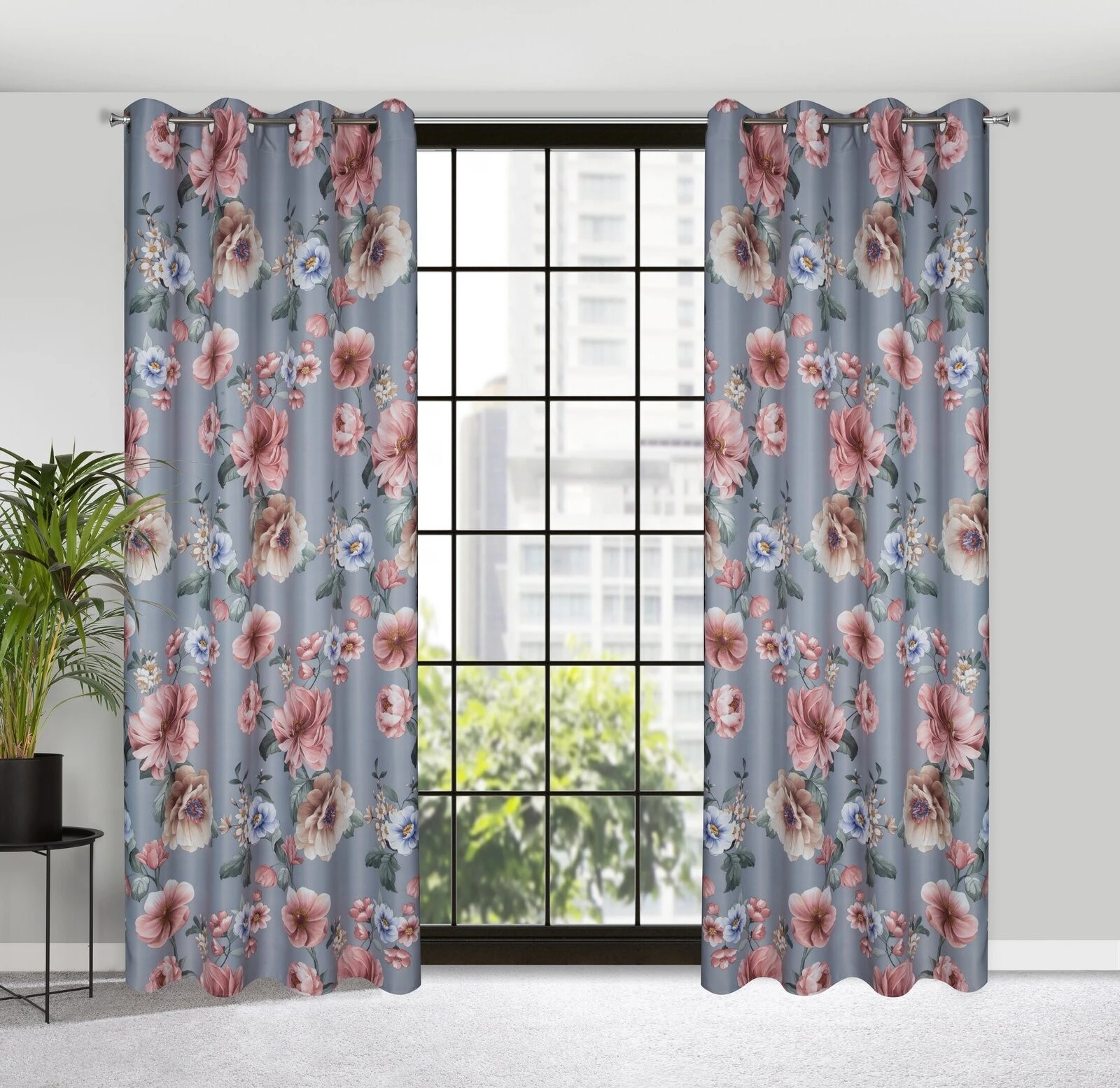 - Zasłona gotowa zaciemniająca z motywem kwiatów szerokość: 140 cm, długość: 250 cm, kolor: szary, Gramatura: 210 GSM, Skład: 100% poliester